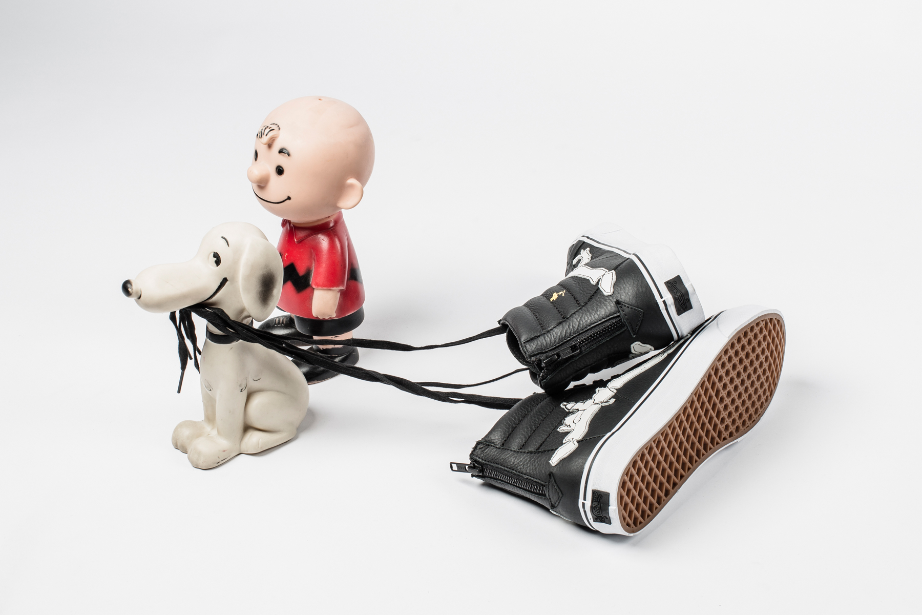 “Southern California-based boutique Blends celebrates 67 years of Snoopy & The Gang with a special three-way collaboration in partnership with Vans Vault and PEANUTS by Charles Schulz. This very special Sk8-Hi Reissue Zip features a Black tumbled leather upper accented by a White tumbled leather “Bone Jazz-Stripe” with Schulz’s Iconic Snoopy character laying at the apex of the bone. Designed to emulate Schulz’ raw style the Jazz-Stripe is depicted as hand drawn with the help of jagged contrast stitching. A floating Woodstock seen on the opposite side of the shoe completes the PEANUTS motif.