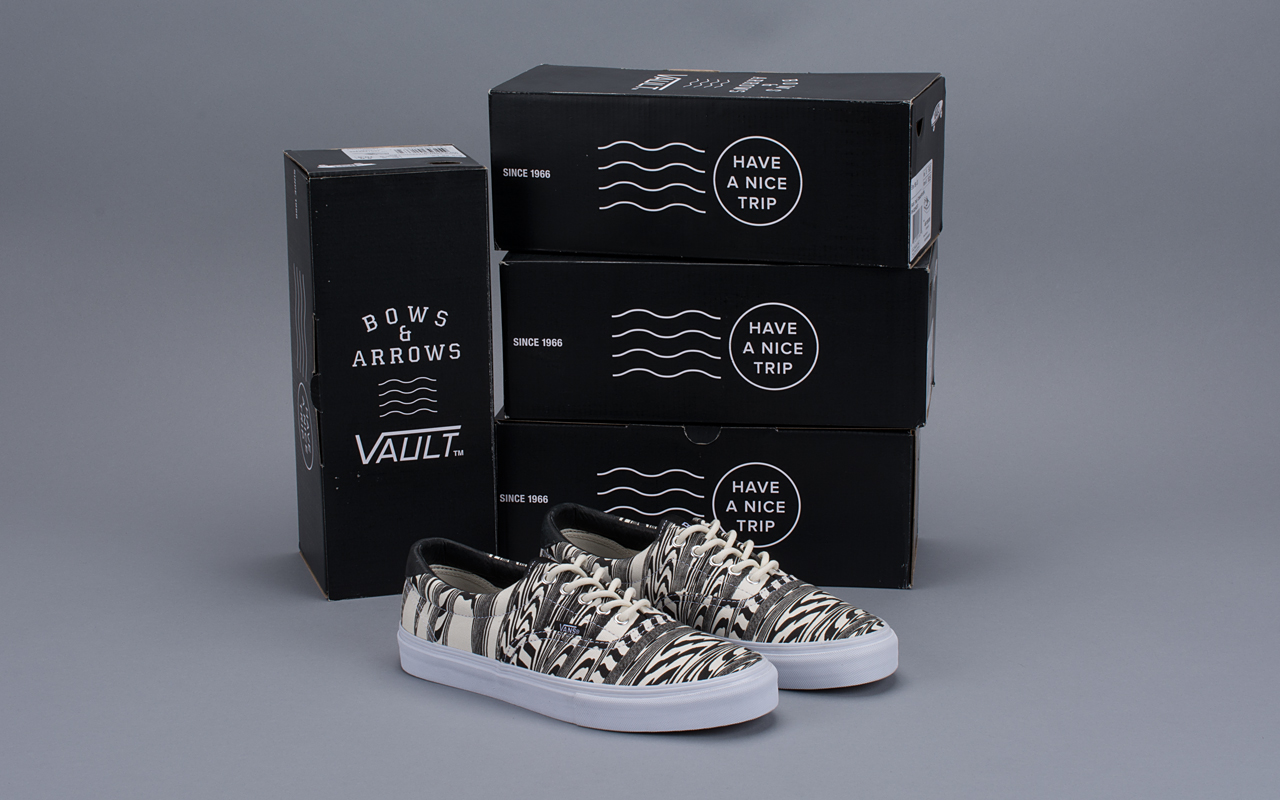 We finally have some official info regarding the Vans Vault x Bows & Arrows Era 59 LX. They are being dubbed the “Acid Test”, inspired by the shops location on Telegraph Avenue in Berkeley, CA, which has had a long standing reputation as a hub for people seeking mind expansion through nontraditional means. Far out man! The Era features a custom print on a heavyweight 10oz off-white canvas, with a woven custom label on the tongue, and a soft leather lined collar and heel tab. They’re finished off with a custom designed box, which I feel every collaboration effort should have. These are releasing exclusively at Bows & Arrows, in-store and online, Saturday December 28th.