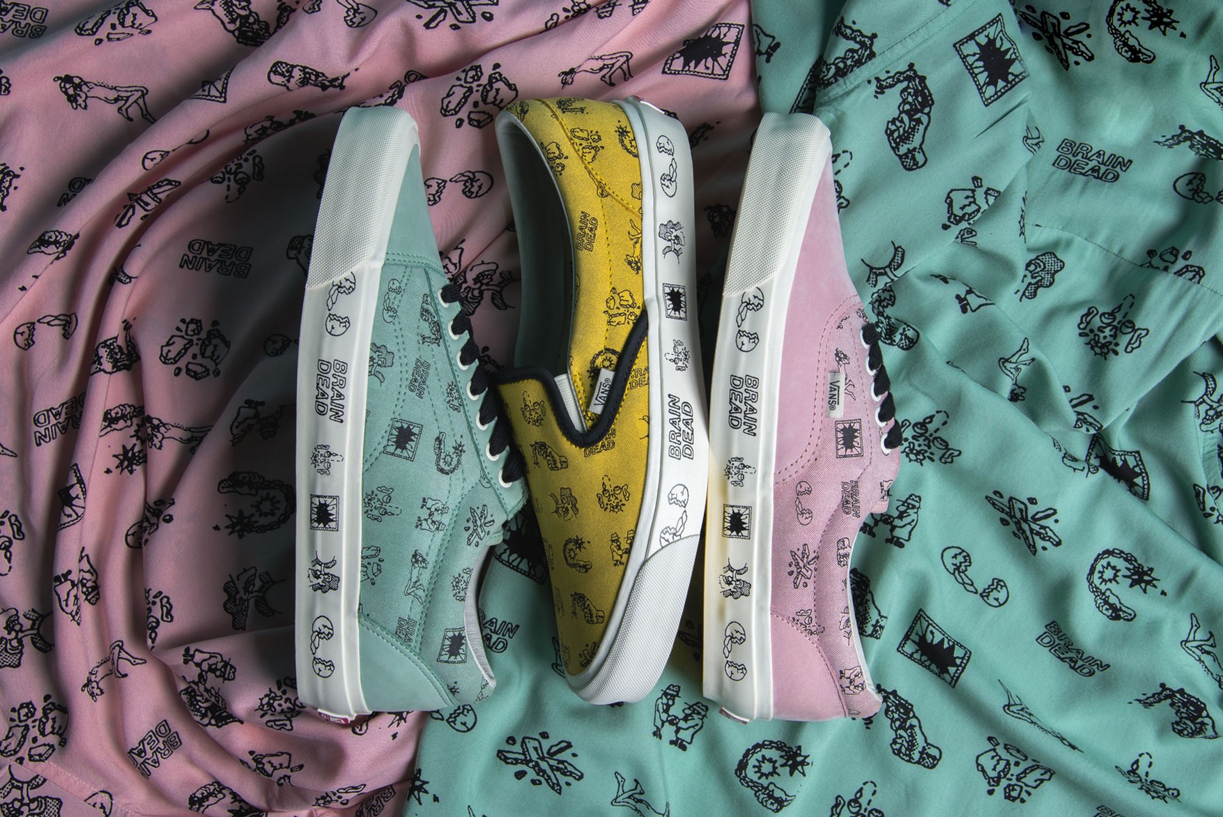 Founded by Kyle Ng and Ed Davis, Brain Dead has quickly emerged into the coveted upper echelon of streetwear fashion, describing itself as “not one person, nor is it one idea; it sits in the space between people.” This mentality is prominent throughout the collection, emphasizing a disruptive aesthetic across Vans classics that feature symbolic post-punk references, underground comics and skateboarding subcultures.