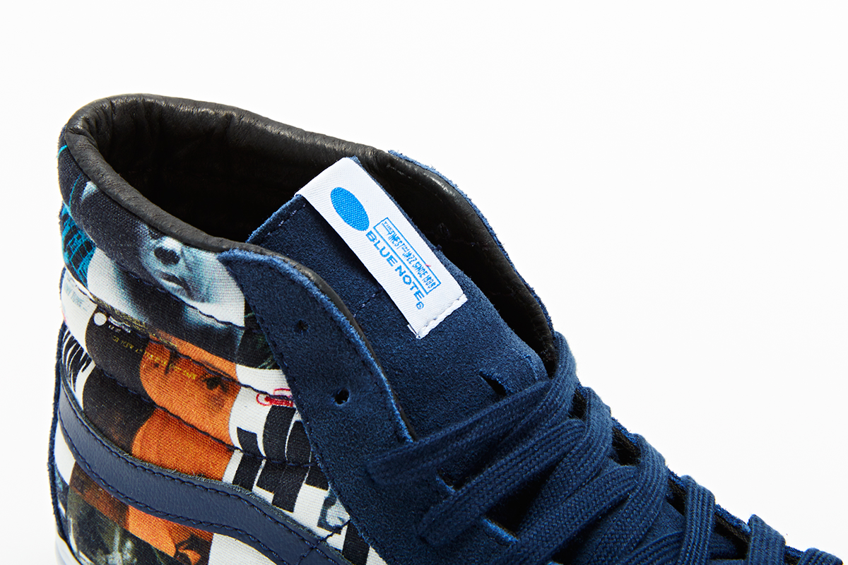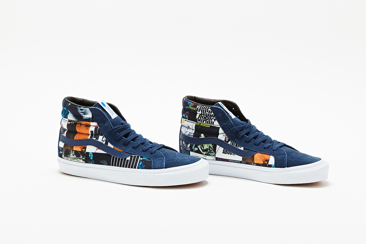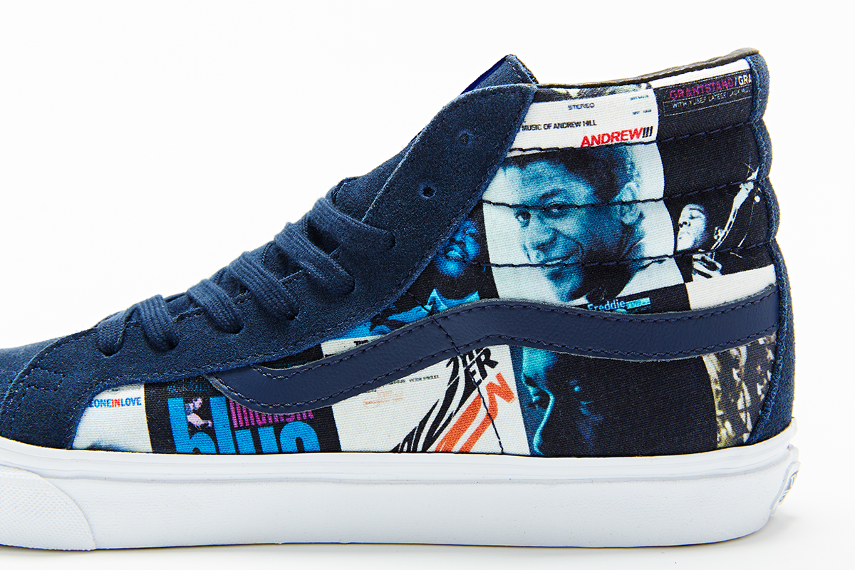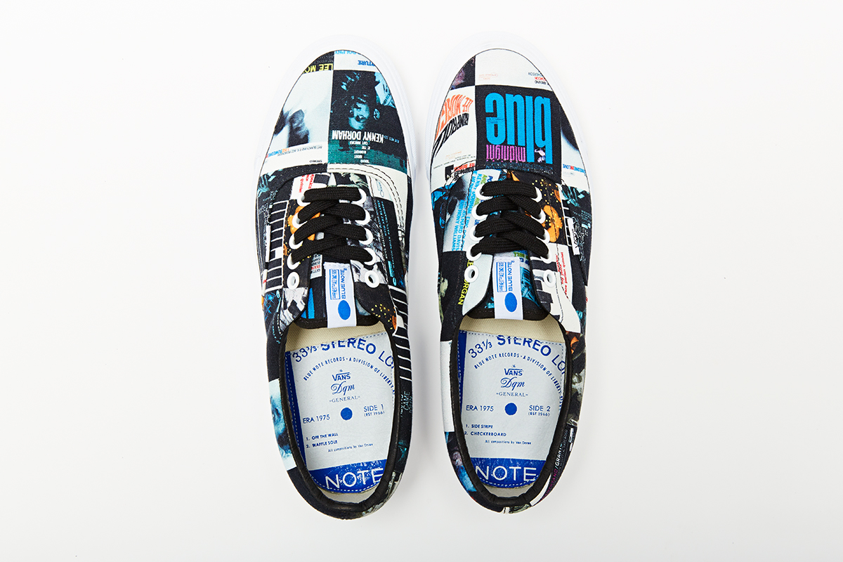 The shoes are constructed in 6oz canvas printed with a full color collage featuring authentic cover art from Blue Note’s epic catalog. The Sk8-Hi LX’s have blue suede detailing and the Era LX’s are finished with black laces through white metal eyelets; both styles have a true white vulc midsole, classic waffle sole and feature DQM labeling at the heel and insole.