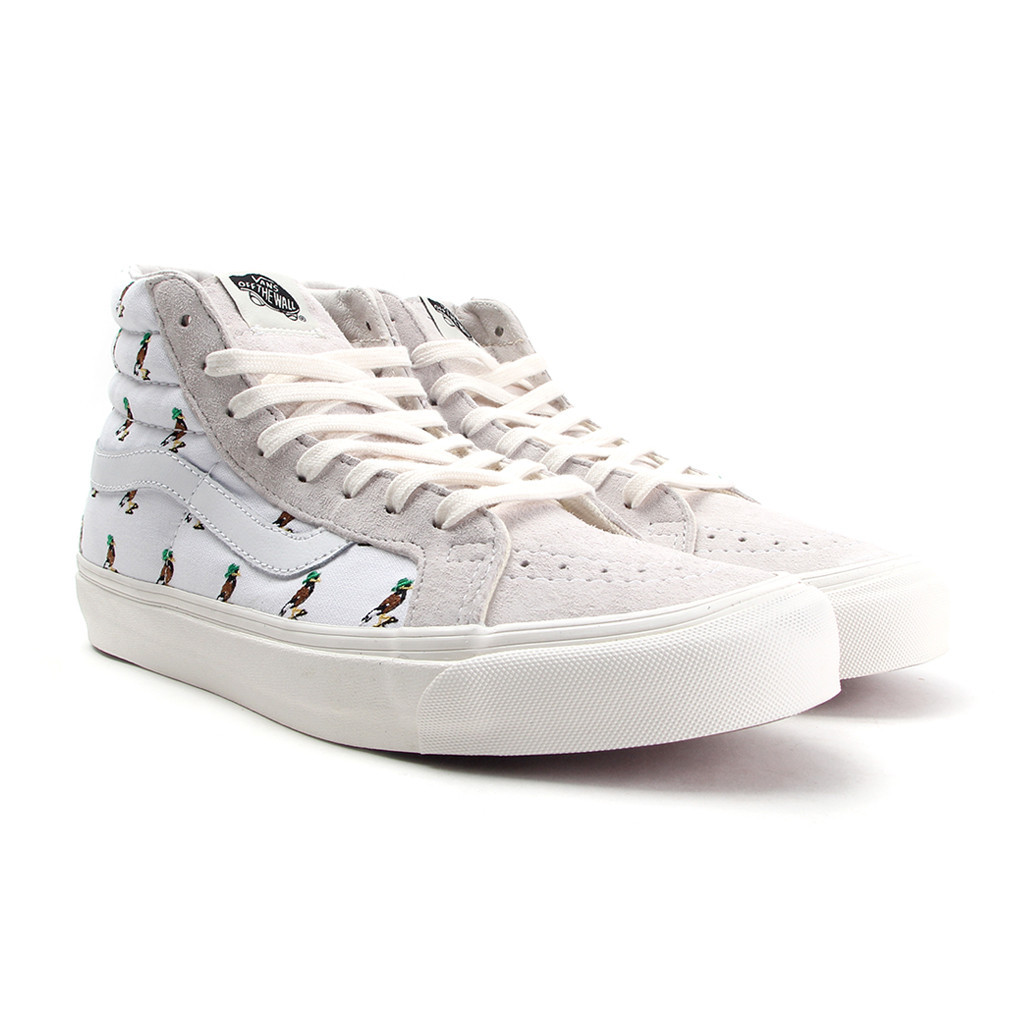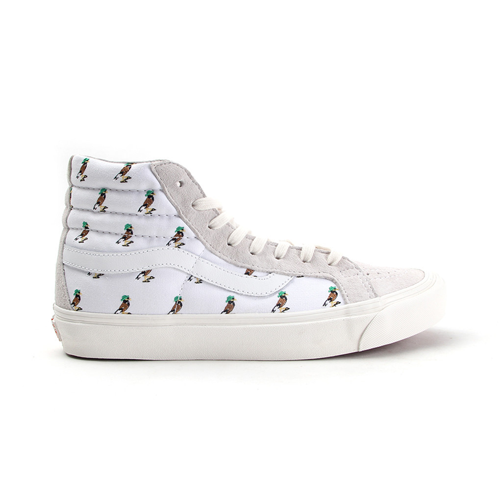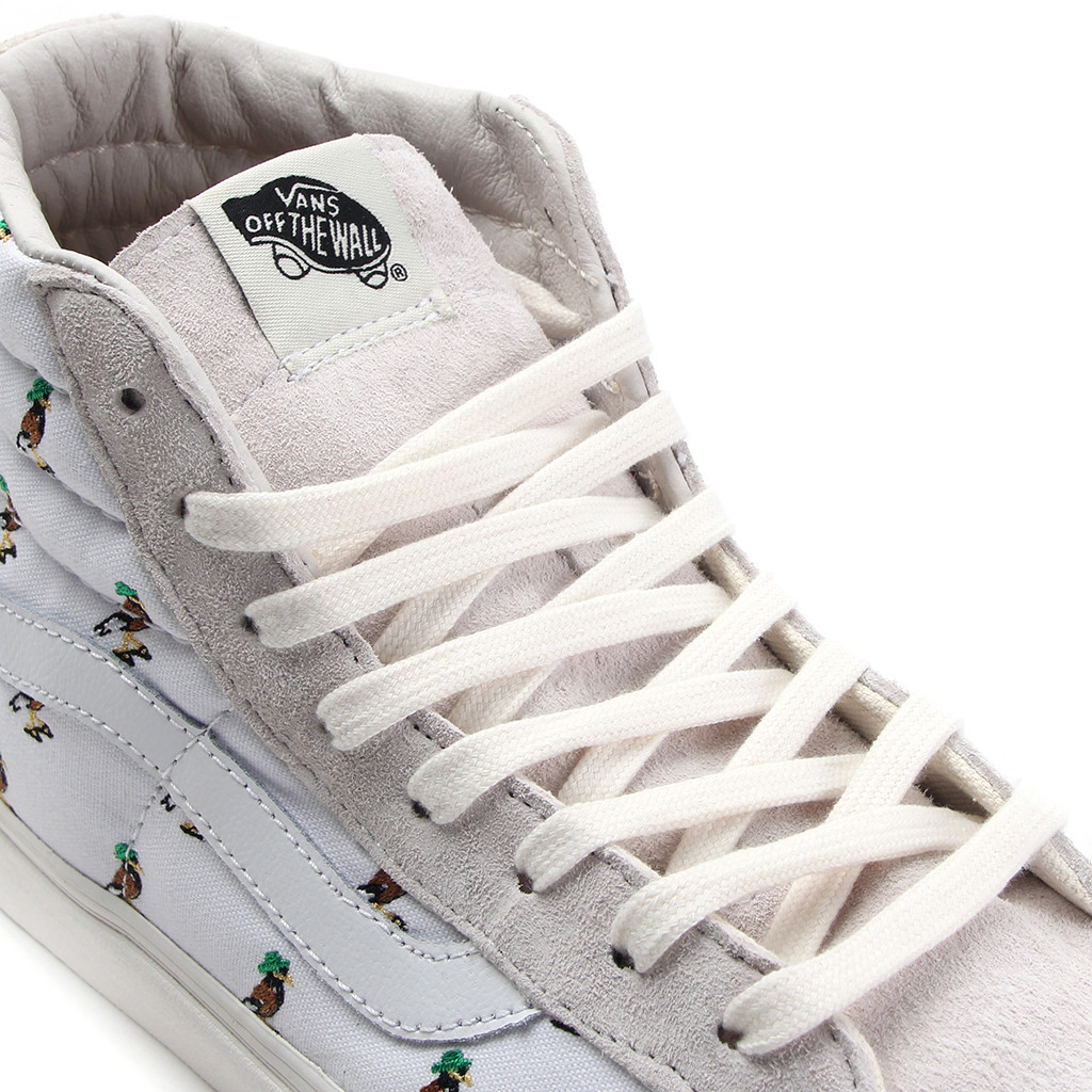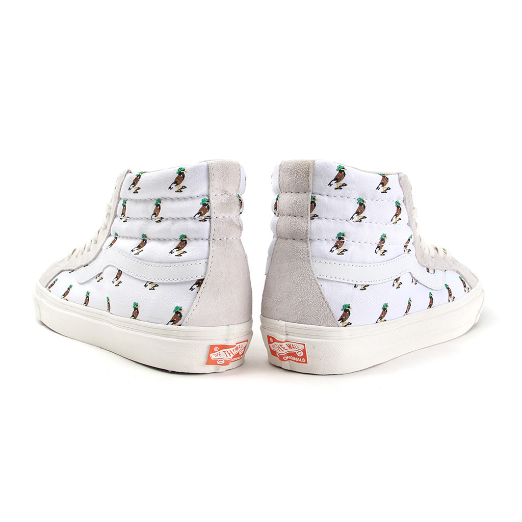 “We saw this project as an opportunity to continue the journey of our Mynah Bird mascot (which was born from our Stussy x KICKS/HI collaboration this past summer 2014). This KICKS/HI x Vans Vault collaboration tells a main “old school to new school” story which begins with the “old school” OG SK8-HI LX, utilizing the original SK8-HI silhouette, done up in: a 6oz canvas upper with embroidered Mynah Bird pattern, leather Vans wave logo that breaks the upper, and pigskin collar lining. The idea was to use a mix of classic, Vans materials that felt premium all together.