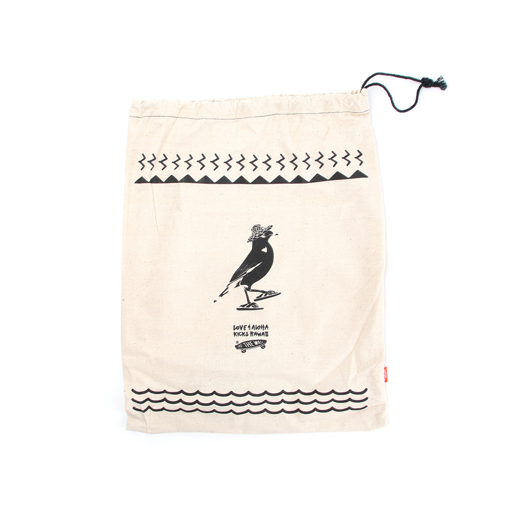 The canvas dustbag is a nod to our previous “Mauka/Makai” collaboration between Vans Vault x KICKS/HI x Sig Zane. The petroglyph expressions of birds and mountains on the top of the dustbag graphic is representative of “Mauka”, and the waves communicate “Makai” – all coming together, full circle… everything that is old is new again.