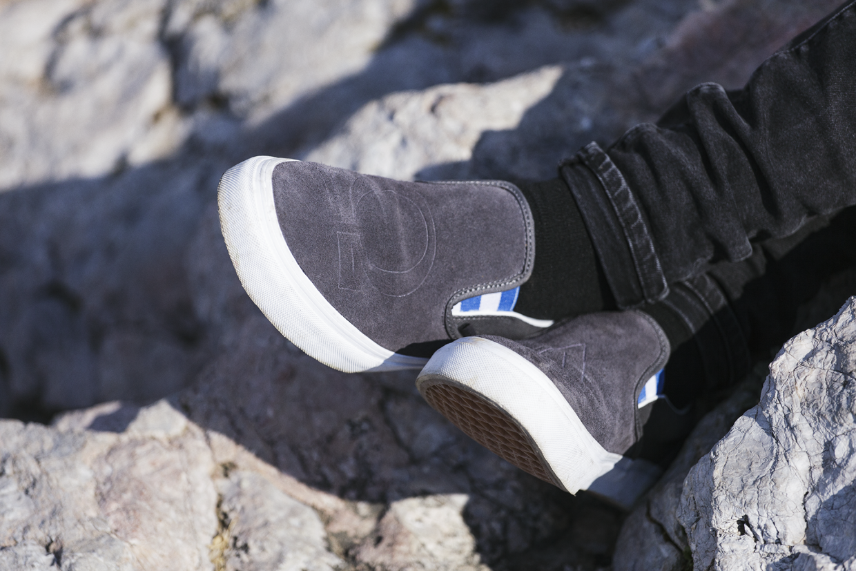 “The letters AΩ have great significance in Greek culture, and symbolize that every story has a beginning and an end. With OFF THE HOOK celebrating its 15 year anniversary, the AΩ Project serves as a way to examine the shop’s roots and its history over the last decade and a half. Thus, the AΩ Slip-On LX touches on both the Greek roots of OFF THE HOOK’s founders, and its history within Montreal’s streetwear scene. The letter A is lightly embossed on the top of the right shoe, while the left shoe carries an embossed Ω. Further tying together the joint heritage in Greece and Quebec is the colour-scheme, which features grey suede and blue stripes, with grey symbolizing a solid foundation as it’s a classic colour that can be worn season after season and blue stripes representing both Greece and Quebec”.