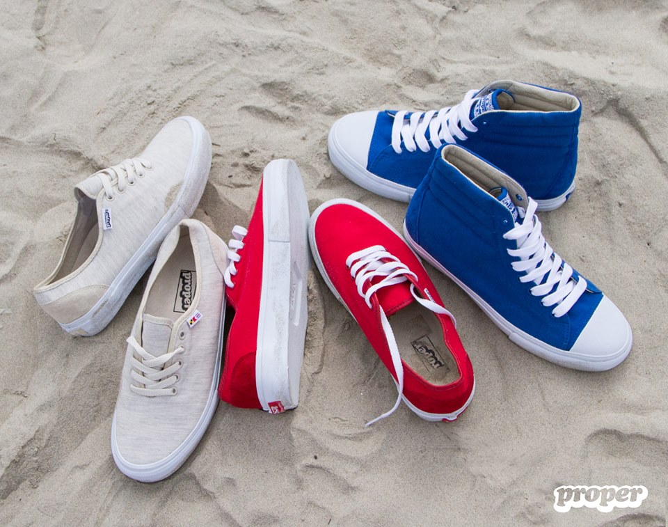 Long Beach’s premier sneaker boutique, Proper, recently discovered some back stock of their Vans Vault collab from 2008, centered around a unique nautical theme, but releasing in the Winter, with the understanding that most sneakerheads buy their kicks and let them sit on ice for awhile before breaking them out. At the time, this pack was trend-setting. They pretty much created the Chukka Del Barco, which became very successful for a few years, making it’s way through the Vault, Cali, and GR lines. The Native American was also a pretty much unheard-of model, except for those in the Vintage Vans world. The one-piece Authentic was also a first of it’s kind, which just goes to show the level of detail and creativity that Proper had. Keep in mind, their prior collab were the satin Sk8-Hi pack, which was also untouched at the time. While this re-release doesn’t include every model from the set, both one-piece Authentic LX’s, and the blue Native American LX are available in a variety of sizes from Mens 4-13. Don’t sleep! Head on over to Proper’s webstore to see what’s left.