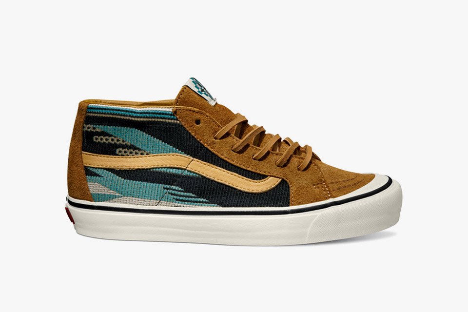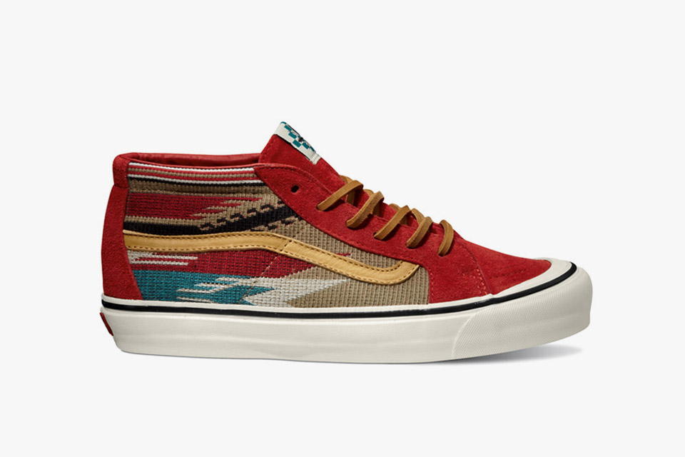 The Spring will soon be upon us, and with that comes the next seasonal offerings from Vans Vault. Our favorite designer, Taka Hayashi has created some bangers for the Spring ’14 collection, and what could be better than a light dusting of Taka flavor, on some familiar classic models? This time, Taka took the Sk8-Mid and made it his own by wrapping the shoe in premium suede, and the side panels in Chimayo fabric, named after the native Navajo and Spanish people who created these patterns, who lived in Chimayo, just north of Santa Fe, New Mexico. Other than the unique fabric choice, the foxing rubber has been given a subtle update to the toe bumper, slightly wrapping up over the front of the toe. These details on an already recognizable silhouette contribute to that “where’d you get those” factor, and will have many Vans fans hitting you up. These finish off nicely with square leather laces. Look for these to go fast, at your local Vault dealer in March, and definitely NOT ON THE VANS WEBSTORE.