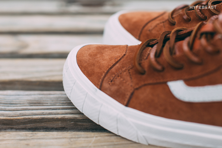 Taka Hayashi consistently delivers the most unique, and highest quality Vans in the world, and we get a glimpse at one of his latest offerings. The wildly popular TH Sk8-Mid Skool LX is back, this time constructed in a few colorways and materials, and thanks to Hypebeast, we get a detailed look at the brick suede nubuck model. The first thing to catch our eye is the woven “checkerboard” side panel, which is a nice change-up from the diamond debossed panels on the prior version. The white jazz stripe, and signature “Taka” vulcanized sole contrast nicely. These are set to arrive in March, so sit tight, and check your local Vault dealer for their drop.