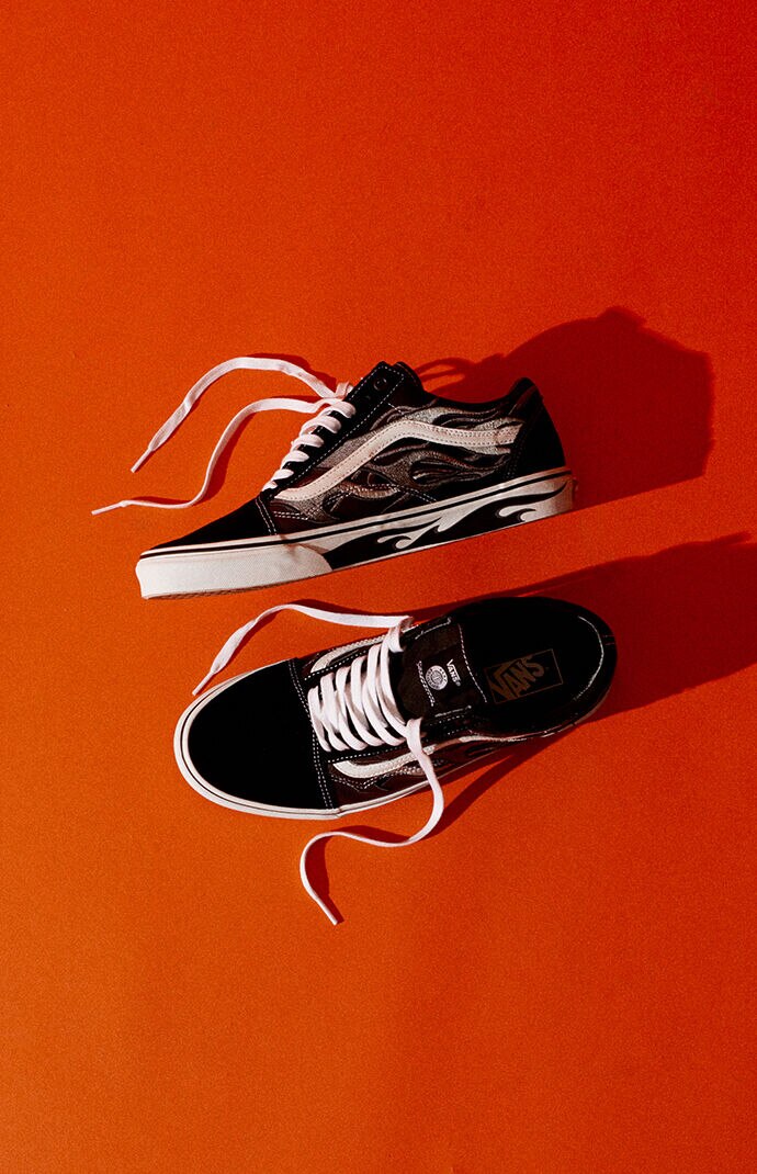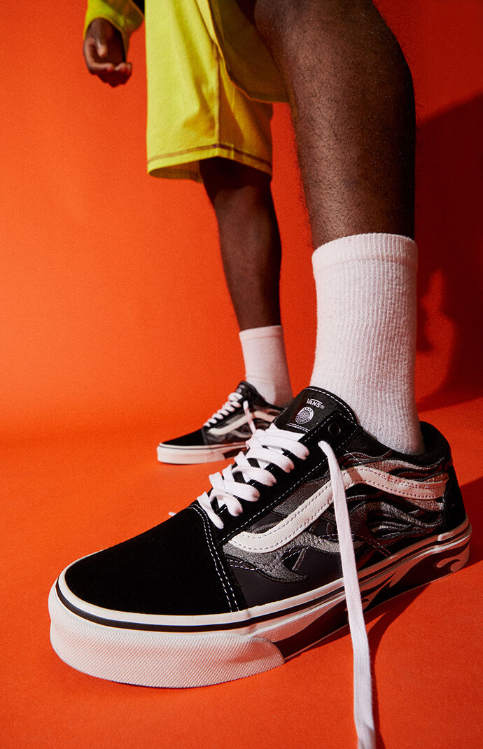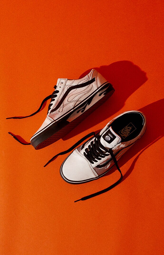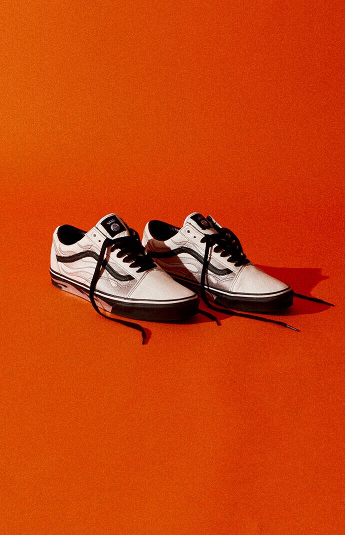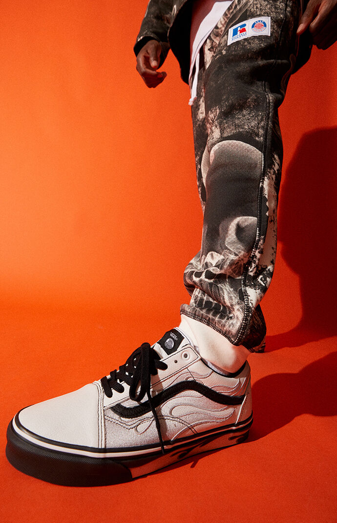 A$AP Rocky and Vans come together to bring the White Old Skool Shoes to your fire fit. The classic low-profile shoes get updated with contrast stitching and flame details at the sides and sole. It keeps the iconic Vans contrast stripe with the signature rubber waffle outsole. Available now, exclusively from Pac Sun.