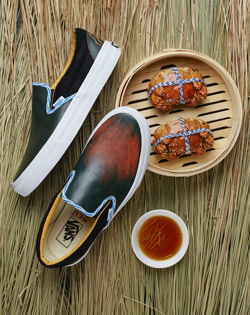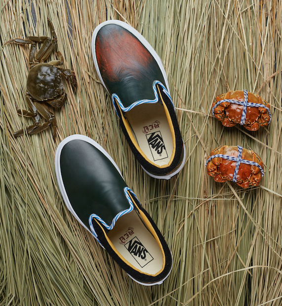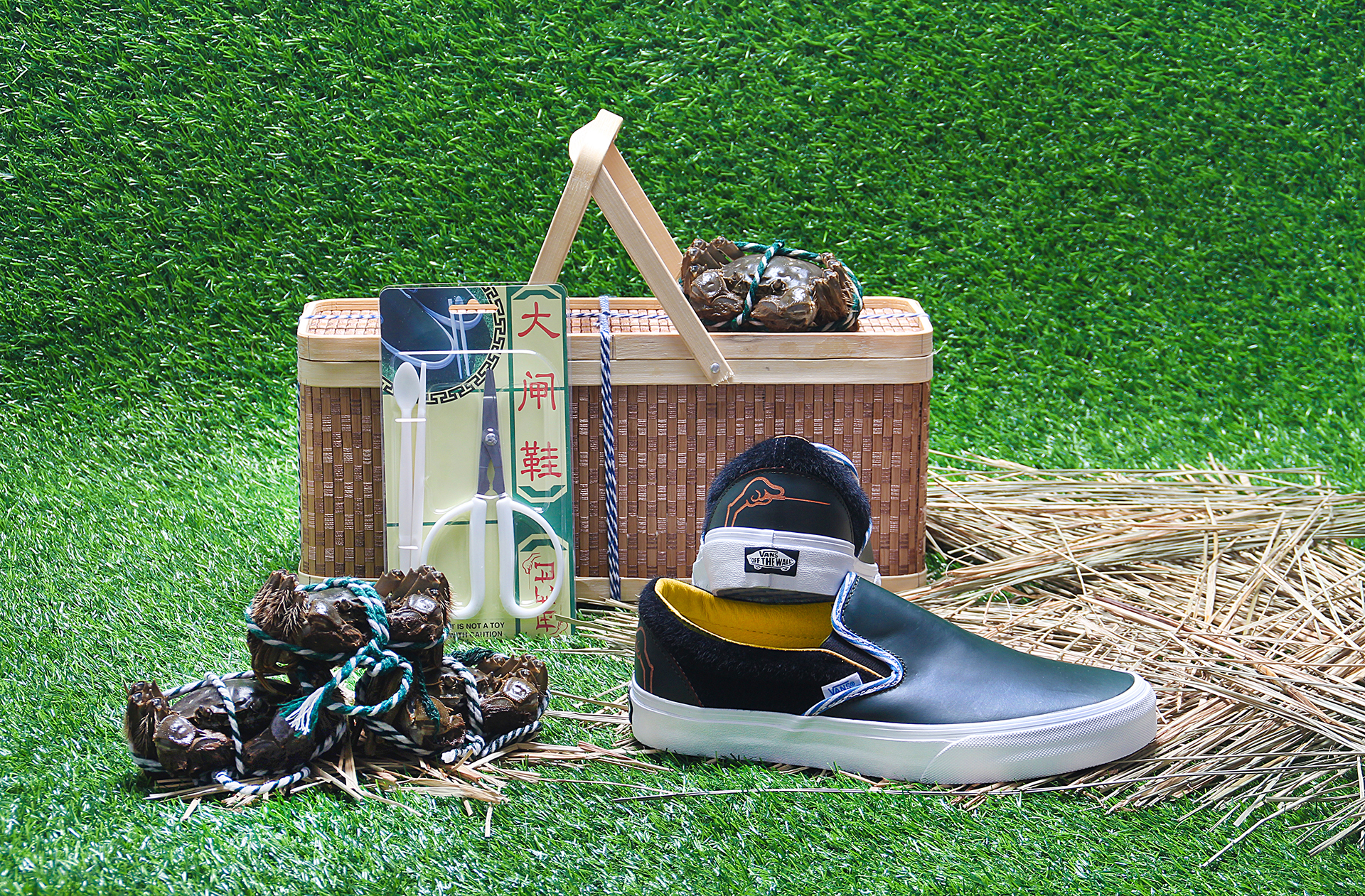 “ACU has long been one of Shanghai’s go-to sneaker spots, so when it came time for the boutique to collaborate with Vans on a pair of limited-edition footwear, it naturally looked no further than its own stomping grounds for inspiration. A nod to Shanghai’s street culture, ACU’s take on the Classic Slip-On incorporates a number of different design cues as an homage to the the hairy crab — a winter delicacy in the Chinese city. For starters, the striped string that typically wraps the crab hits the shoe in the form of the design’s piping and outsole while a fuzzy hair-like textile wraps around the collar of the shoe. The highlight, though, is the shoe’s double layer of color — a dark green exterior (raw crab) hides a bright orange (cooked crab) layer underneath that becomes exposed with wear and tear over time for a truly one-of-a-kind look.”