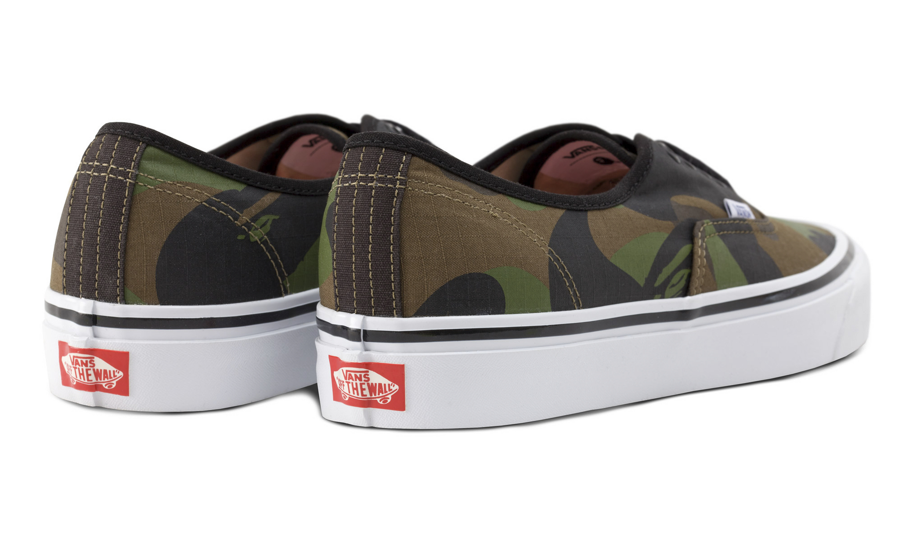 The first drop of the collection includes two of Vans’ most recognizable footwear icons – the Sk8-Hi 38 DX and the Authentic 44 DX. The Sk8-Hi 38 DX features BAPE®’s ABC camo outline, with a classic Vans black and white twist. A custom camo tongue label and statement red Waffle outsole add an elevated touch. For fans of A Bathing Ape’s iconic camo print, the Authentic 44 DX combines BAPE®’s first ever camo and Vans’ ripstop canvas for a more low-key look.
