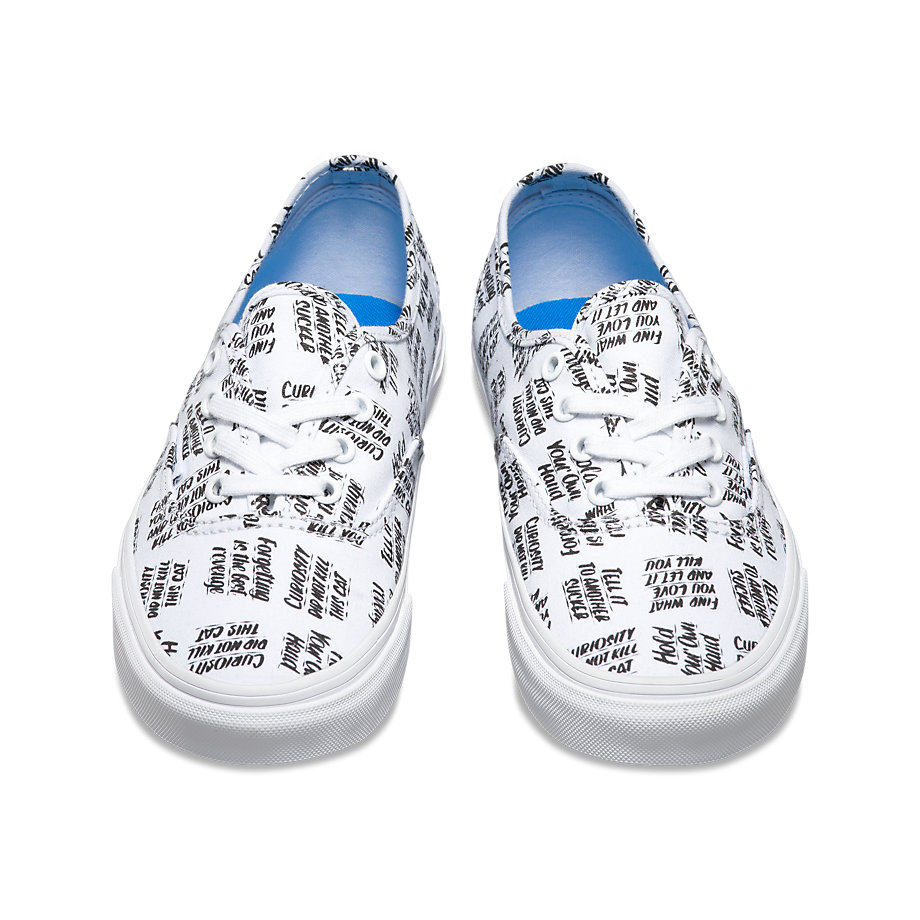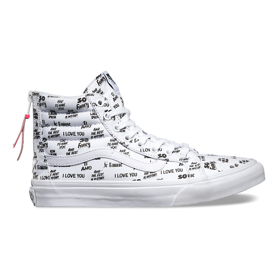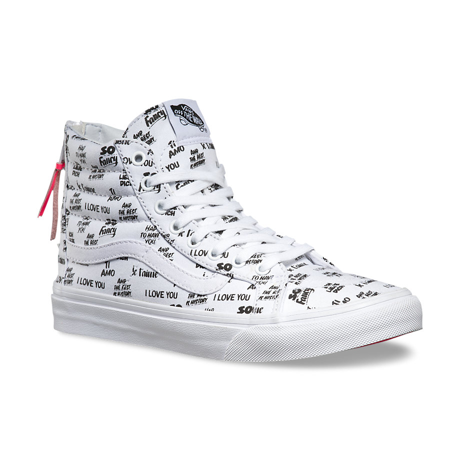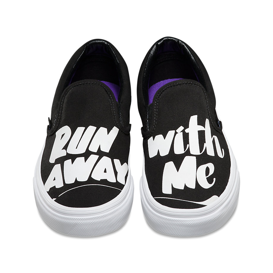 Vans NYC multi-media artist Baron Von Fancy is known for diverse artistic work that extends from large comic strip-genre paintings to playful and poetic simple statements. Bringing to mind the nostalgia of mid-century ad signage, the Baron Von Fancy collection features bold, hand-lettered phrases in a black and white capsule collection. The offering includes 3 classics, a Sk8-Hi Slim Zip, Authentic, and a Slip-On, each available in unisex sizing (up to a Men’s 10). Look for them at your local Vans store.