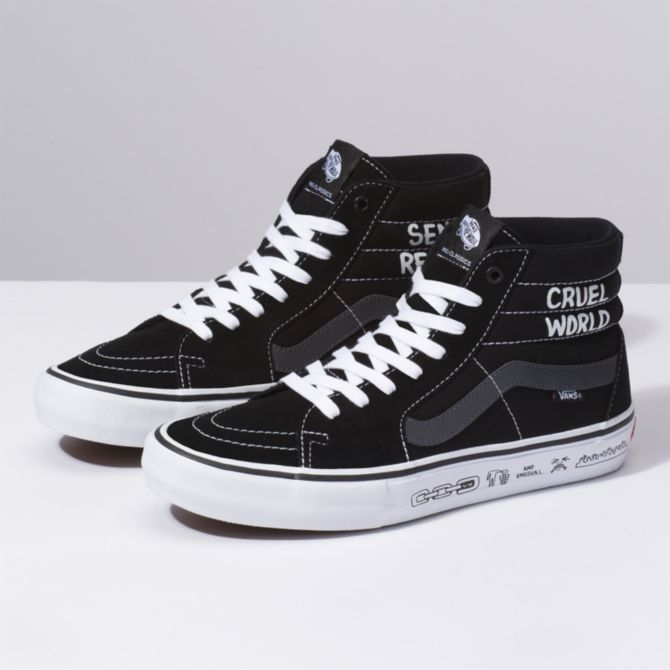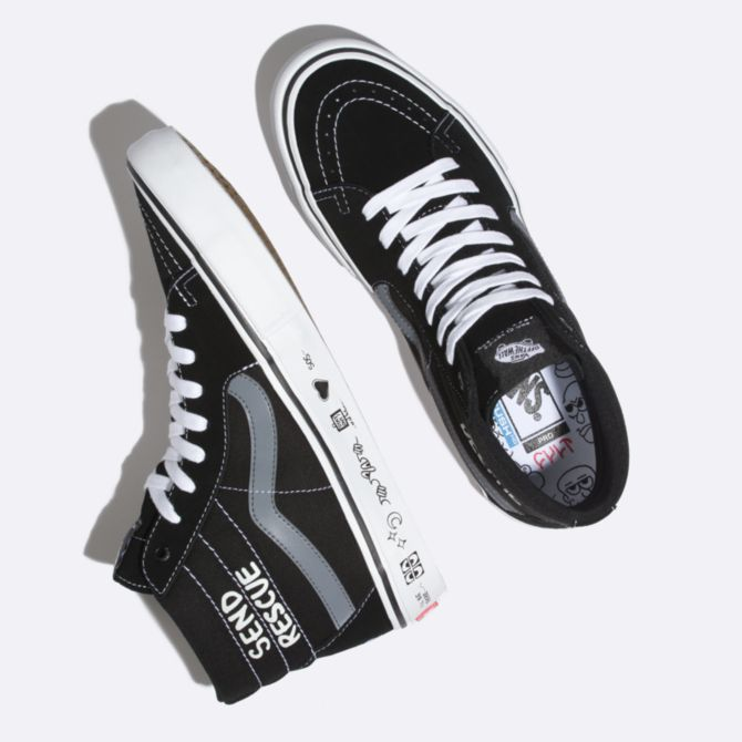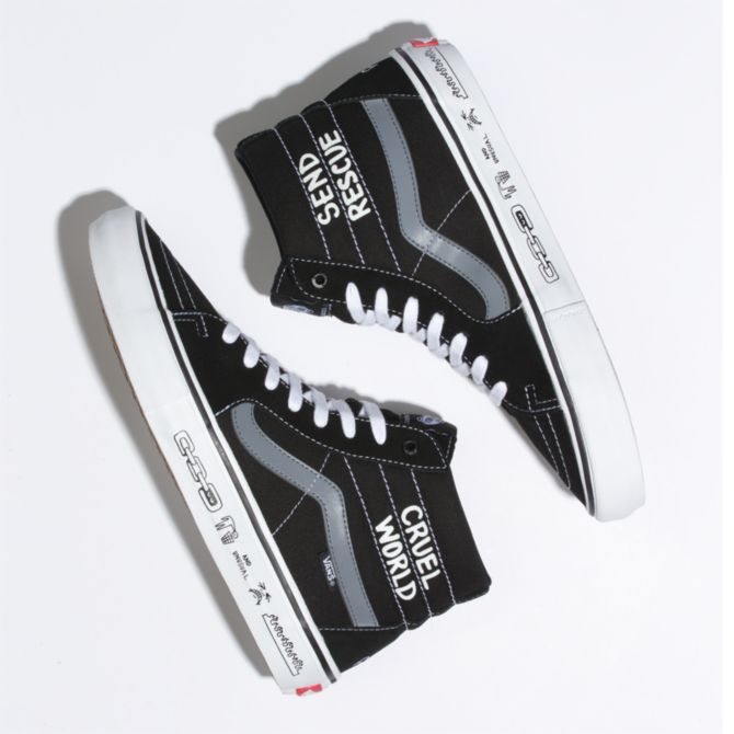 “The new Vans x CULT Collection celebrates the partnership between two like-minded brands coming together to showcase the creative lifestyle behind BMX. Adding CULTs subtle design aesthetic to our Pro Classics, the Vans x CULT Sk8-Hi Pro highlights an updated and upgraded silhouette to withstand the enhanced performance requirements of todays BMXers. The suede and heavy-duty canvas upper materials keep the design durable, while the reflective sidestripe keeps it flashy. Featuring tonal tongue and heel embroideries as well as custom screened logos on the removable UltraCush HD sockliner, the Vans x CULT Sk8-Hi also includes Pro Vulc Lite construction, DURACAP reinforcement rubber underlays in high wear areas, and Vans original waffle outsoles made of a rubber that offers grip and support.”