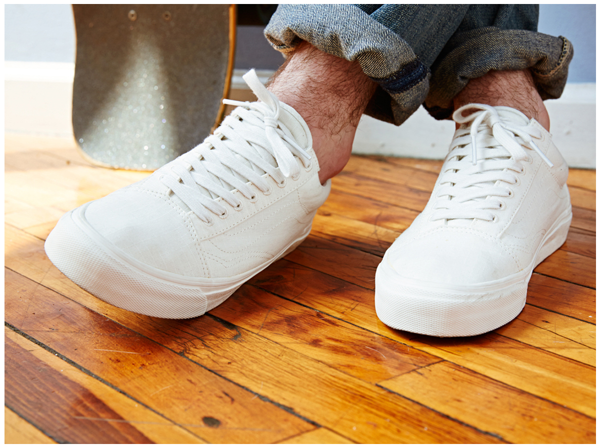 A true ‘basic’ is designed with simplicity, utility and economy in mind; a basic is something that works. Considering what the aesthetic and functional qualities of a manufactured product would be if you only had one of it, DQM has pared back Vans’ Sk8-Hi, Old Skool and Authentic styles to the very essentials. Built to be worn daily, the shoes are constructed in a light-weight cotton ripstop fabric that won’t tear, in a wear with anything white. They feature tracer cord laces that won’t break, a flexible and washable light-weight Ortholite insole, and deconstructed styling including stitched side stripes.