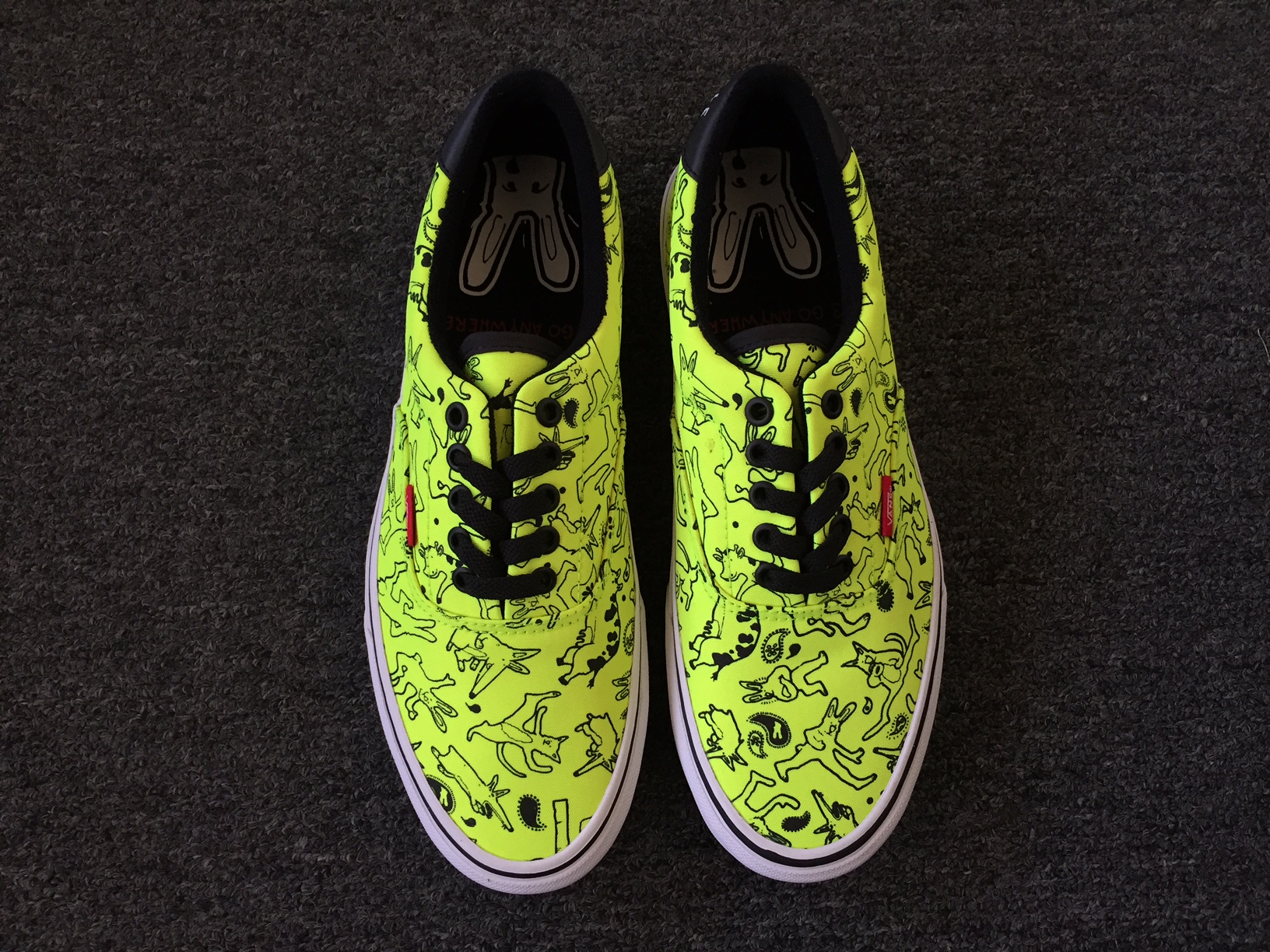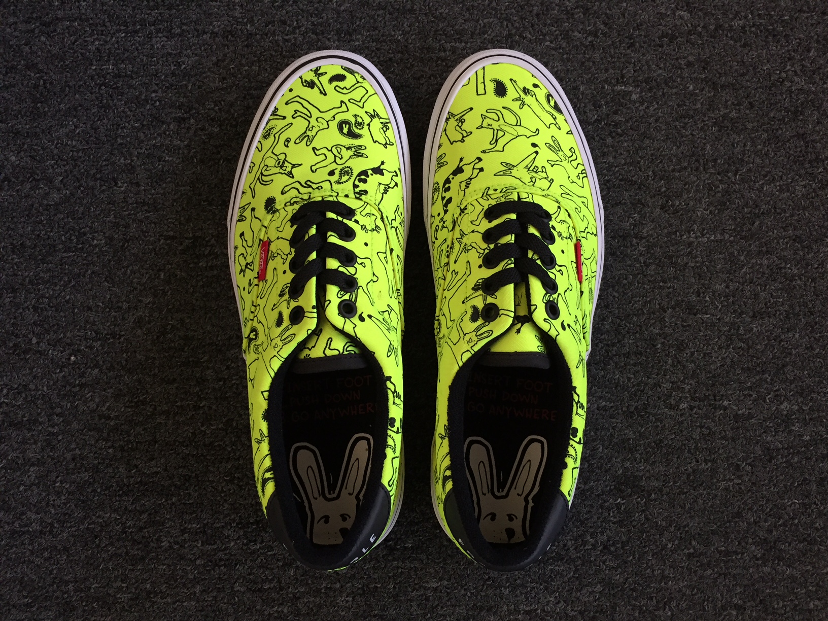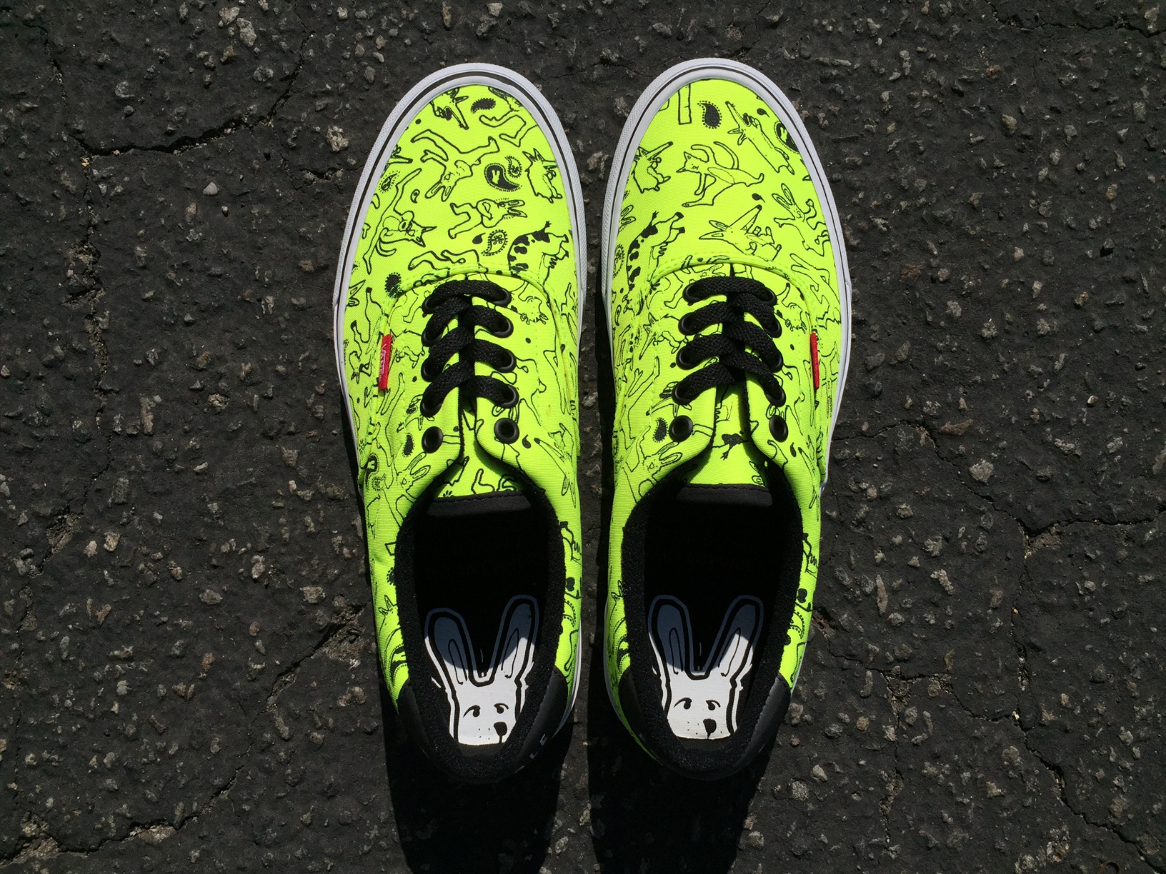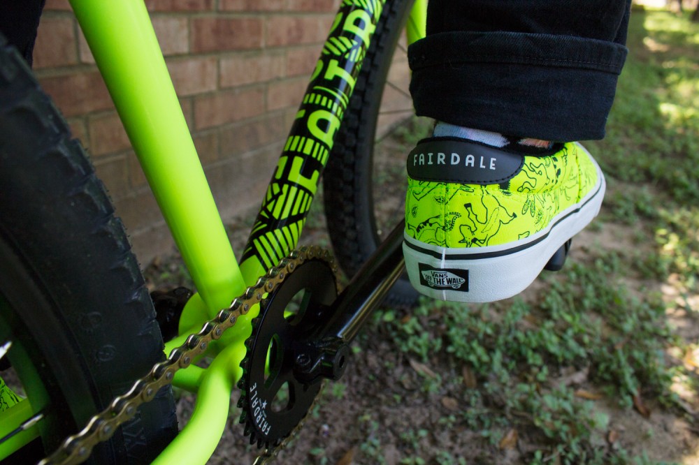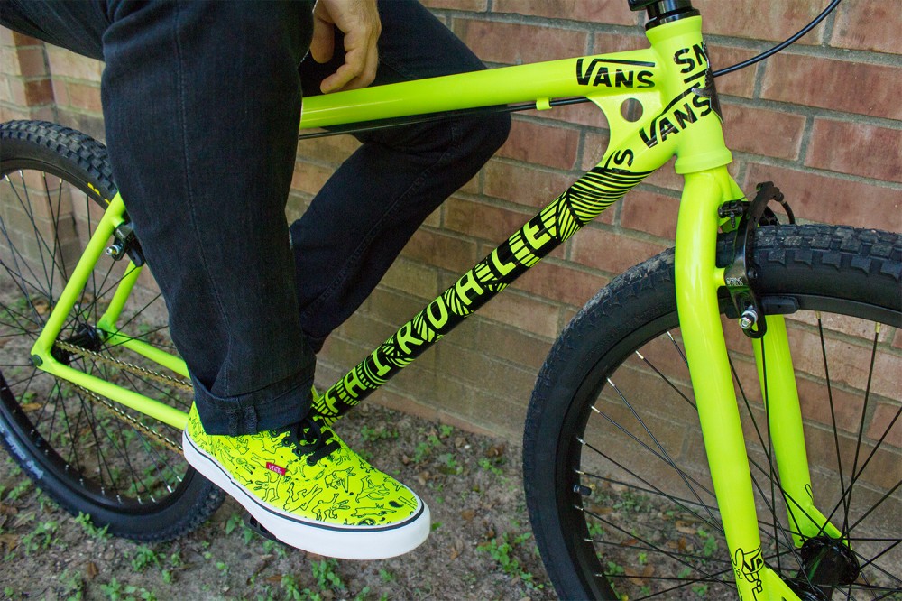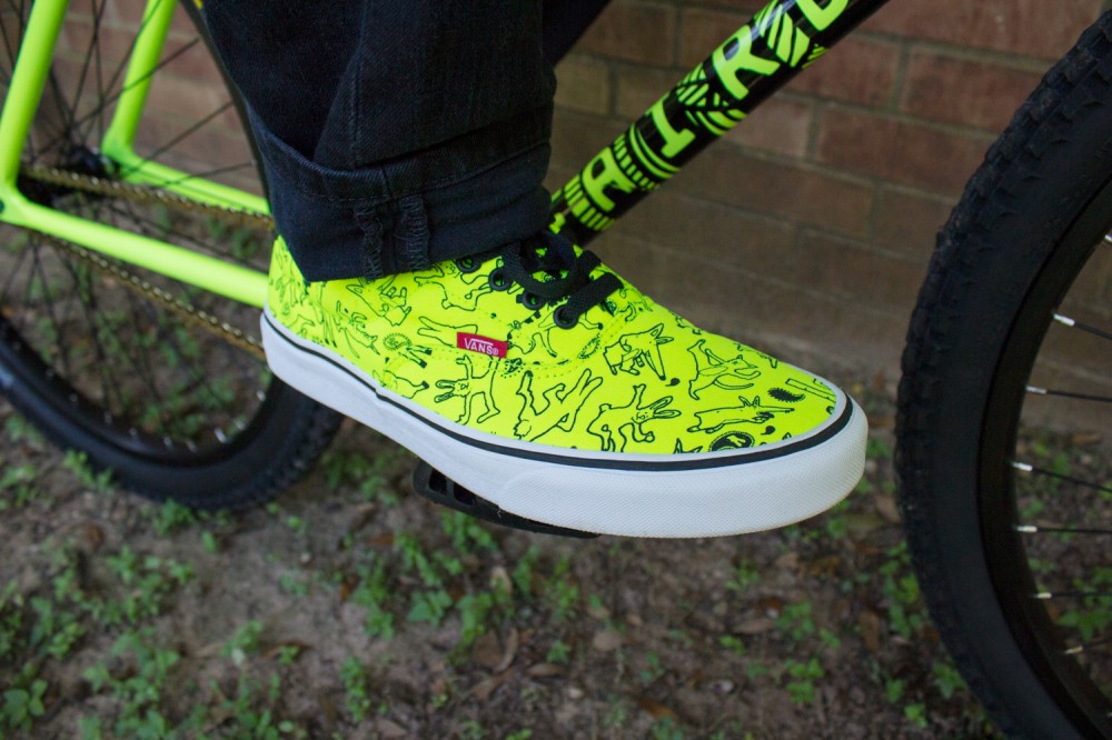 This info is about a month old, so sorry so late, but it’s still cool and worth sharing. Vans has teamed up with Fairdale bikes out of Austin, TX to create this limited edition Era, for friends, family, and a few lucky followers, as a thank you for their support. The high-vis neon yellow colorway is complemented with black accents and custom artwork throughout the entire shoe, which is fitting for any bike rider, and the 3M ankle mustache makes these a good choice for night riding as well. They even built a matching Fairdale TAJ bike in honor of their new shoe. Sorry, these aren’t for sale, but enjoy the pics after the jump, and the video up above!
