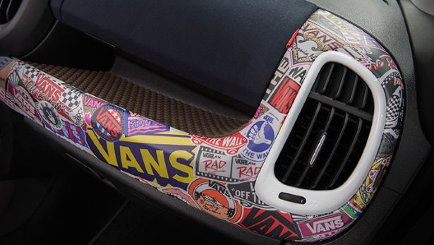 I don’t know if this was the best automobile brand to collaborate with. I do like the nice Vans customizations, like the gum waffle sole reverse treads on the utility tray, and pedals. The signature palm leaf pattern on the seat covers is dope, and I think the “sticker bomb” dash accent is a little over the top, but it is a concept after all. It has to be attention grabbing. I could see Vans teaming up with Scion, or Toyota’s TRD division. Maybe get in on the import drifting scene, which is somewhat an action sport, and maybe even a dirtbike brand collaboration. Same waffle accents, and familiar patterns please!