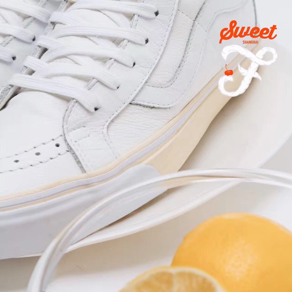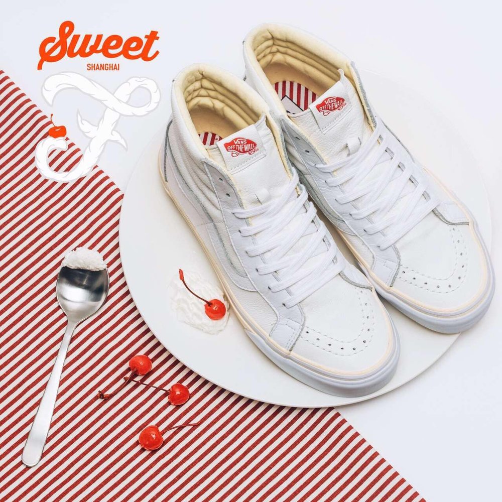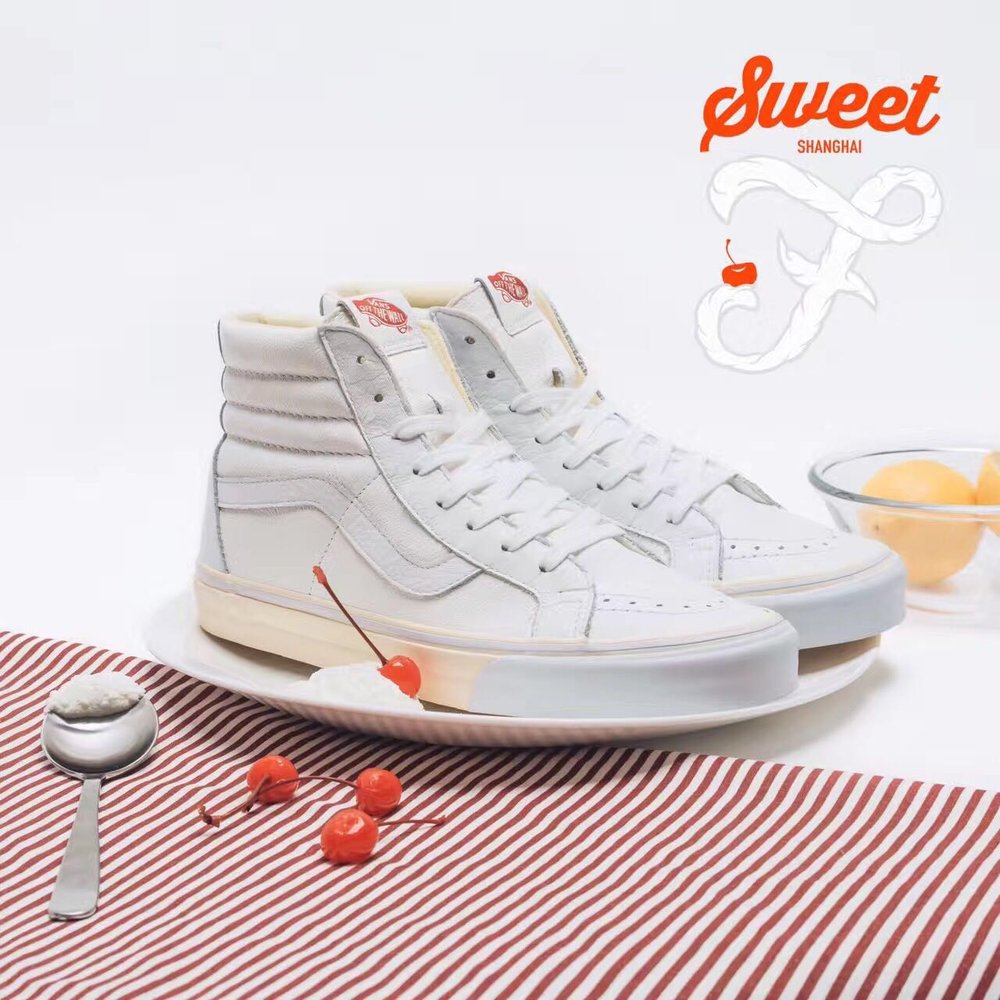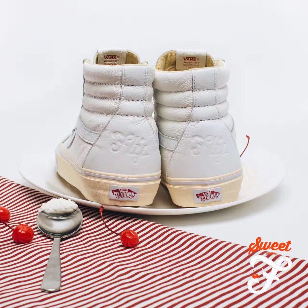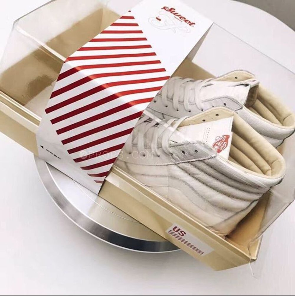 Vans, and China’s first skateshop FLY, have come together again on a new collaboration, this time a Sk8-Hi done up in a popular dessert theme. The ruby cake is where FLY pulled inspiration from on this particular release. If you look at the shoe’s foxing, you’ll notice it’s a cream color, resembling the vanilla cake, while the toe bumper, and uppers mimic the white frosting. The red tongue label is the obvious cherry on top, but the customization doesn’t stop there. If you take a look at the back heel panel, you’ll notice a large debossed FLY logo, reminding you whose shoe this is. Make no mistake about it, FLY has had some bangers in the past, and these are right up there with the best of them. For the in-shop release, they even went as far as to create custom plastic bakery containers for each shoe. How dope is that? Congrats to Jeff Han, and the FLY crew for this dope Vans Sk8-Hi!