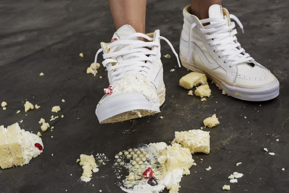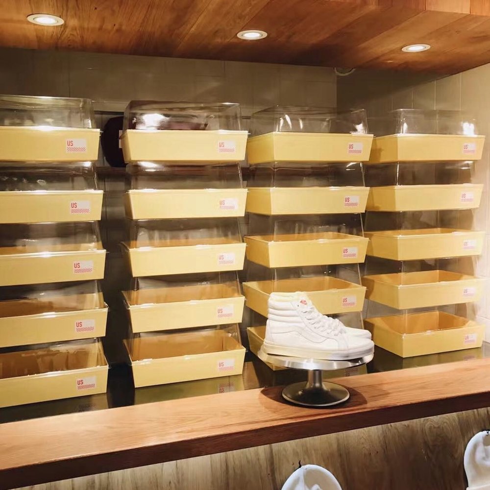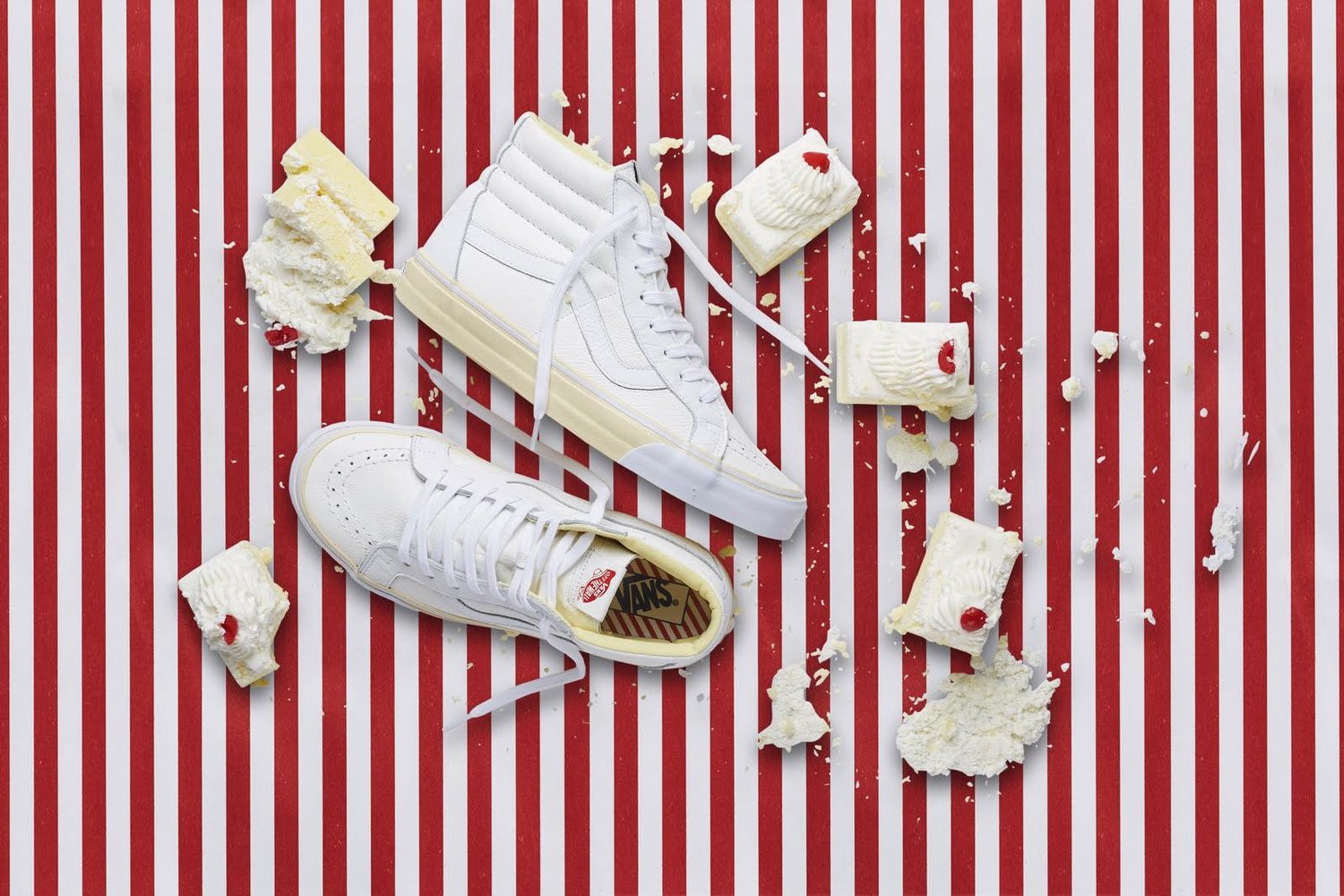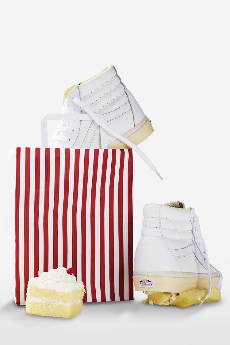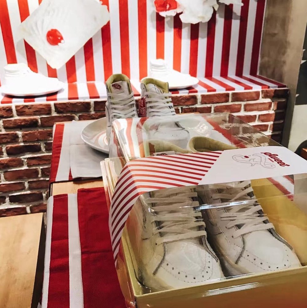 Vans, and China’s first skateshop FLY, have come together again on a new collaboration, this time a Sk8-Hi done up in a popular dessert theme. The ruby cake is where FLY pulled inspiration from on this particular release. If you look at the shoe’s foxing, you’ll notice it’s a cream color, resembling the vanilla cake, while the toe bumper, and uppers mimic the white frosting. The red tongue label is the obvious cherry on top, but the customization doesn’t stop there. If you take a look at the back heel panel, you’ll notice a large debossed FLY logo, reminding you whose shoe this is. Make no mistake about it, FLY has had some bangers in the past, and these are right up there with the best of them. For the in-shop release, they even went as far as to create custom plastic bakery containers for each shoe. How dope is that? Congrats to Jeff Han, and the FLY crew for this dope Vans Sk8-Hi!