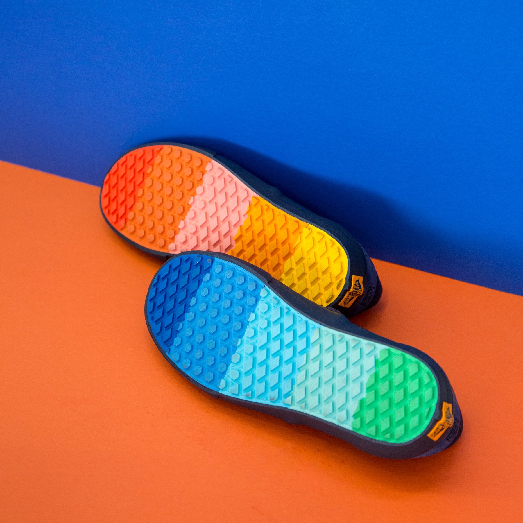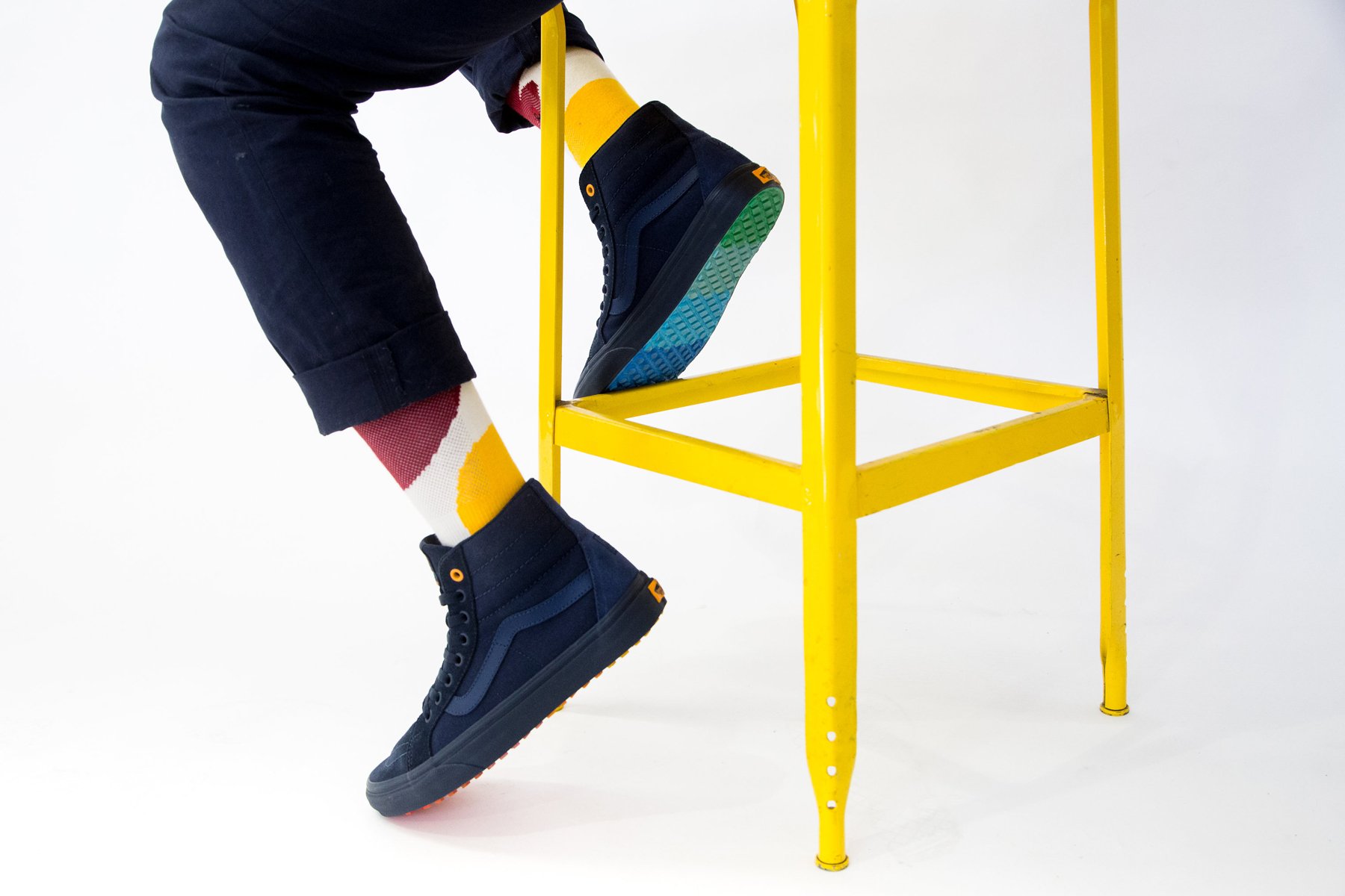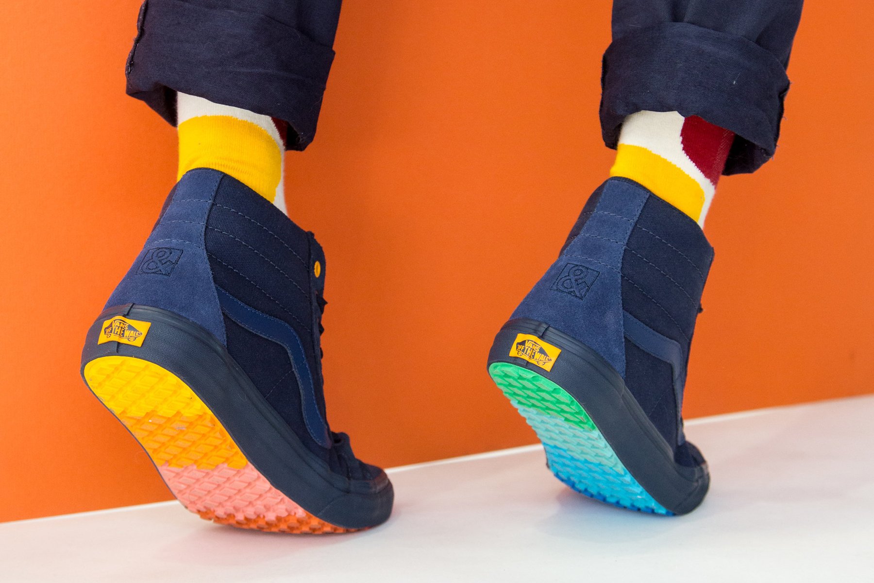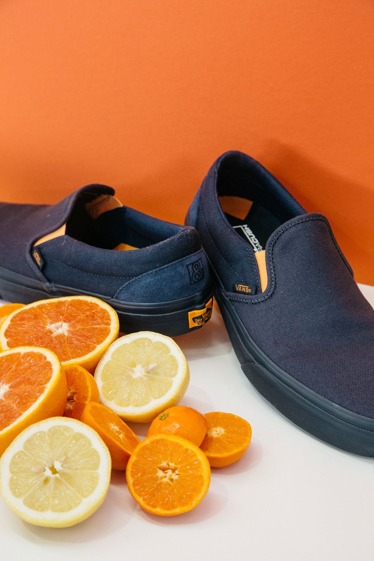 “For the Vans “Made For the Makers” line, we kept them FUNctional by pairing dark navy blue Vansguard canvas to hide spills and stains with rainbow lugged outsoles for increased grip and traction, and some UltraCush H&B ampersand sockliners for maximum all-day comfort. Then we added a touch more Hedley & Bennett fun with pops of orange throughout.