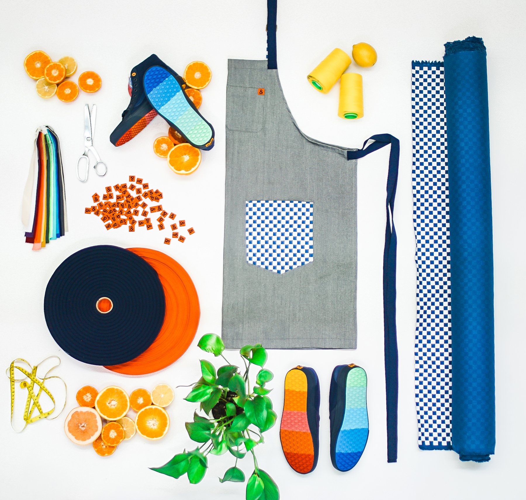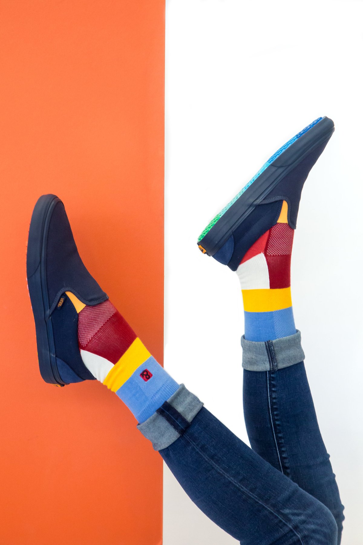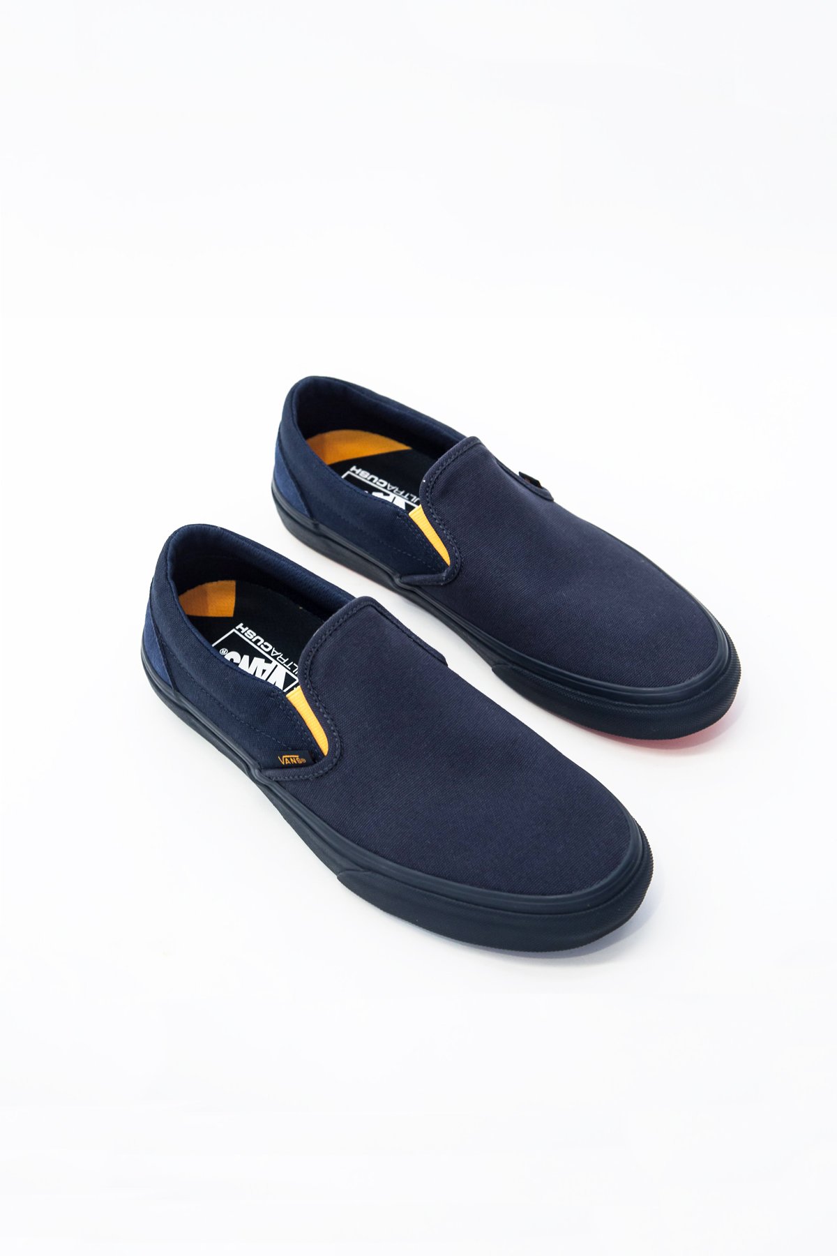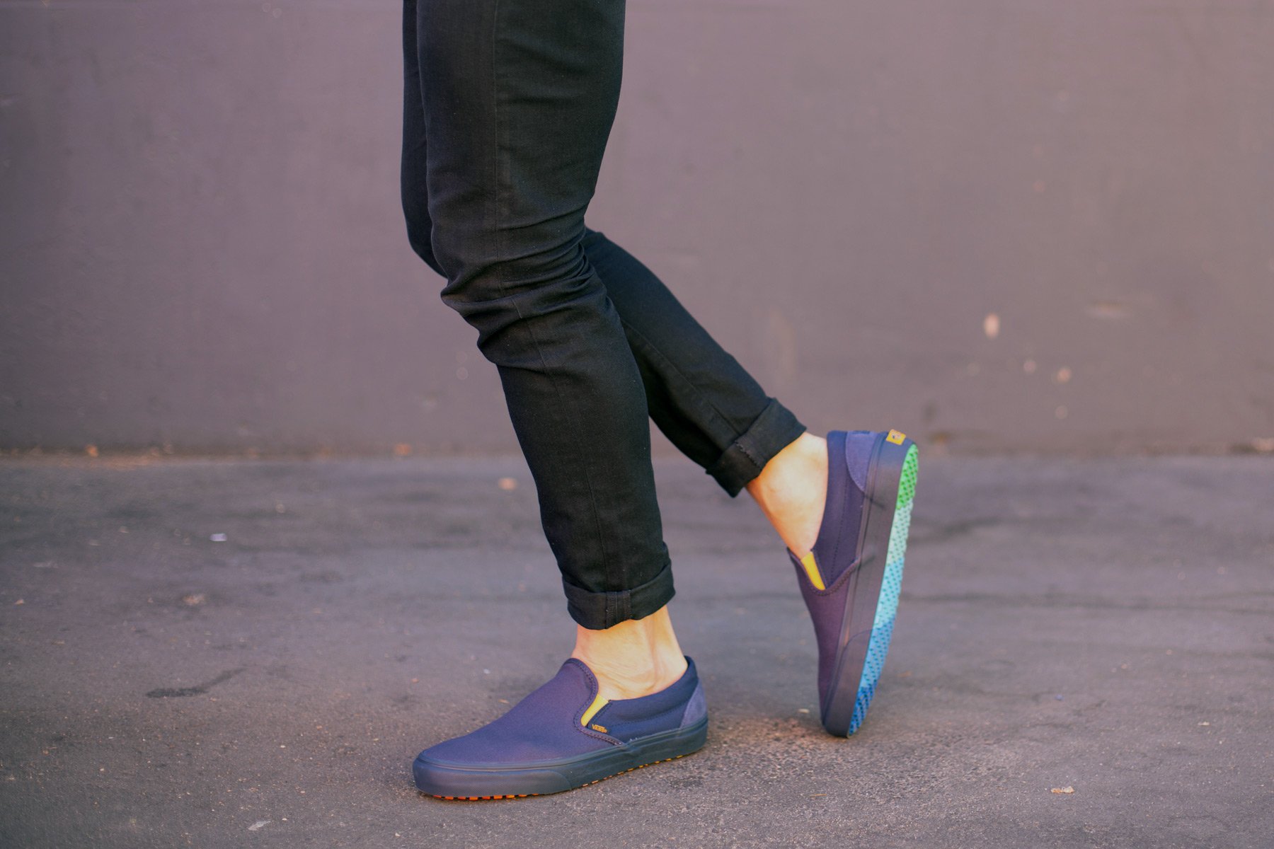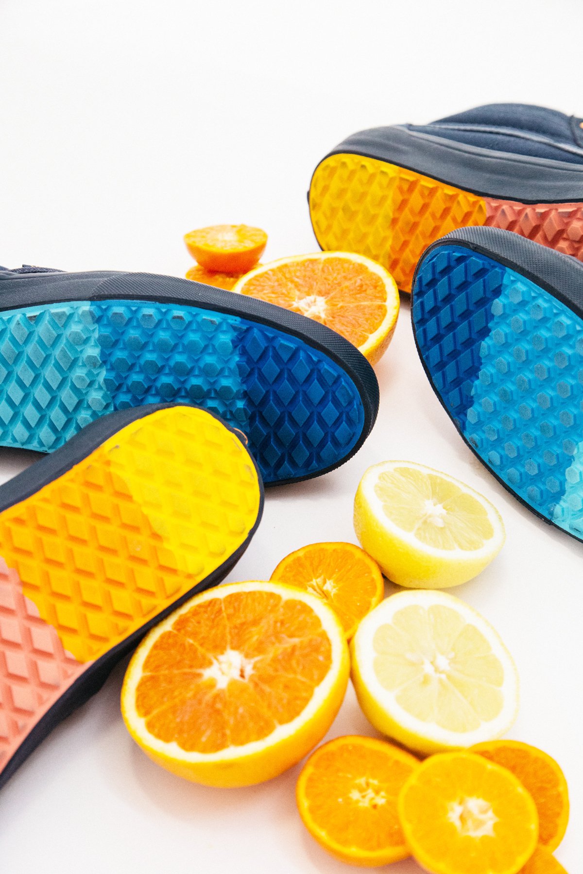 “For the Vans “Made For the Makers” line, we kept them FUNctional by pairing dark navy blue Vansguard canvas to hide spills and stains with rainbow lugged outsoles for increased grip and traction, and some UltraCush H&B ampersand sockliners for maximum all-day comfort. Then we added a touch more Hedley & Bennett fun with pops of orange throughout.