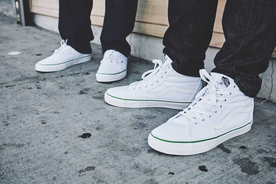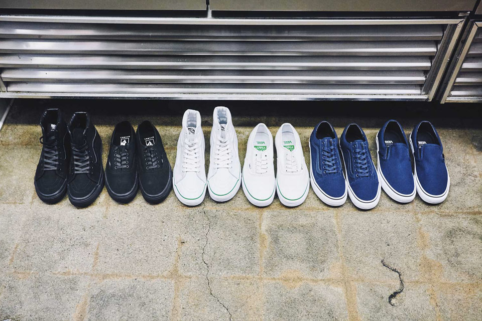 “Vans cooks up a new footwear collaboration with renowned chefs Jon Shook and Vinny Dotolo. Co-founders of Jon & Vinny’s, Animal, Son of A Gun, and a few other restaurants in Los Angeles, Shook and Dotolo designed the collab with a professional kitchen setting in mind, creating some special makeups of Vans’ Authentic, Slip-On, Old Skool and Sk8-Hi silhouettes.