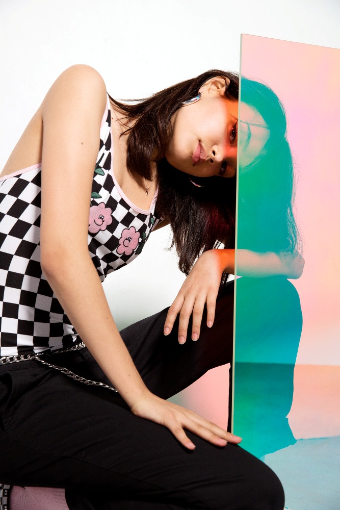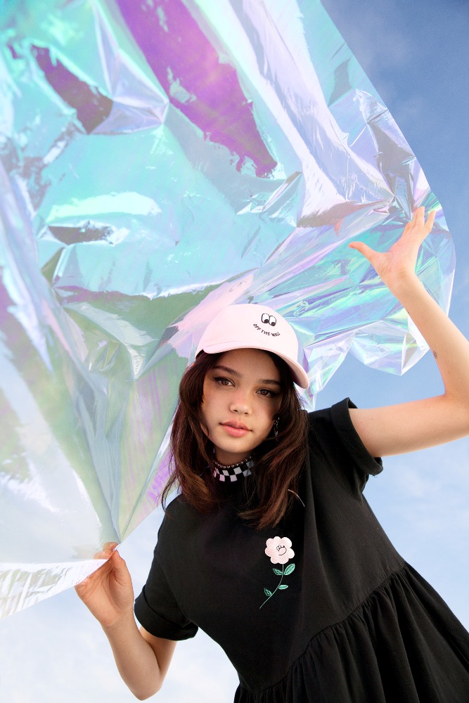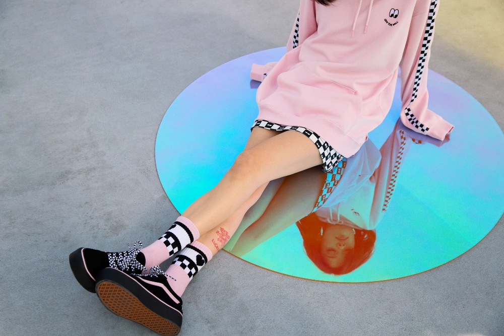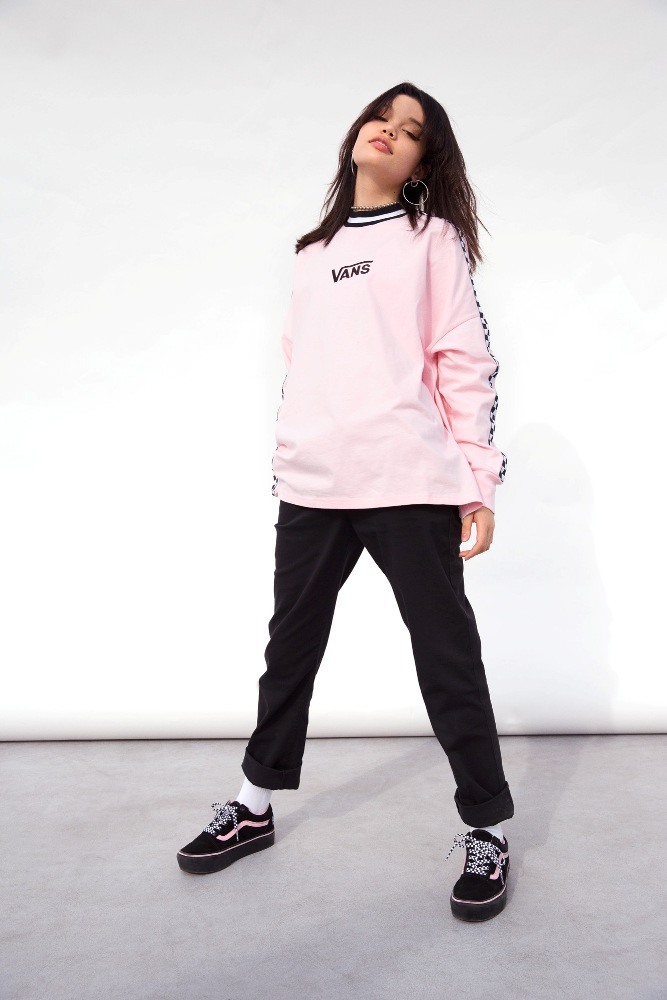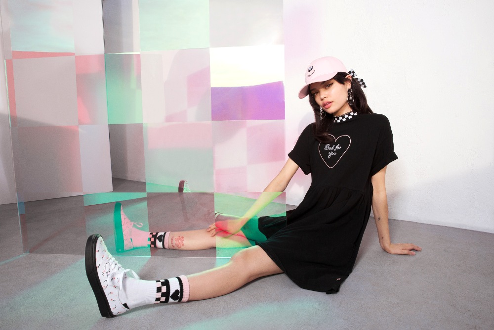 The Vans x Lazy Oaf collection showcases a vision of youthful creativity by bringing Lazy Oaf’s edgy weirdness and notoriously colorful aesthetic to a range of Vans apparel and accessories. Using a distinct color palette of pink, black and white, the Vans x Lazy Oaf apparel collection uses checkerboard and playful Lazy Oaf elements. The Sorry I’m Late Tee is fitted with embroidery at the chest and checker trim down the sleeves. The Off The Wall Tee uses an oversized fit that includes checkerboard printed neck rib and a zany embroidery detail at the chest. The Checkerboard Tee combines a sport stripe neck with checkerboard trim down the sleeves and is finished with Vans Flying V logo. The Bear Floral Bodysuit boldly displays checkerboard print with embroidered floral details and a crisscross back. The eyeball check pattern covers the A-line skirt that makes the perfect pairing for the collection. The baby doll style dress has been remastered to include a t-shirt style top with an oversized fit and is available in two cheeky styles. Street and sportswear influence can be seen across the Bear Floral Crew and Off The Wall Lazy Hoodie.