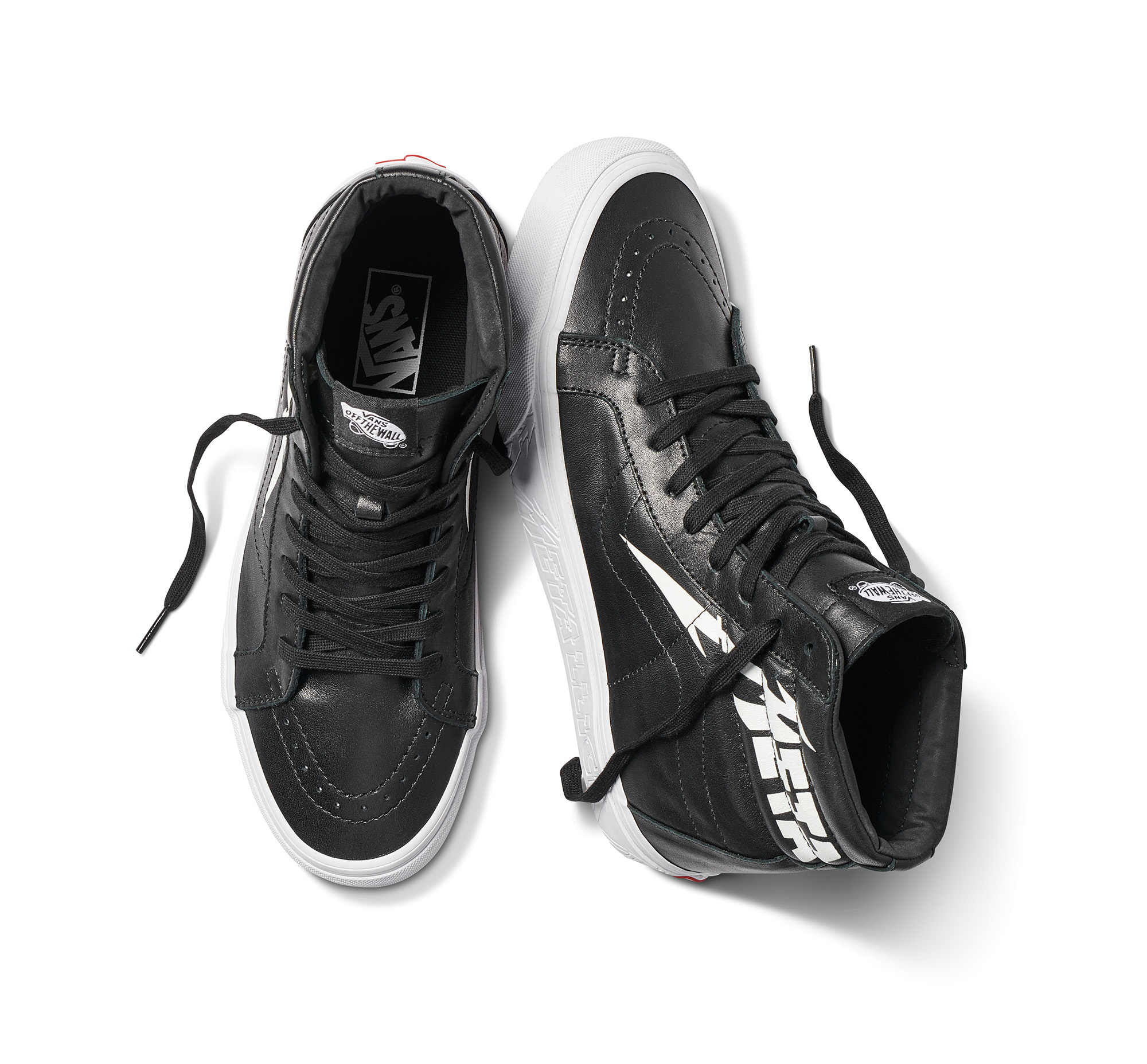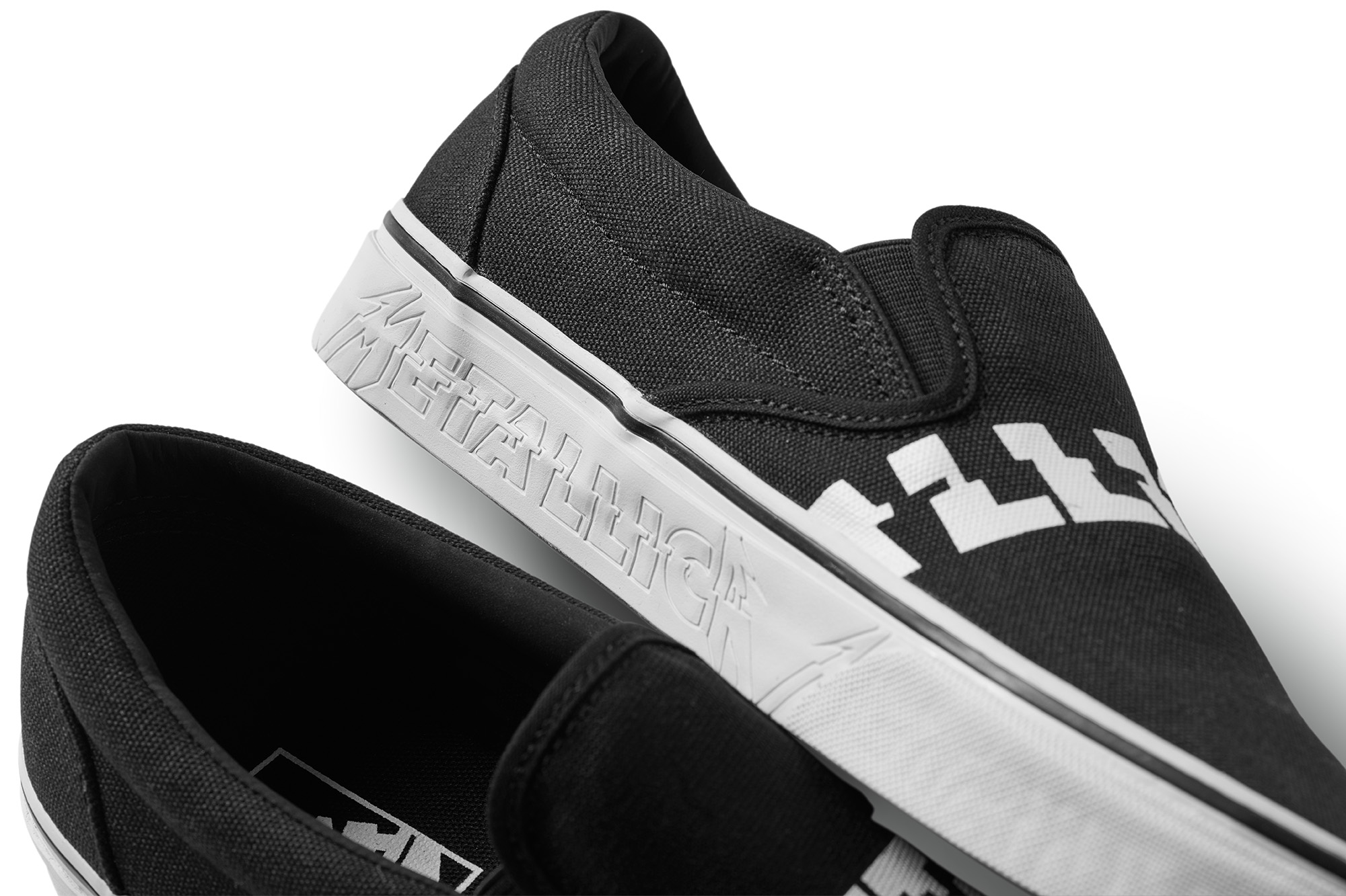 The Vans x Metallica collection highlights the newly designed Metallica logo for a heavy metal rendition of Vans classic silhouettes. Dressed in full grain leather upper and tonal deco-stitched Sidestripe, the Sk8-Hi Reissue showcases an etched Metallica logo on the sidewall with a wrapped version on the quarter panels. The Classic Slip-On features an all-over logo print across the vamp and is finished with the same engraved Metallica logo on the sidewalls. A short sleeve t-shirt and trucker hat round out the offering using a Vans x Metallica logo lock-up.