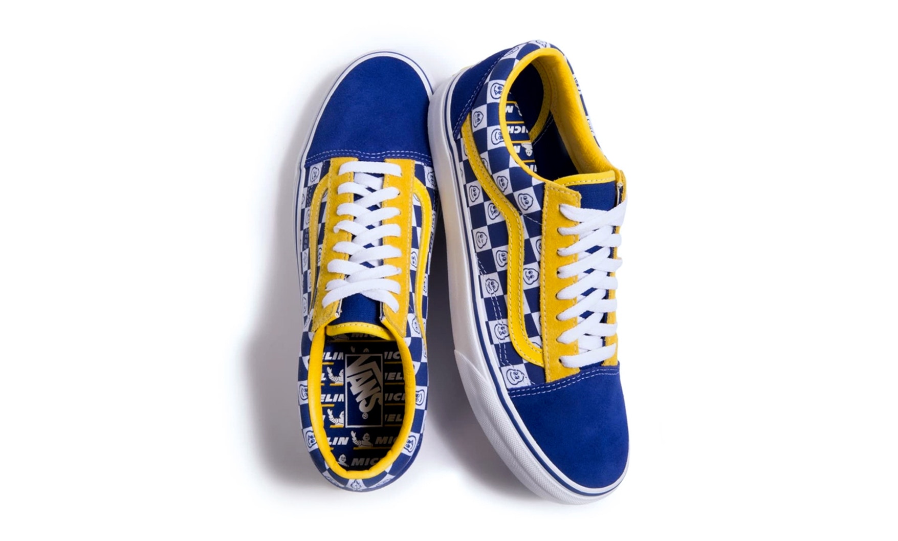 “Skate imprint Vans has linked up with French tire company Michelin on a collaborative footwear range featuring limited-edition Sk8-Hi and Old Skool models. Both silhouettes boast a blue and white checkerboard print upper featuring the Michelin Man’s face in the white cells, as well as bright yellow accents at the tongue tab, inner lining and foxing.