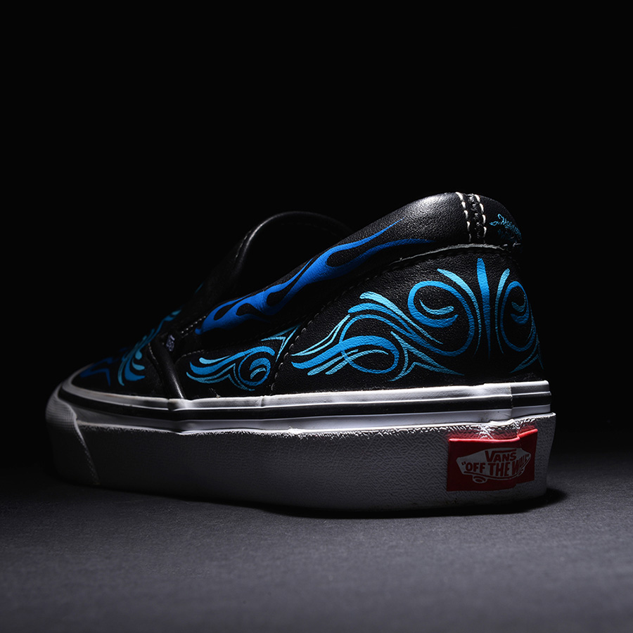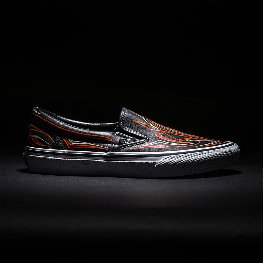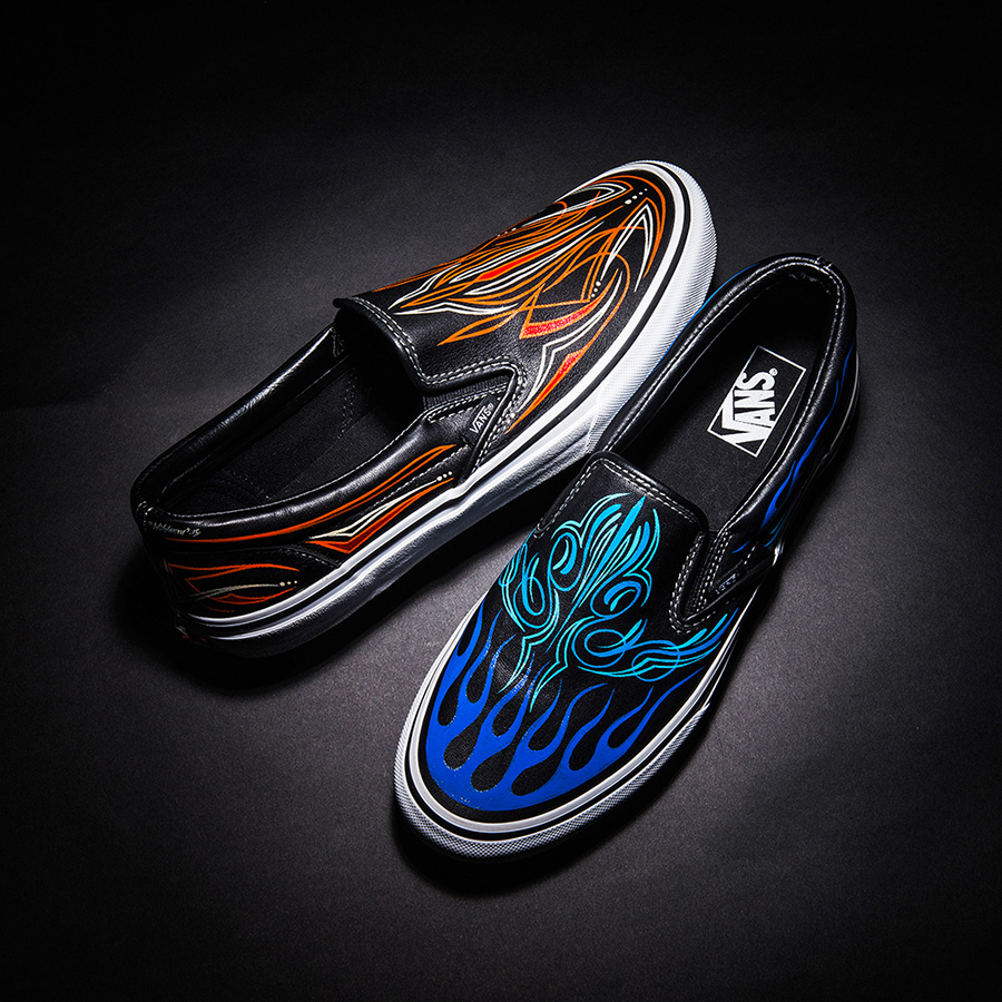 This weekend will mark the 24th annual Yokohama Hot Rod Custom Show in Yokohama, Japan, and Mooneyes’ very own Hiro “Wildman” Ishii will be there, putting on a pin-striping demonstration on some leather Slip-Ons, but this year he is going to be selling them, allowing a select few to get their very own custom shoe done by him. This is more of an art piece, so each person will only be receiving one shoe. According to the translated version of the Vans Japan page, Hiro will also be taking orders for these at the event, perhaps so he can produce more after the event is over. These are absolutely stunning, and a great idea! Too bad it’s only for the Japan Vans heads! (They will also be giving out free Vans pinstripe stickers to those who visit the booth)