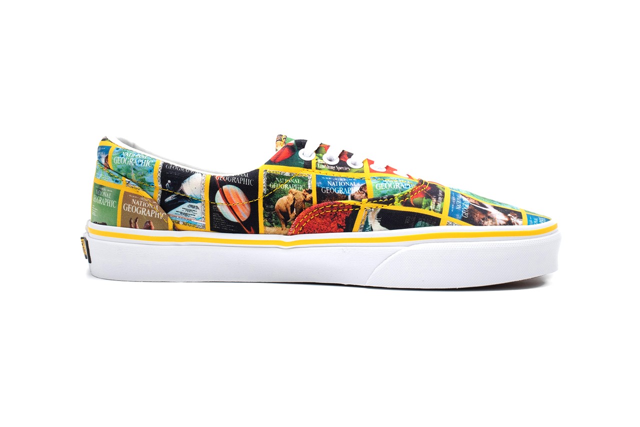 Elsewhere we see an Authentic covered in National Geographic magazine covers complete with the publication’s signature yellow border, as well as a pair of Old Skools that showcase the Mexican grey wolf alongside the red-eyed tree frog. Rounding out the collection is the Sk8-Hi which wears a large embroidered National Geographic logo. This logo adorns all pairs but the Era, while Vans’ signature license plate on the heel now comes in an apt black and yellow colorway.