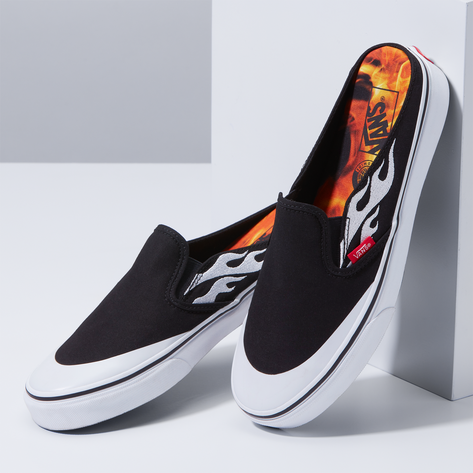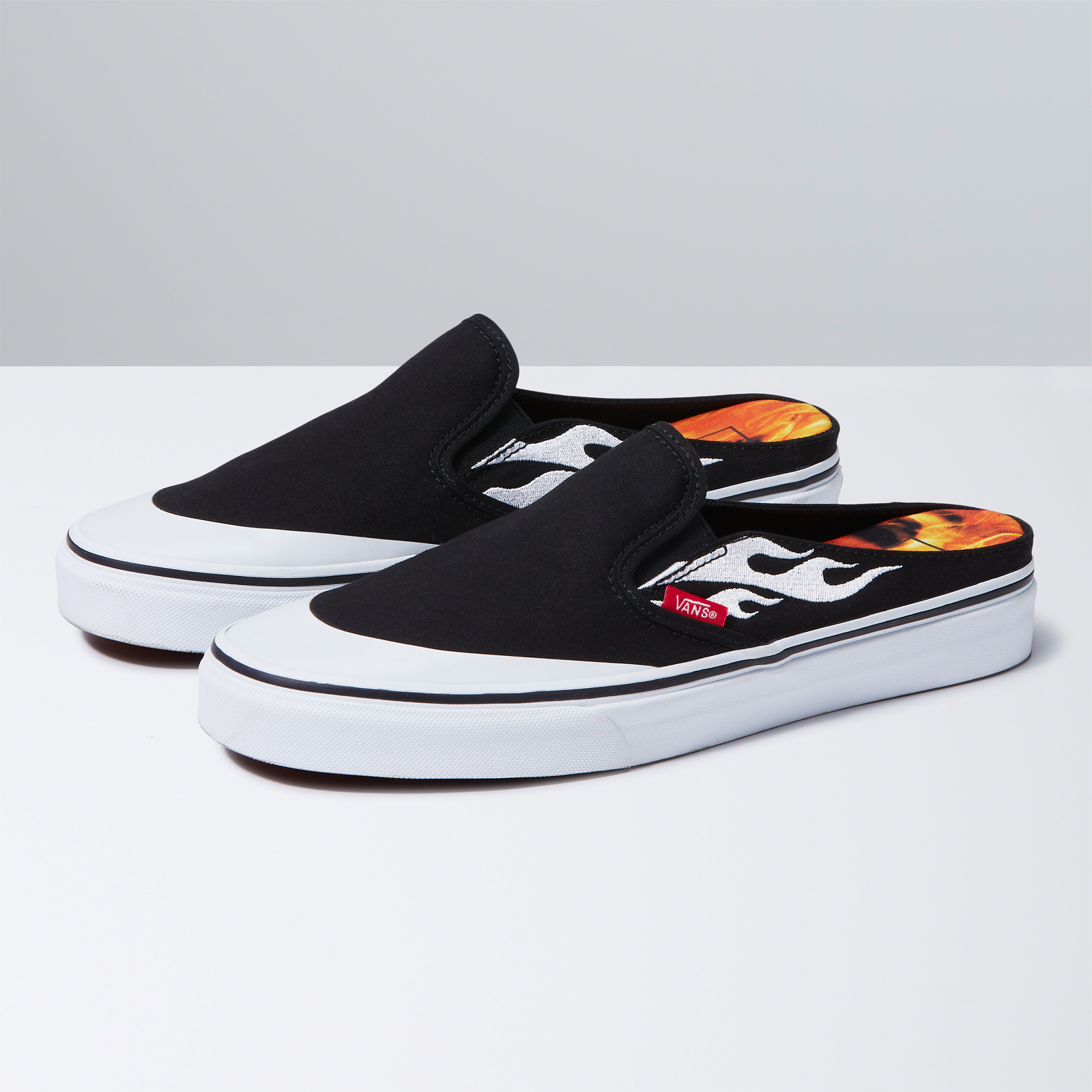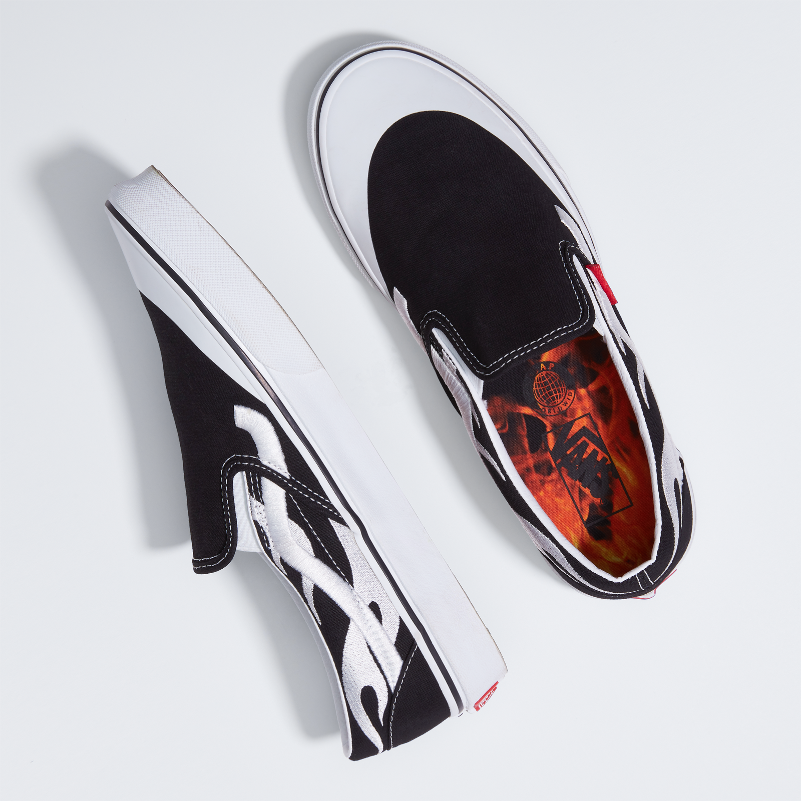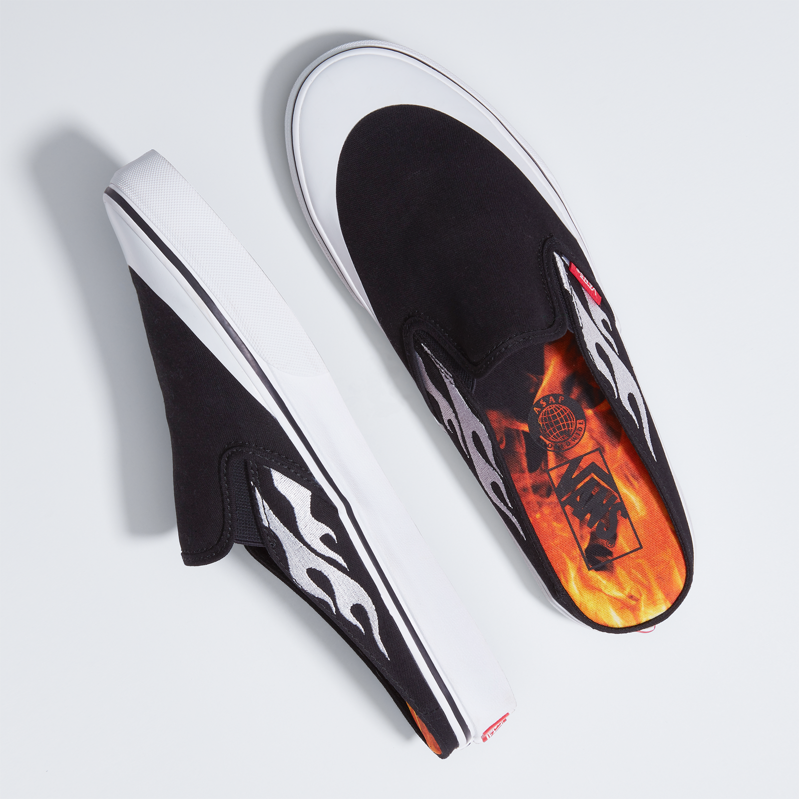 The Vans Classic Slip-On and Classic Slip-On Mule are reworked in black canvas with the unique flame design A$AP Rocky created for the project embroidered across the side of each shoe in white. The Classic Slip-On sees a subtle yet innovative upgrade with the addition of the storied “Jazz” Sidestripe from one of Rocky’s favorite Vans styles, the Old Skool, while both shoes include a co-branded A$AP Worldwide flame-print footbed and contrast white toe cap, giving the set a distinct ‘90s-era vibe. Each style is finished with pops of red by way of the iconic Vans “Off the Wall” heel plate and Vans toe tab.