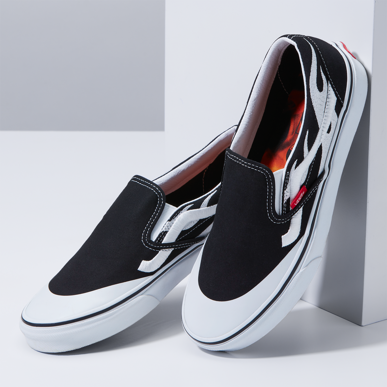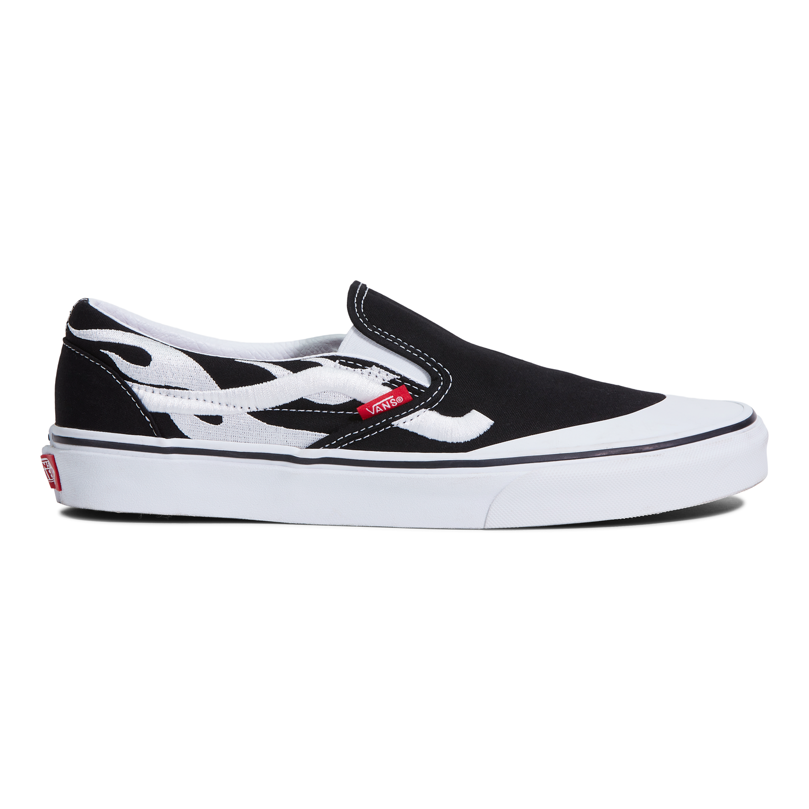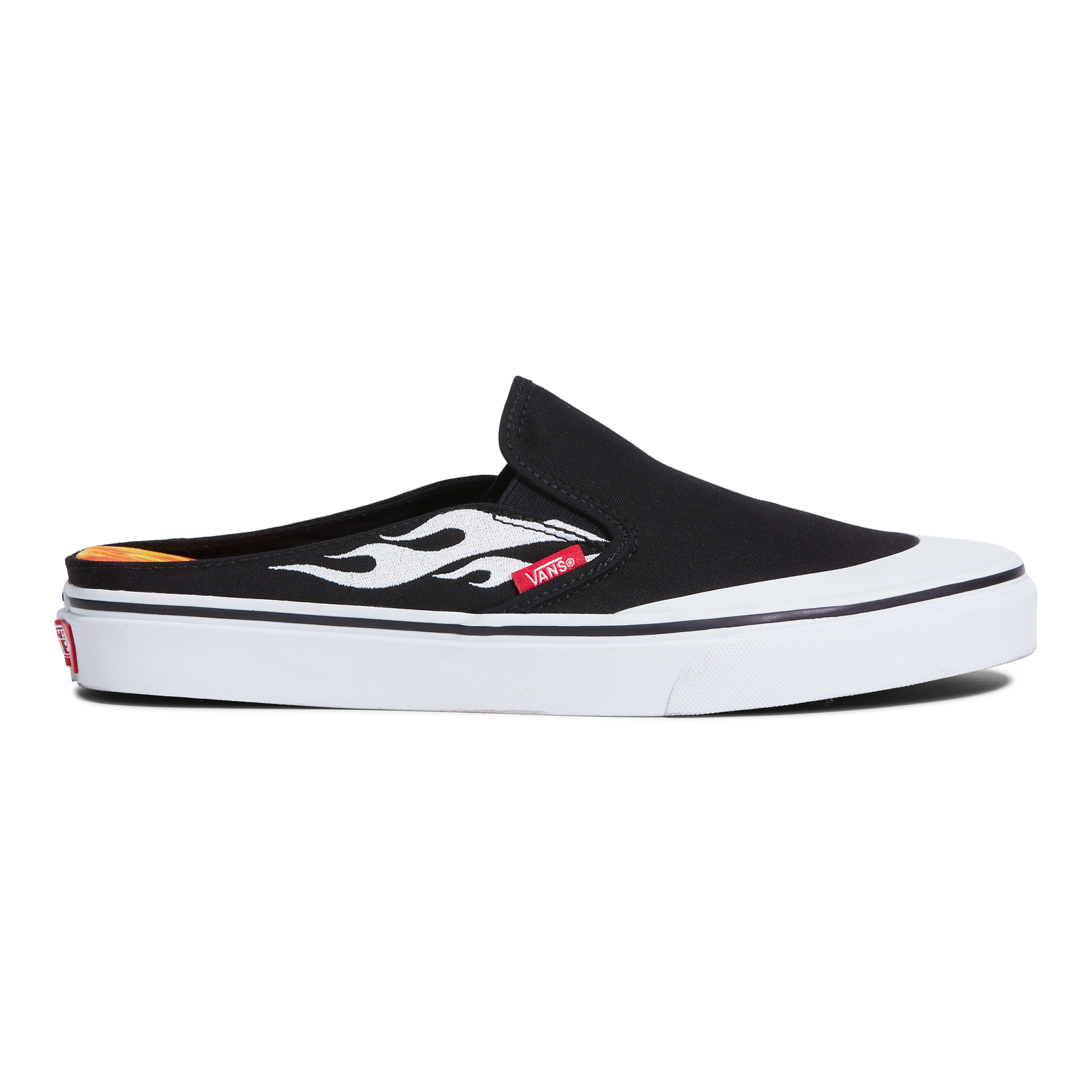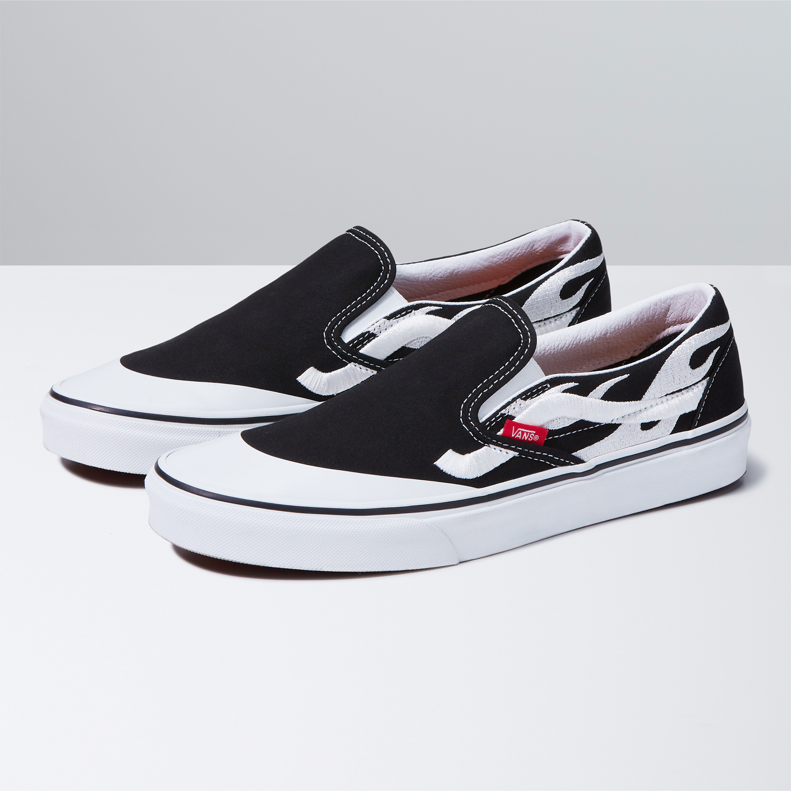 The Vans Classic Slip-On and Classic Slip-On Mule are reworked in black canvas with the unique flame design A$AP Rocky created for the project embroidered across the side of each shoe in white. The Classic Slip-On sees a subtle yet innovative upgrade with the addition of the storied “Jazz” Sidestripe from one of Rocky’s favorite Vans styles, the Old Skool, while both shoes include a co-branded A$AP Worldwide flame-print footbed and contrast white toe cap, giving the set a distinct ‘90s-era vibe. Each style is finished with pops of red by way of the iconic Vans “Off the Wall” heel plate and Vans toe tab.