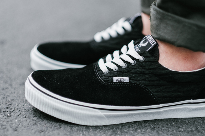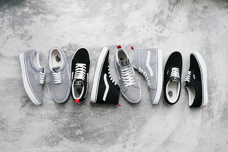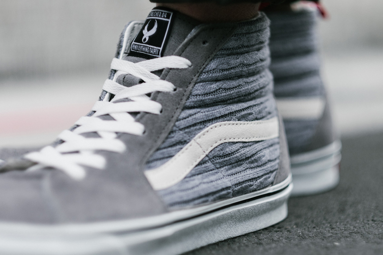 “Taiwanese urban retailer Remix will be starting 2015 off strong with a collaborative effort, this time teaming up with iconic skateboarding label Vans for a capsule range celebrating its 10th anniversary. Four all-new iterations of the Vans Era and Vans SK8-Hi will be released in two colorways. Both the black pairs, and its grey counterparts will sport a combination of leather and knitting, coupled with a transparent waffle outsole featuring Remix’s angel vs. demon logo.”