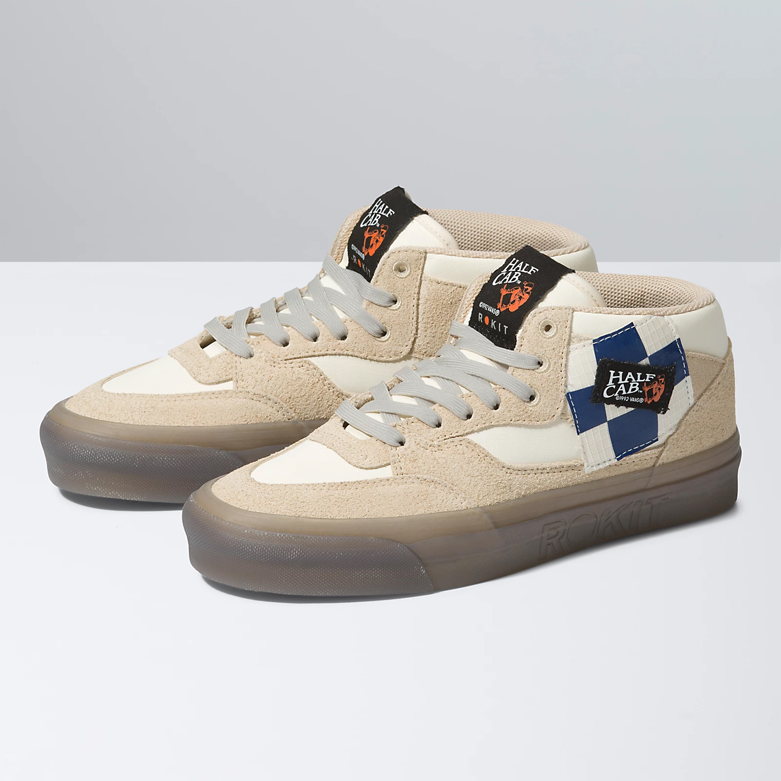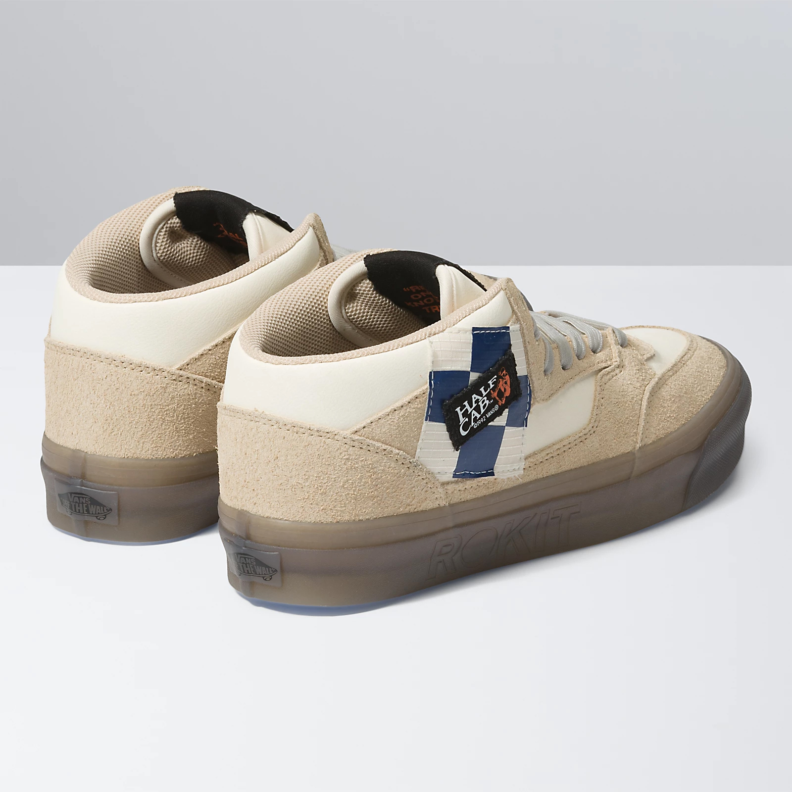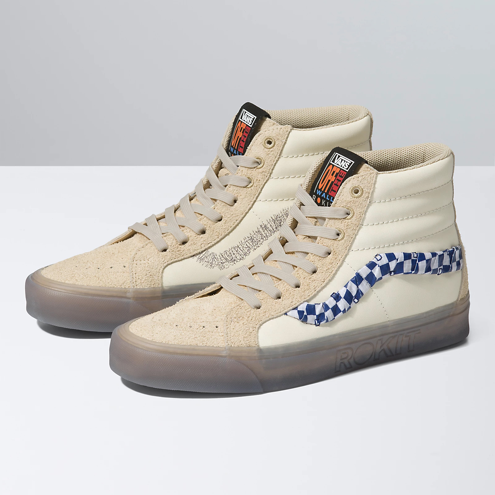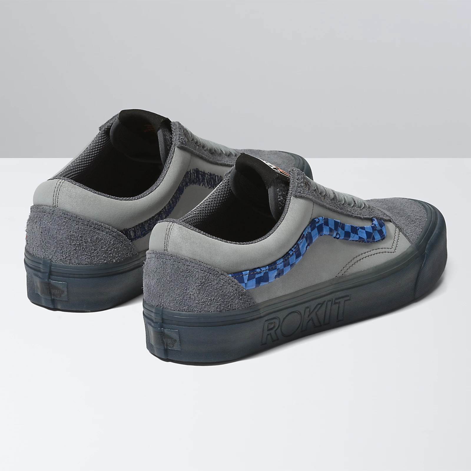 The Vans X Rokit Sk8-Hi 38 DX WS uses a muted color palette, heavy textures at the sidestripes, and a see-through sidewall print, while the Vans X Rokit Half Cab 33 DX uses a muted color palette, unique appliques, and a see-through sidewall print, and lastly the Vans X Rokit Old Skool 36 DX WS uses a muted color palette, heavy textures at the sidestripes, and a see-through sidewall print, all for a modern look that reflects the Rokit lifestyle.