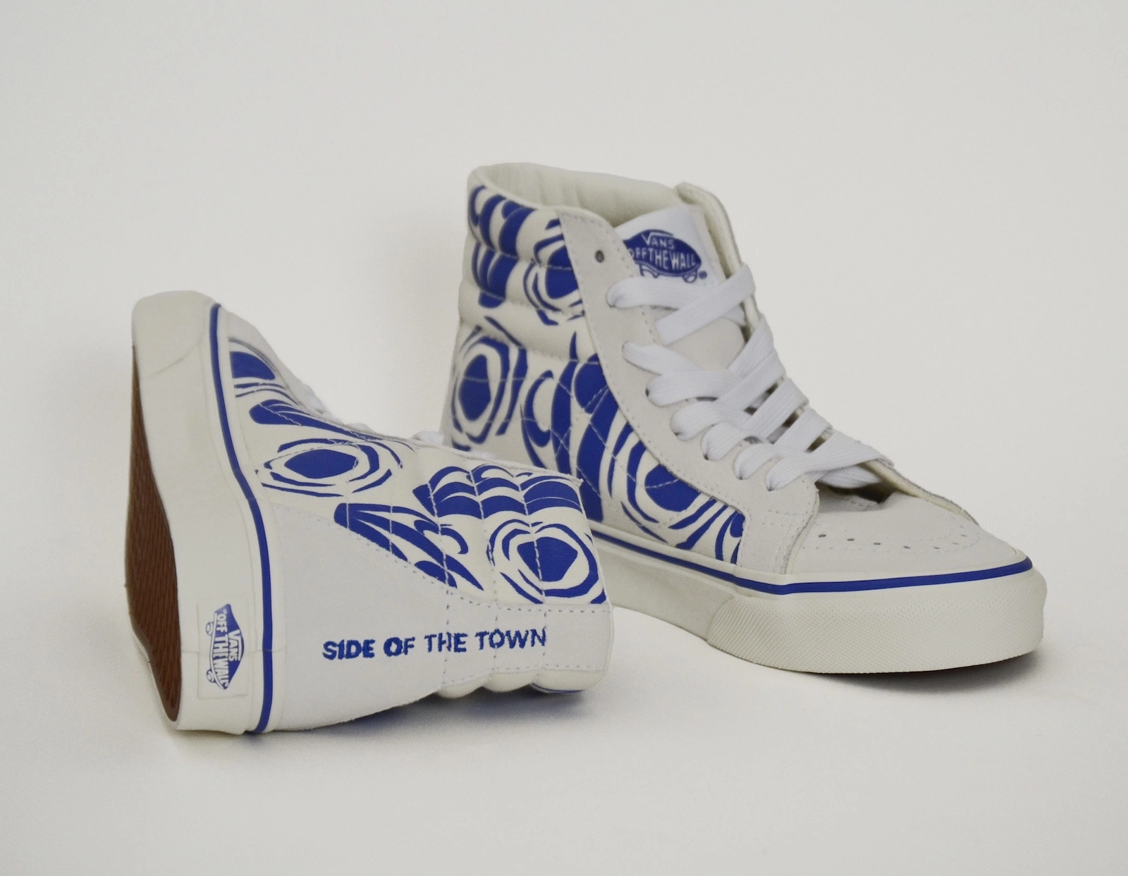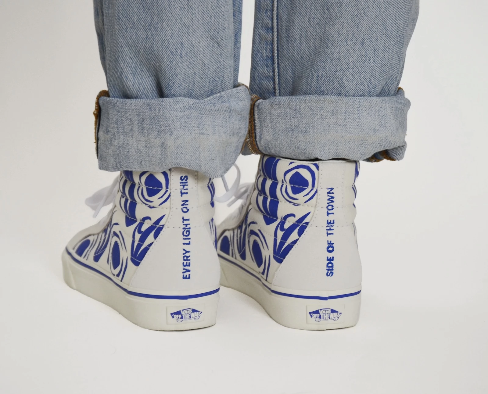 The kicks are designed with a clean white backdrop and blue sun and moon artwork that allude to the lyrics from Jason Molina’s “Farewell Transmission.” Parked out back are the words “Every Light On This” on the left shoe and “Side Of Town” on the right to nod to the track’s opening verse.