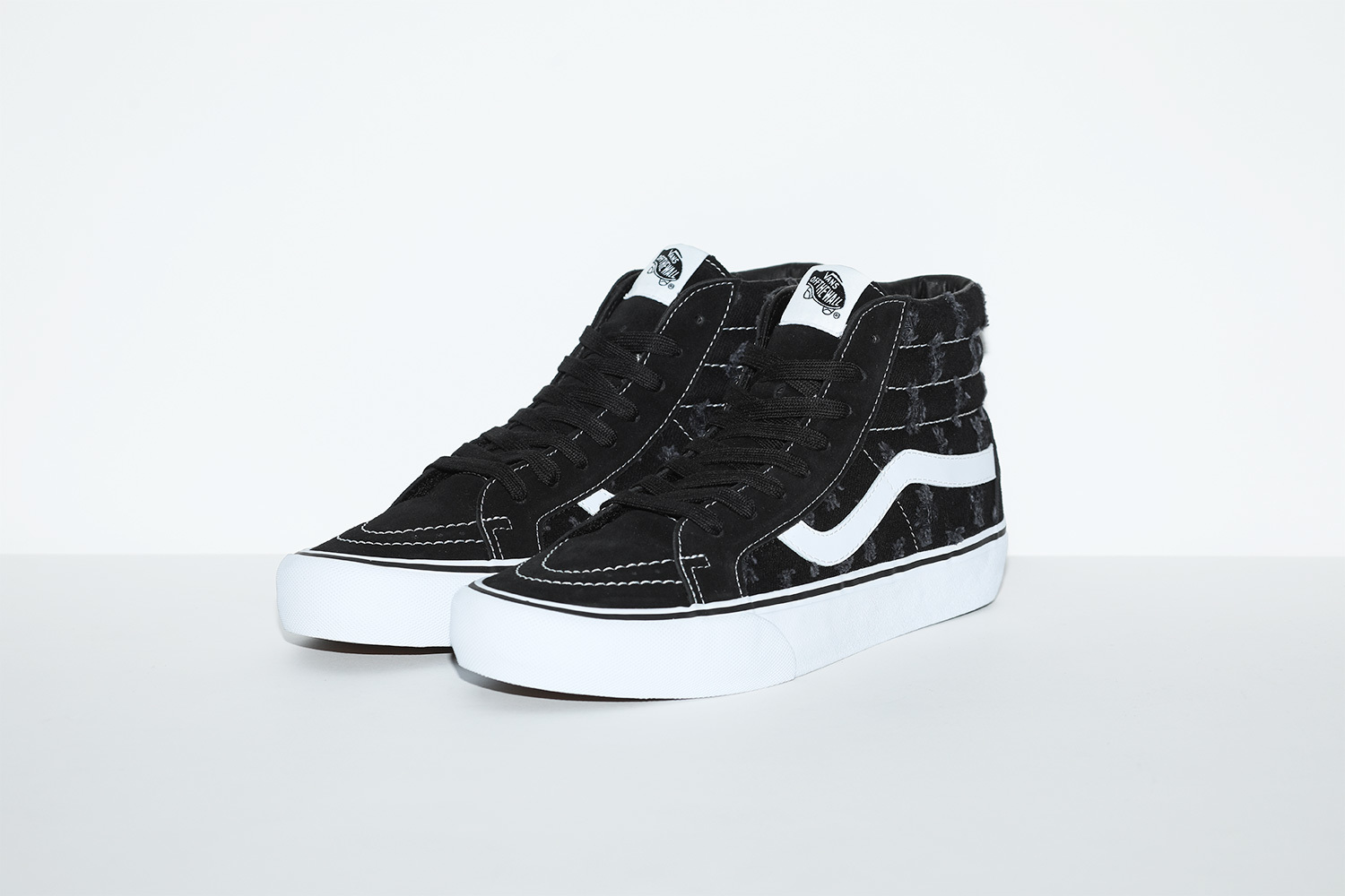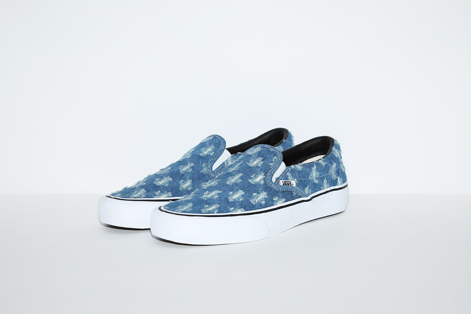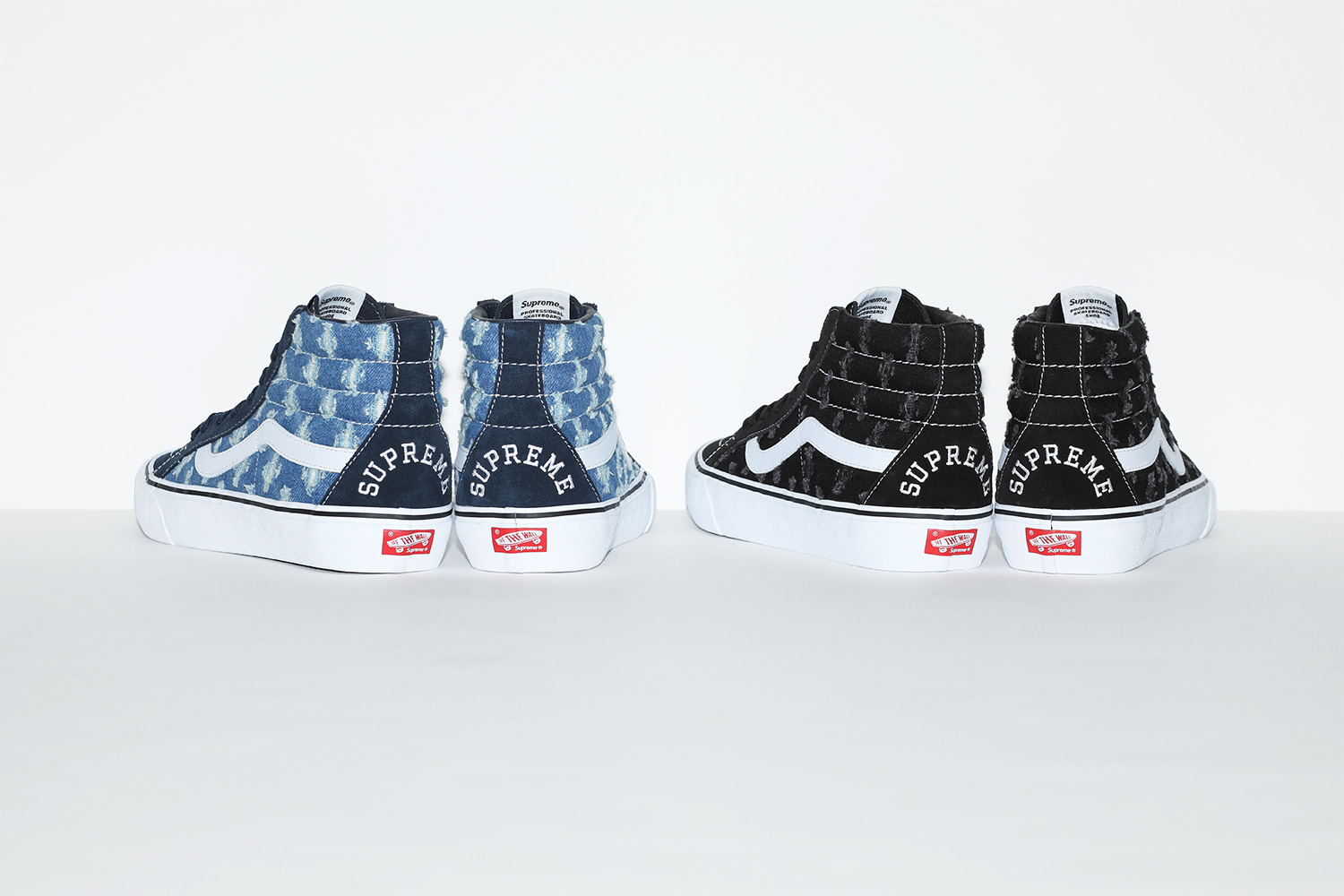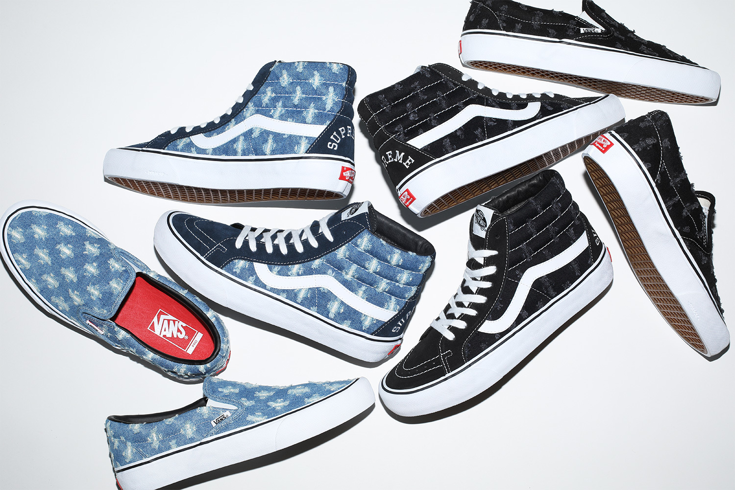 This spring, Supreme will release new versions of the Vans® Sk8-Hi Pro and Slip-On Pro. The Sk8-Hi Pro features a premium suede and denim upper with hole punch pattern, leather lining, vulcanized outsole and embroidered logo at heel. The Slip-On Pro features a denim upper with hole punch pattern, leather lining and vulcanized outsole.