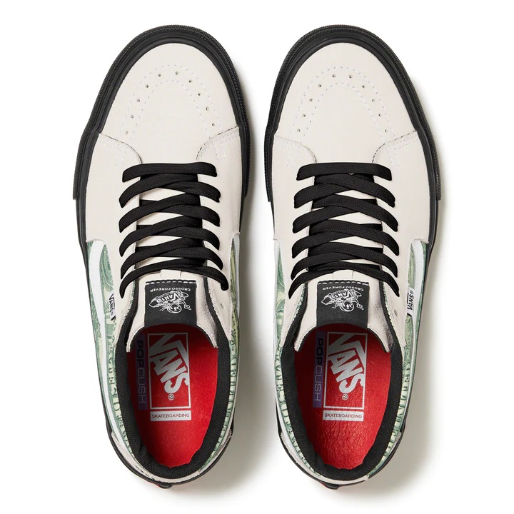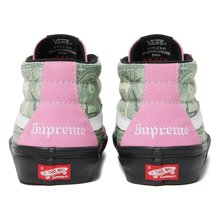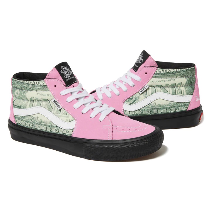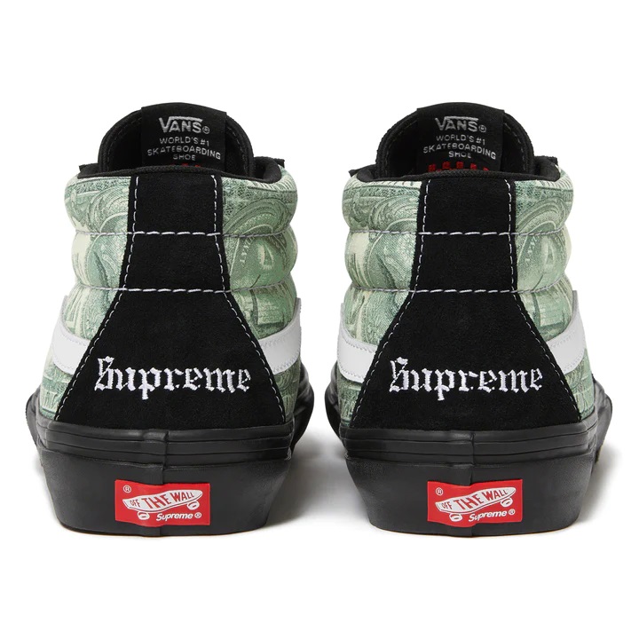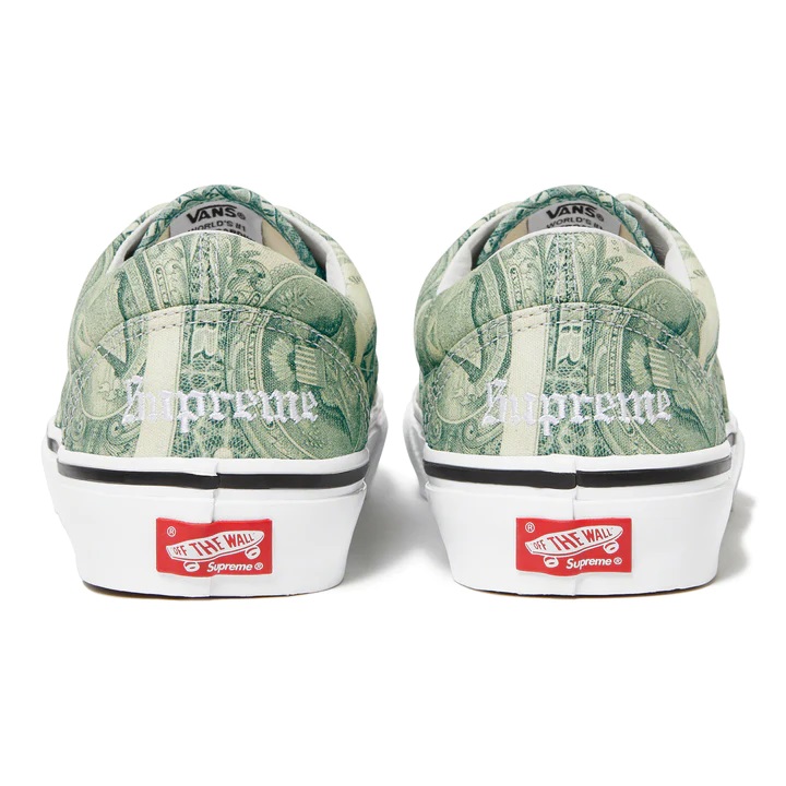 Supreme has worked with Vans® on a new version of the Skate Grosso Mid and Era. The Skate Grosso Mid features a premium suede and canvas upper with printed graphic, while the Era features a canvas upper with printed graphic. Both shoes feature a leather lining and insole, vulcanized waffle outsole and embroidered logo on heel. Made exclusively for Supreme, the Skate Grosso Mid will be offered in three color ways, while the Era will be offered in one color way.