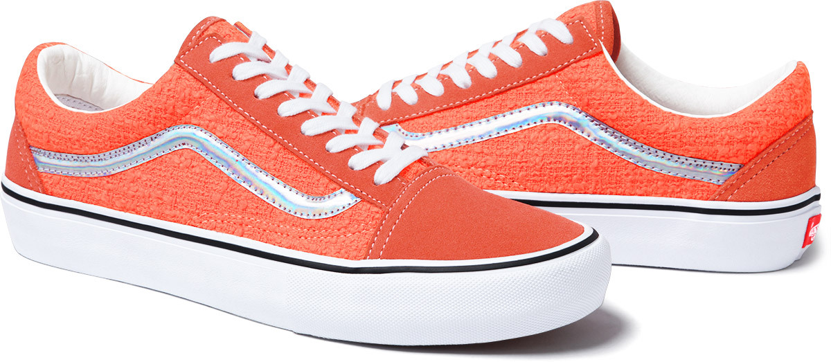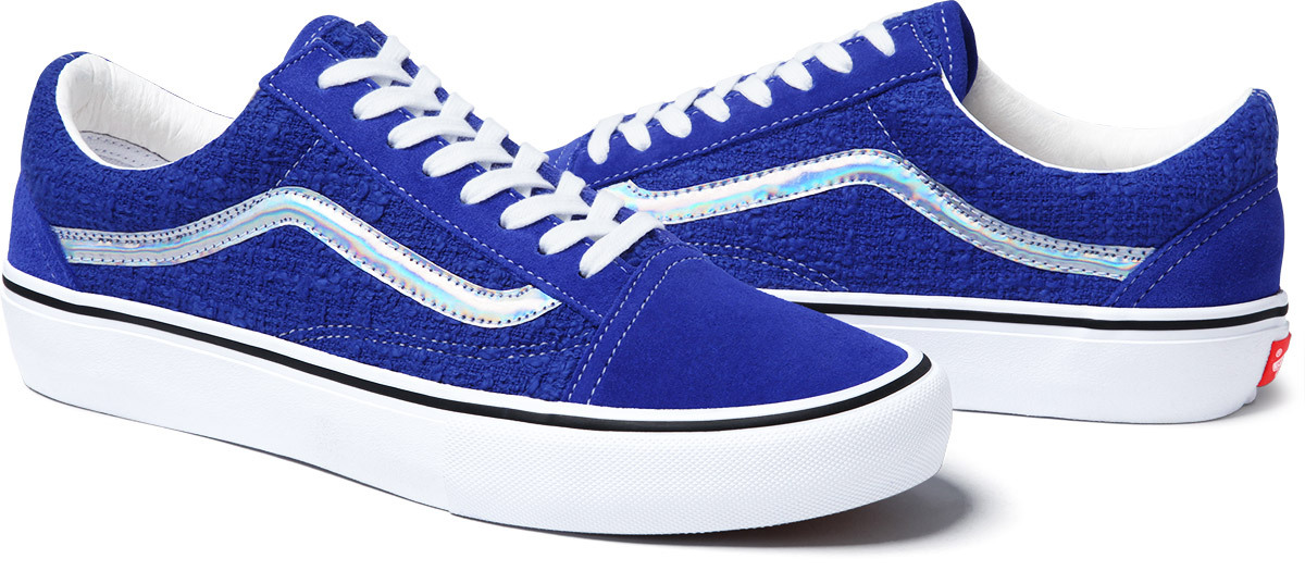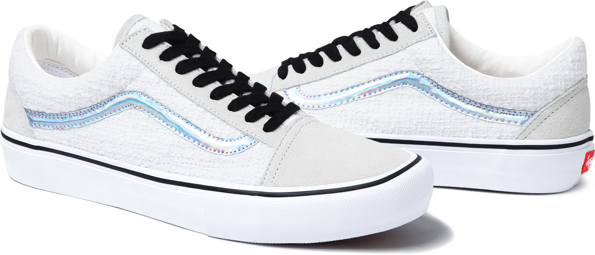 Supreme will be releasing a new style of the Vans Old Skool. The shoe features a cotton bouclé upper with an iridescent side stripe and leather lining. Made exclusively for Supreme, the Old Skool will be offered in four colorways.