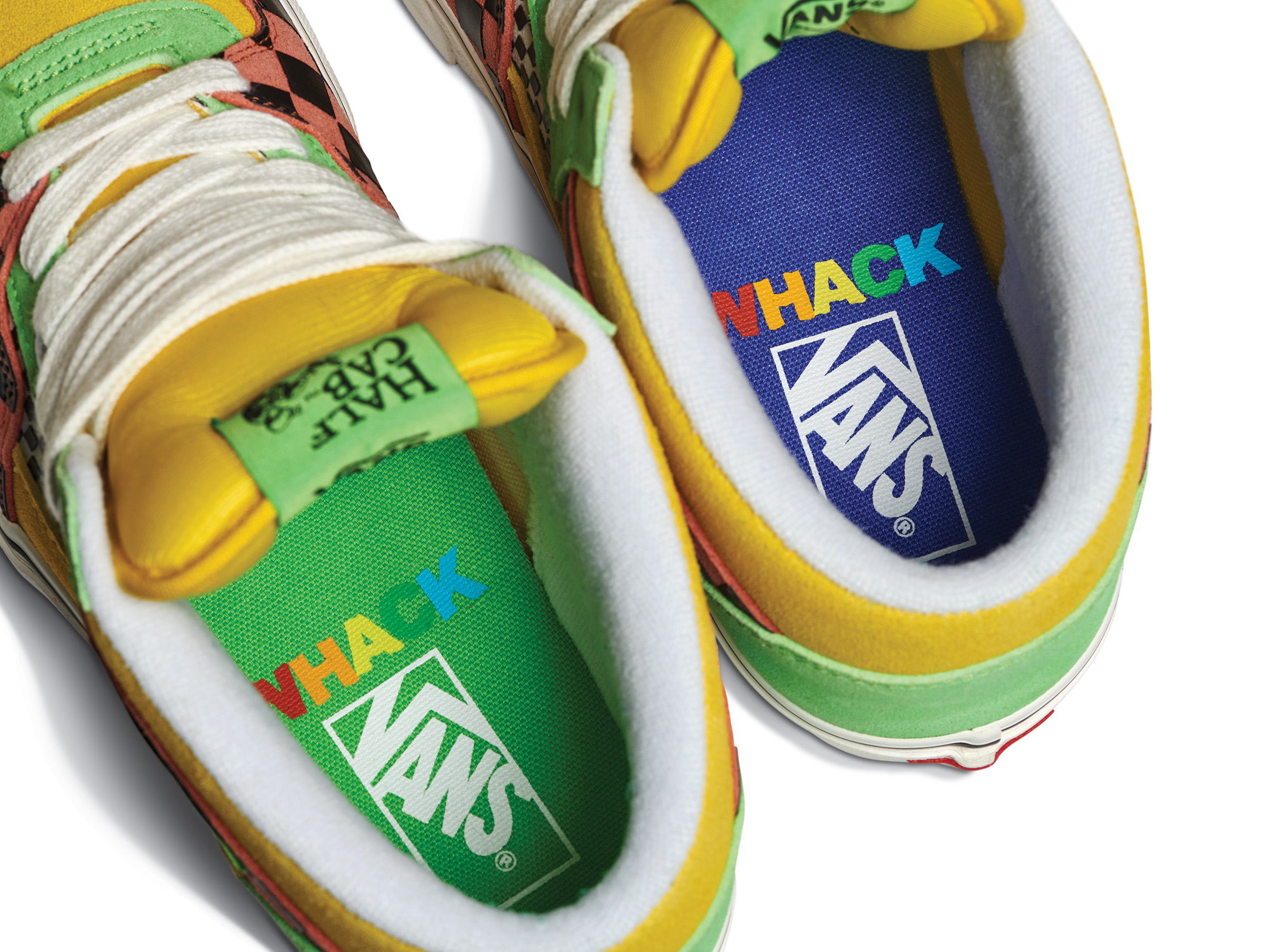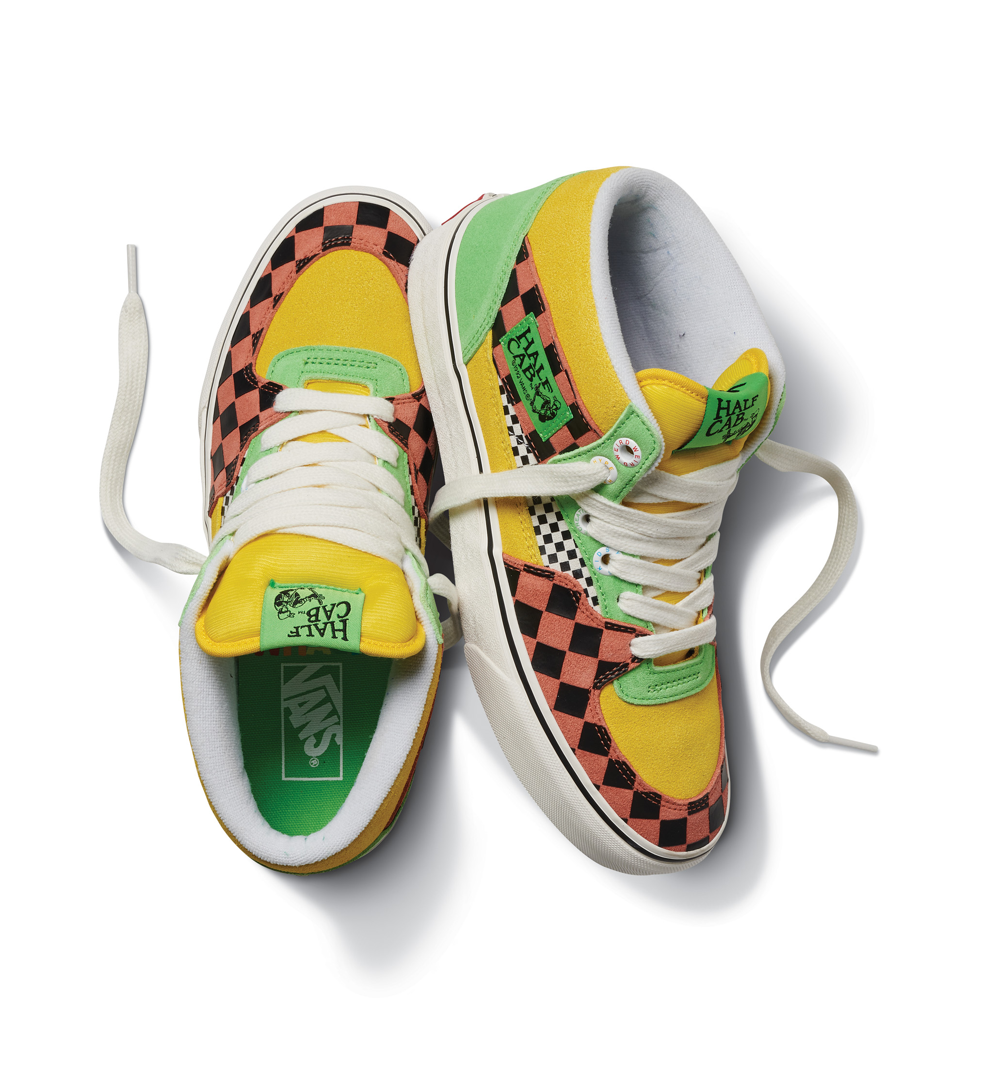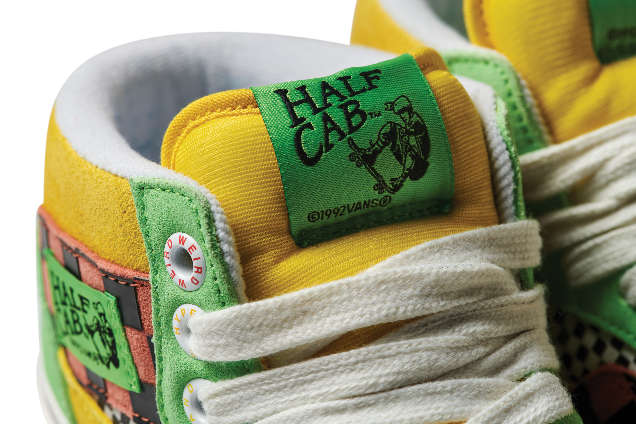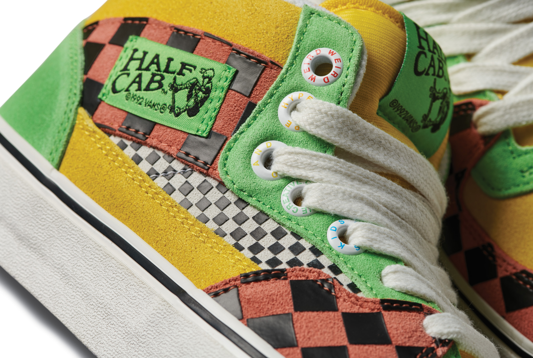 The Vans x Tierra Whack Half Cab provides Whack’s own spin on the Vans Classic, blending unexpected colorways and clashing Vans checkerboards in shades of yellow, green, red, black and white. Featuring a soft eco-suede upper and a rubberized checkerboard toe cap, the collection’s Half Cab comes complete with a secondary oversized green fuzzy lace and eyelets that read “Weird Hype And Creative Kids,” celebrating fans and followers of Tierra and her irreverent personal style. Contrasting left and right sockliners in blue and green decorate the insoles, while the tongue lining label features Whack’s signature in script, and a unique crystal bottom grass completes the style.