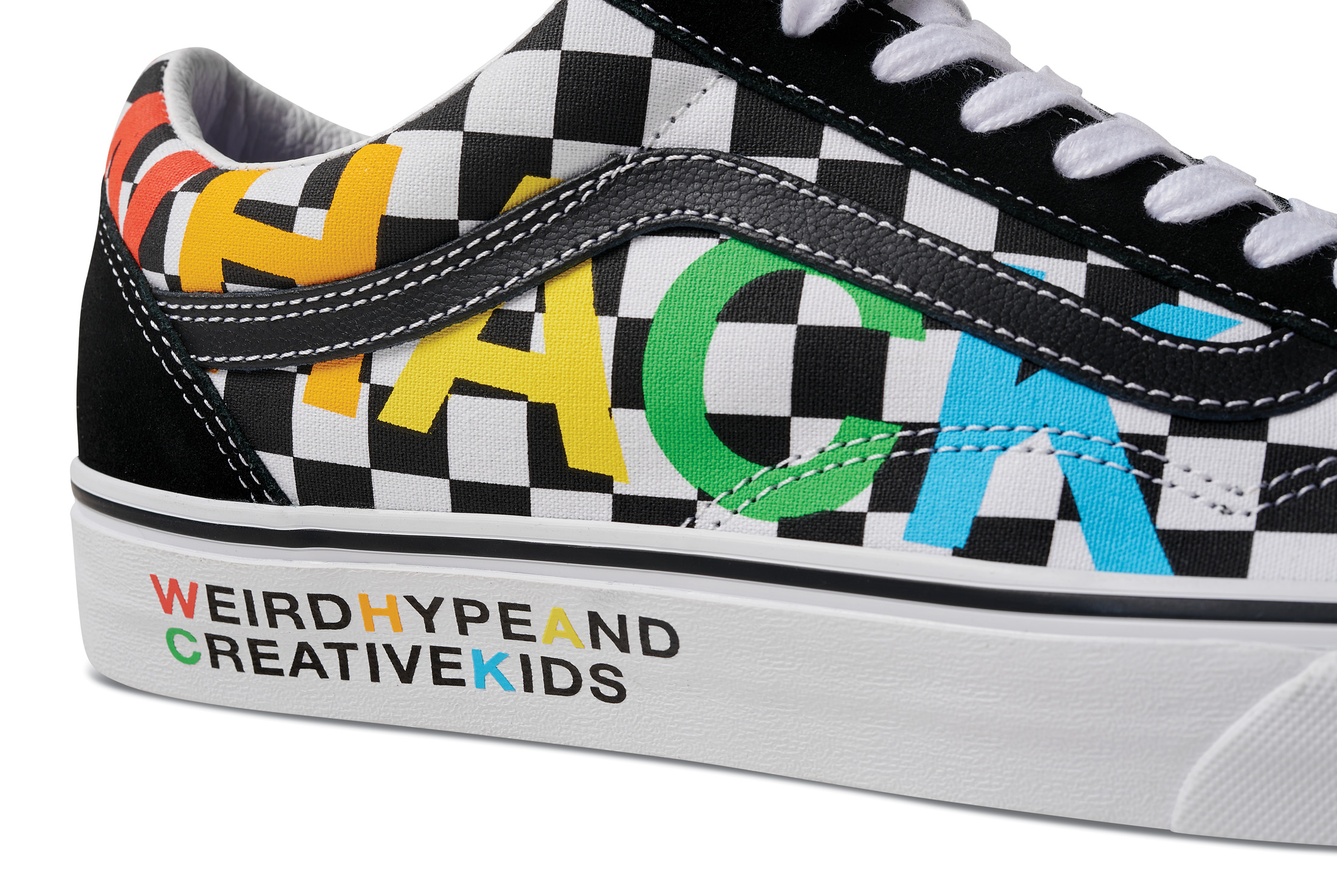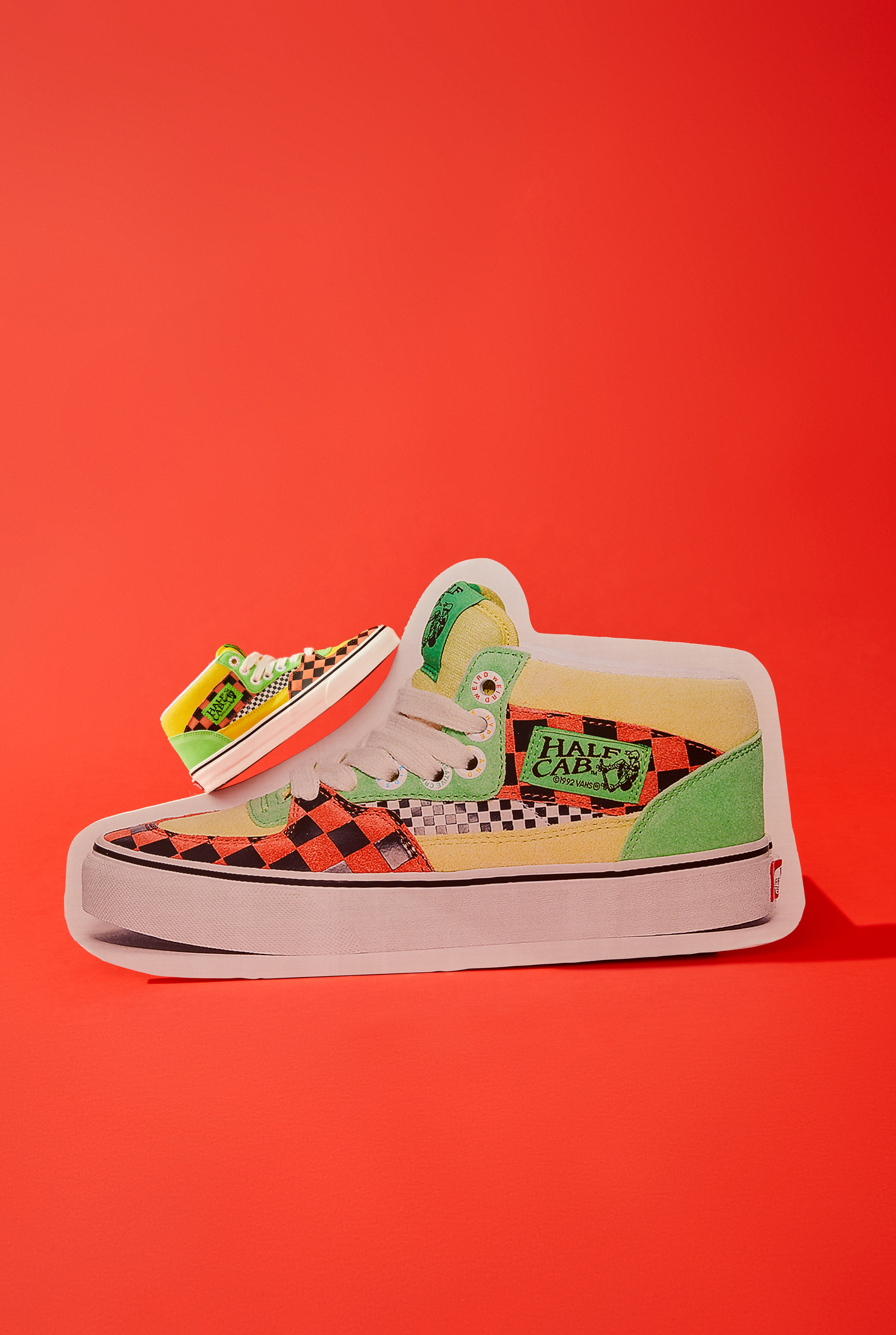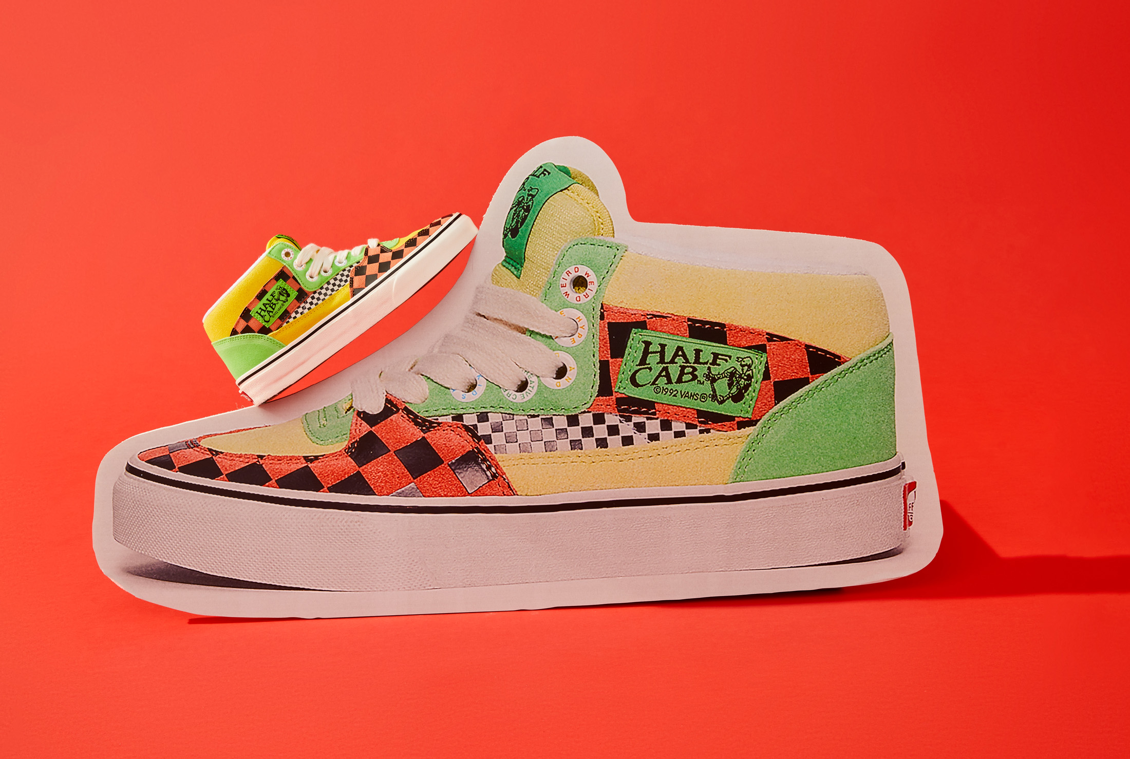 The Vans x Tierra Whack Half Cab provides Whack’s own spin on the Vans Classic, blending unexpected colorways and clashing Vans checkerboards in shades of yellow, green, red, black and white. Featuring a soft eco-suede upper and a rubberized checkerboard toe cap, the collection’s Half Cab comes complete with a secondary oversized green fuzzy lace and eyelets that read “Weird Hype And Creative Kids,” celebrating fans and followers of Tierra and her irreverent personal style. Contrasting left and right sockliners in blue and green decorate the insoles, while the tongue lining label features Whack’s signature in script, and a unique crystal bottom grass completes the style.