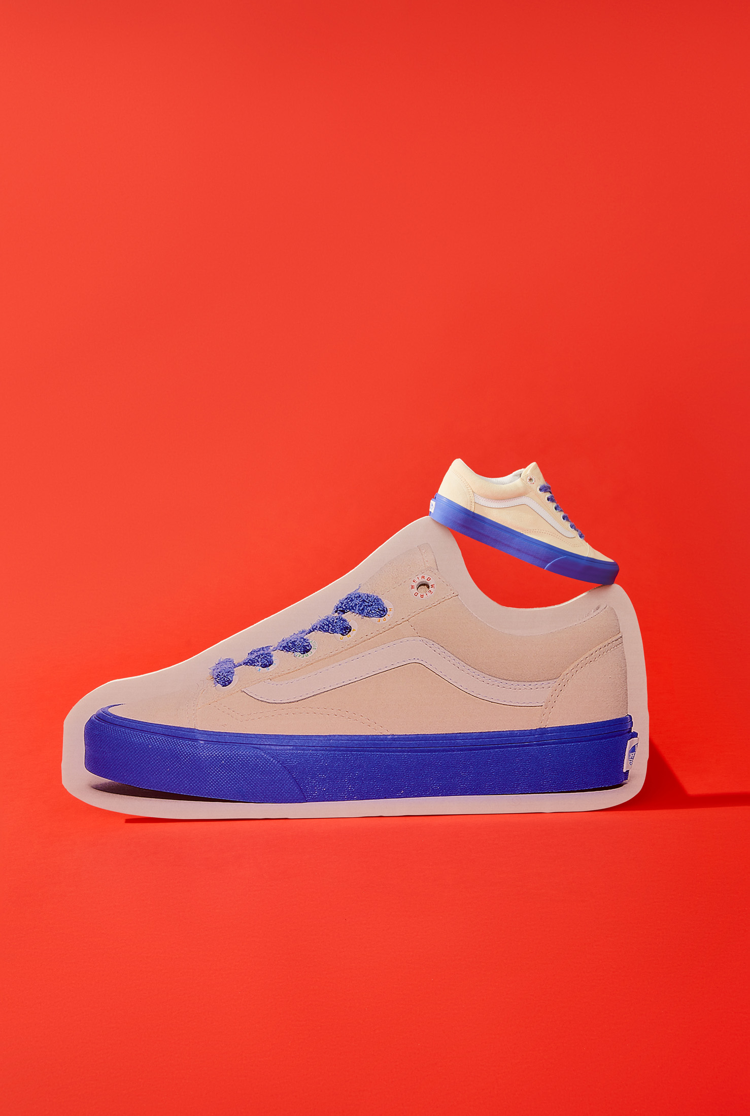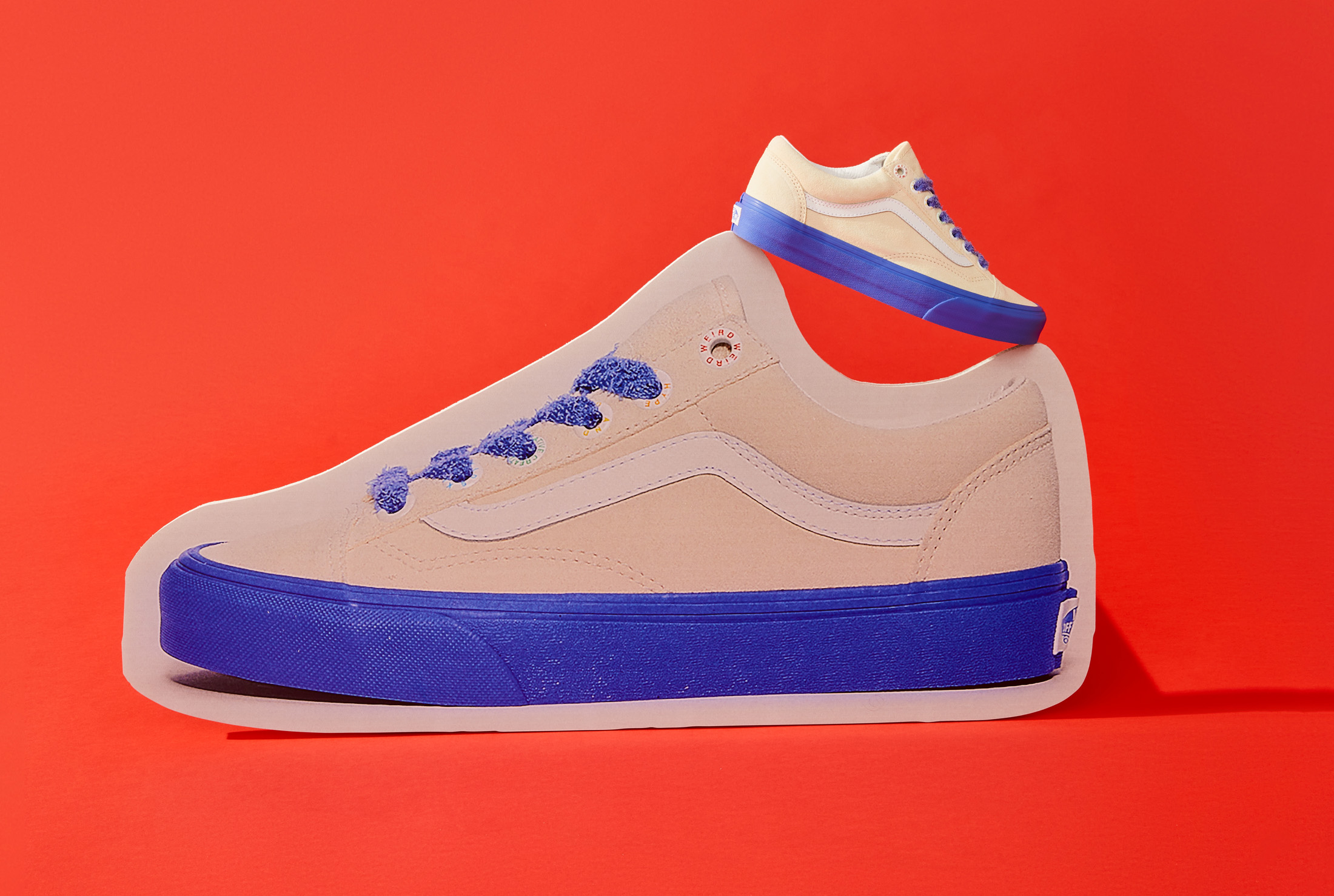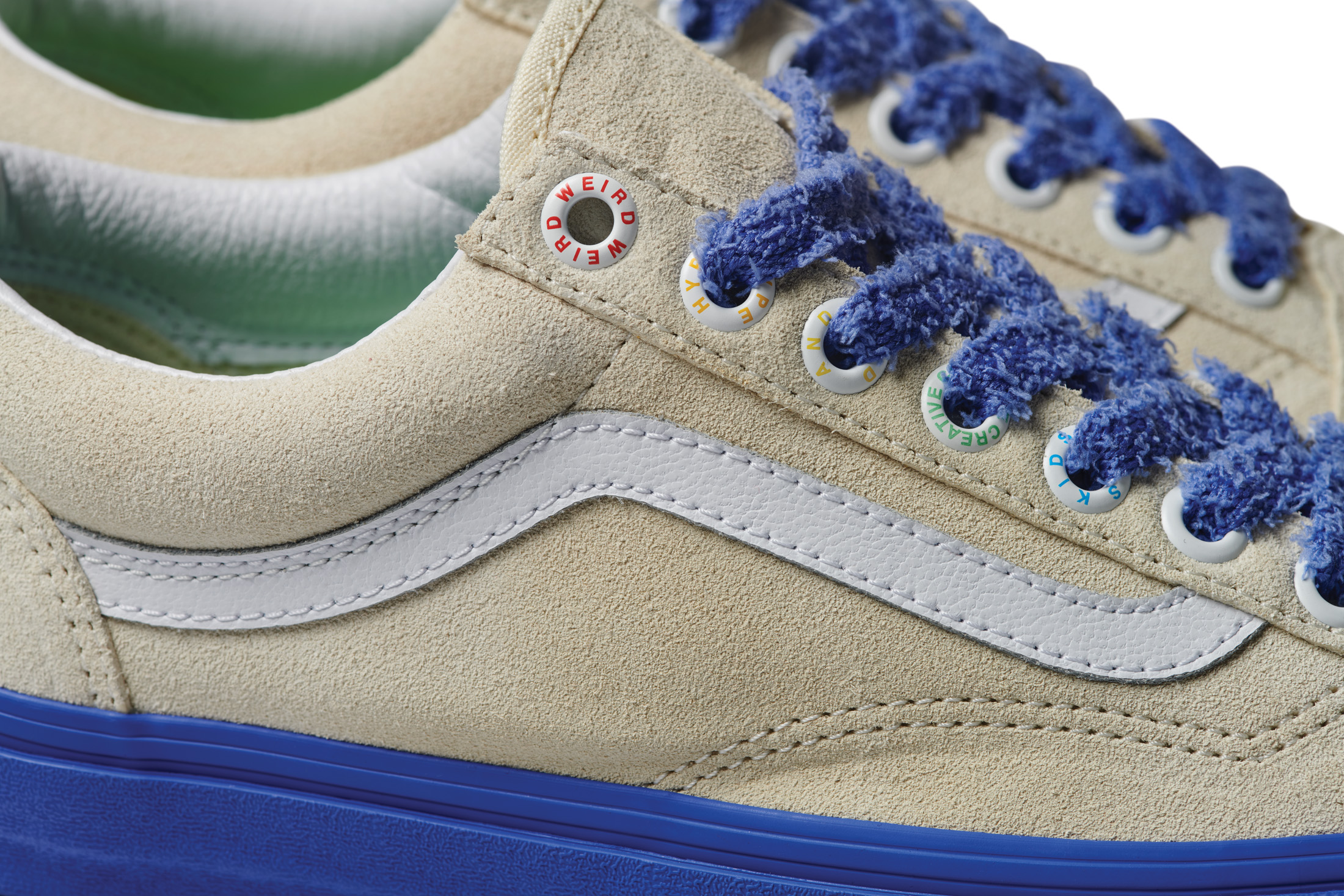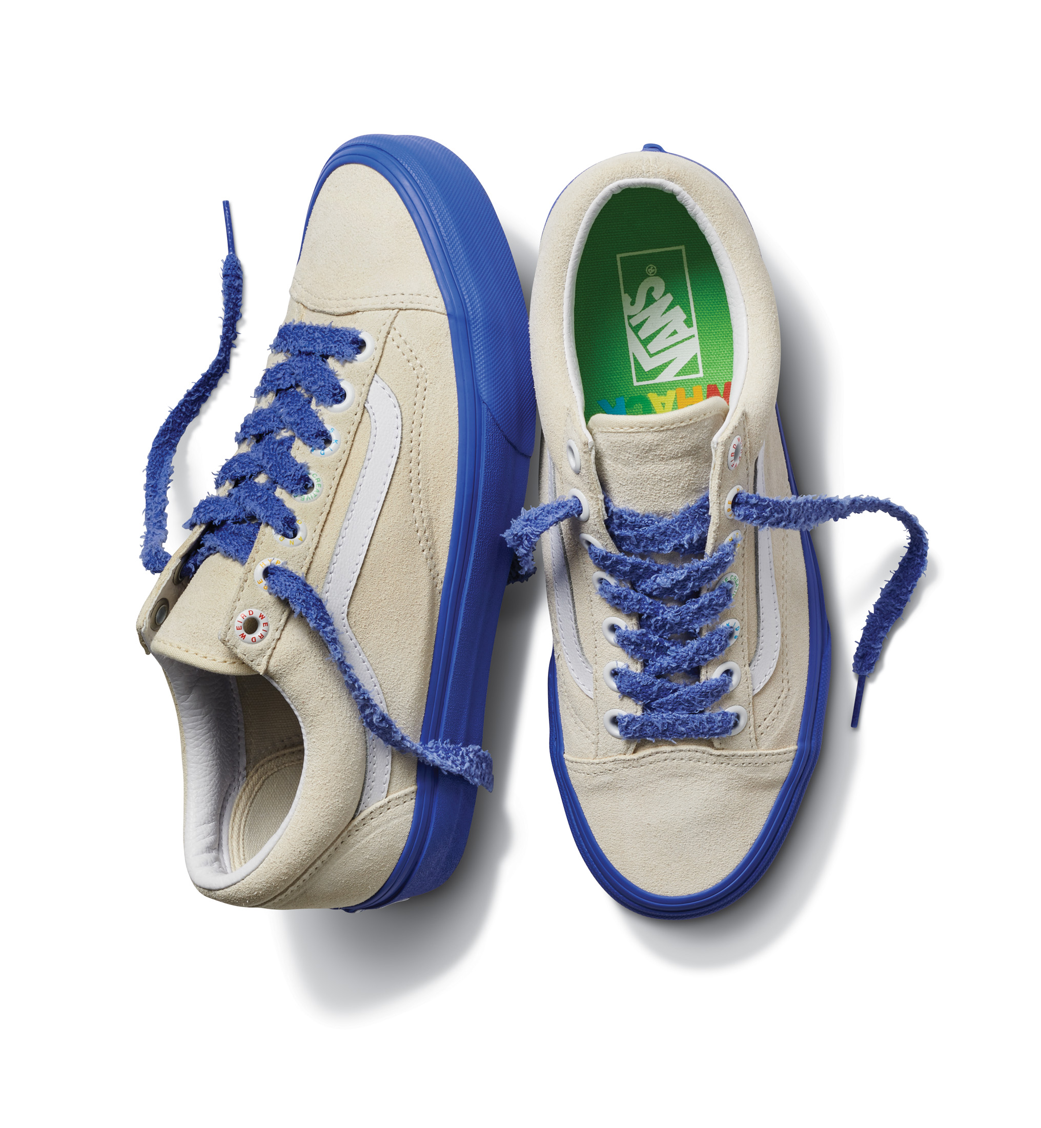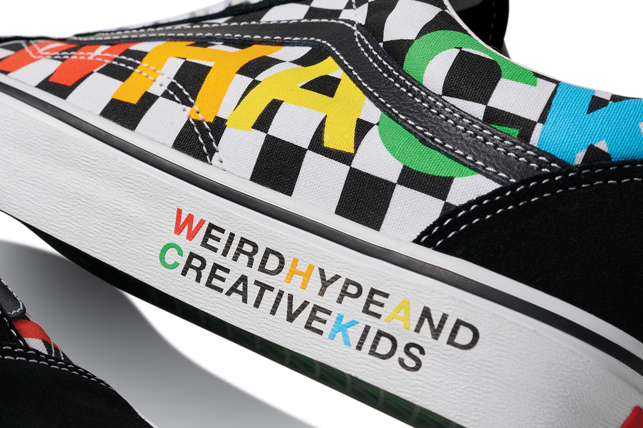 The Vans x Tierra Whack Half Cab provides Whack’s own spin on the Vans Classic, blending unexpected colorways and clashing Vans checkerboards in shades of yellow, green, red, black and white. Featuring a soft eco-suede upper and a rubberized checkerboard toe cap, the collection’s Half Cab comes complete with a secondary oversized green fuzzy lace and eyelets that read “Weird Hype And Creative Kids,” celebrating fans and followers of Tierra and her irreverent personal style. Contrasting left and right sockliners in blue and green decorate the insoles, while the tongue lining label features Whack’s signature in script, and a unique crystal bottom grass completes the style.