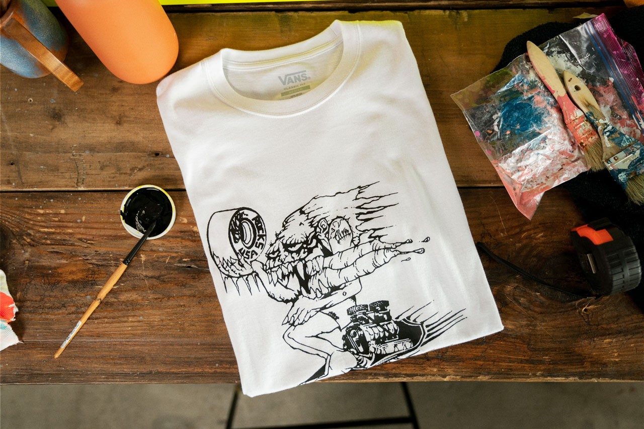 Rounding out the range, the collaboration offers up an Alva Skates crew fleece with fiery graphics, the OTW T-shirt doused in black-and-white illustrations, loose tapered cargo pants and a bucket hat decorated with Vans and Alva Skates pins.”