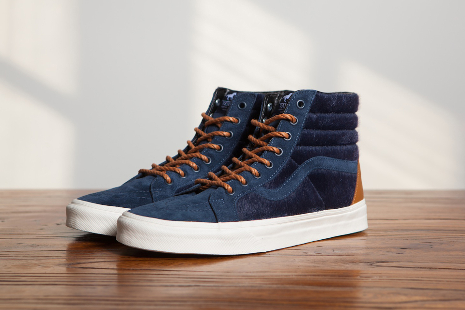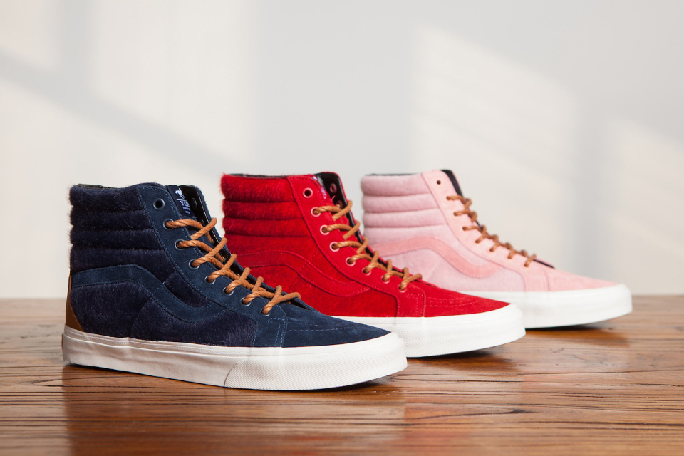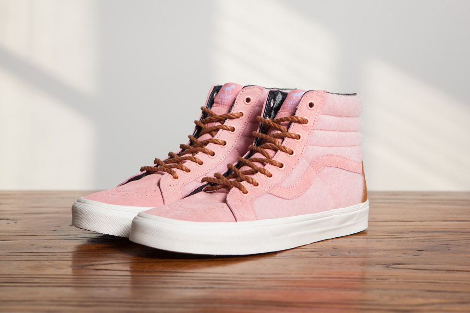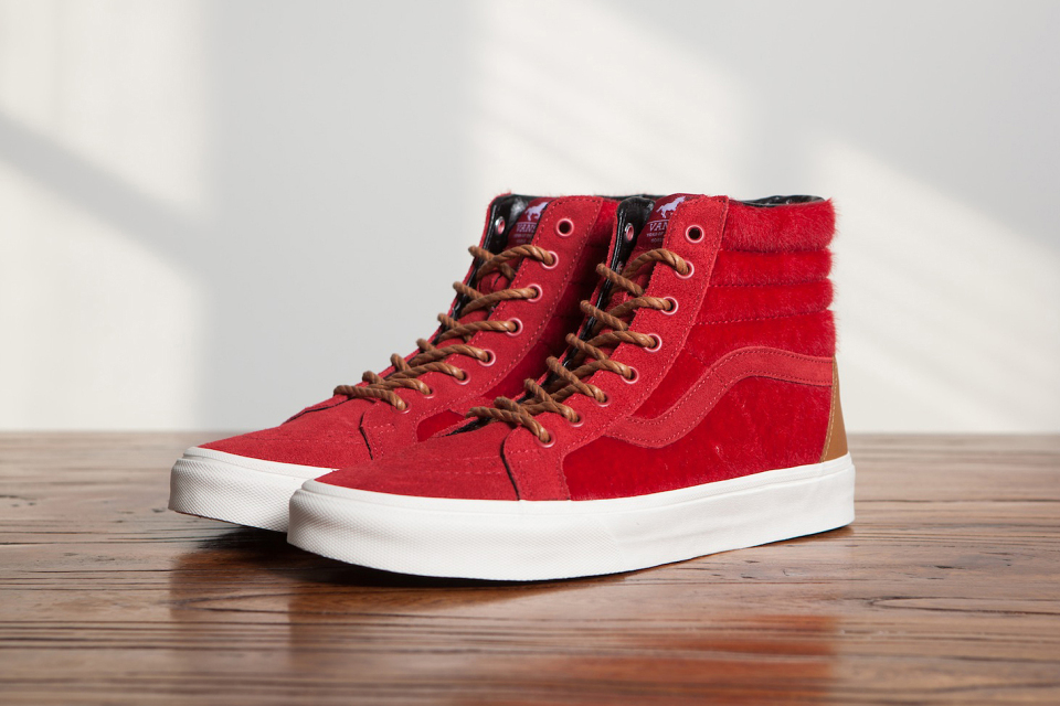“Vans will be releasing a four-piece capsule collection for the coming Chinese New Year composed of the original Sk8-Hi silhouette with iconic Sidestripe branding. The “Year of the Horse” pack is offered in red, blue and pink colorways, as well as a limited black edition. Further details include faux horse hair, leather heel counter and horseshoe print on the waffle sole. The Vans Sk8-Hi Reissue 2014 “Year of the Horse” pack will be releasing in China on December 20, with the limited black version hitting select accounts on January 1, 2014.”