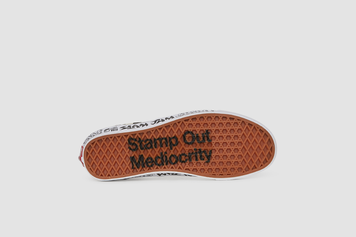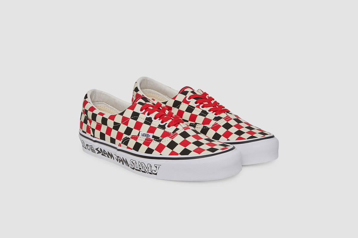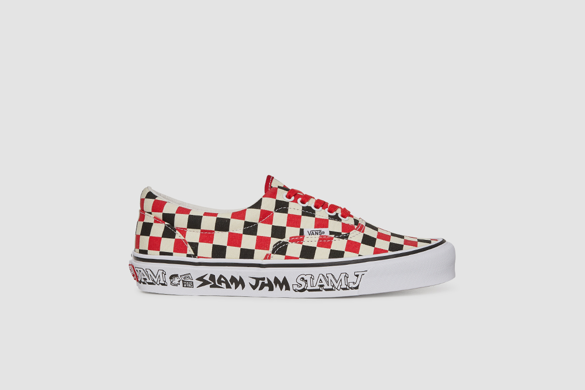 Slam Jam has had a few Vault collabs, and the OG Era LX they went with this time, is straight out of the 80’s. Going with that BMX-pack feel, we get a white, red, and black checkerboard print, with some custom Slam Jam logotypes printed on the sidewalls, designed by Fergus Purcell aka “Fergadelic”. There is also a hidden message printed on the gum waffle sole, that reads “Stamp Out Mediocrity”. These are definitely not mediocre!