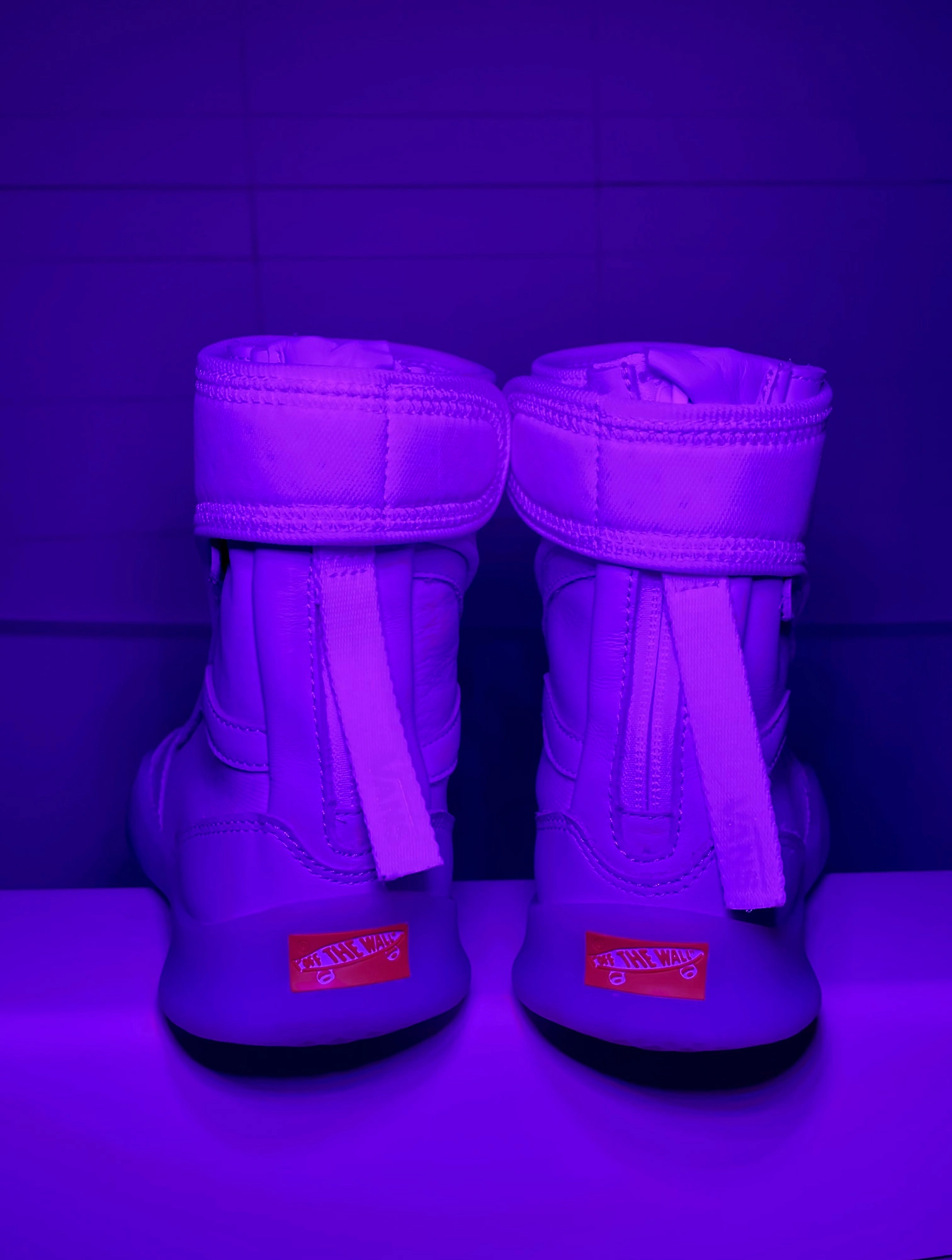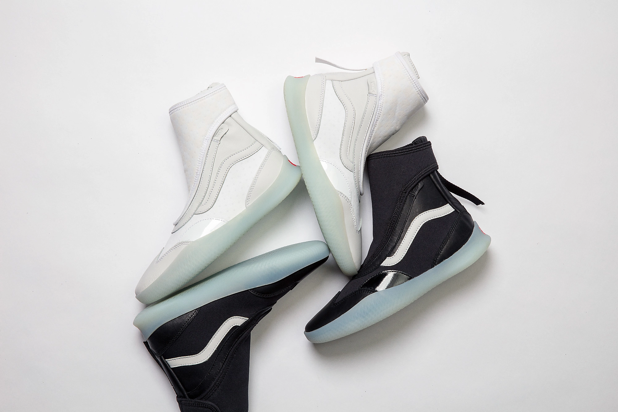 The Boot Skoot LX features neoprene uppers as a nod to the brands performance-driven surf boot. The hi-top is crafted with premium leather and rubber overlays for added structure, durability and elevated design detail. A unique parametric waffle sole makes it city-ready, while a combination Velcro and zip closure allows for easy wear. Available in two colorways including black with a white leather Sidestripe that draws parallels back to Vans’ owning iconic Sk8-Hi as well as a true white iteration that is finished with perforated details for breathability and a translucent waffle sole.