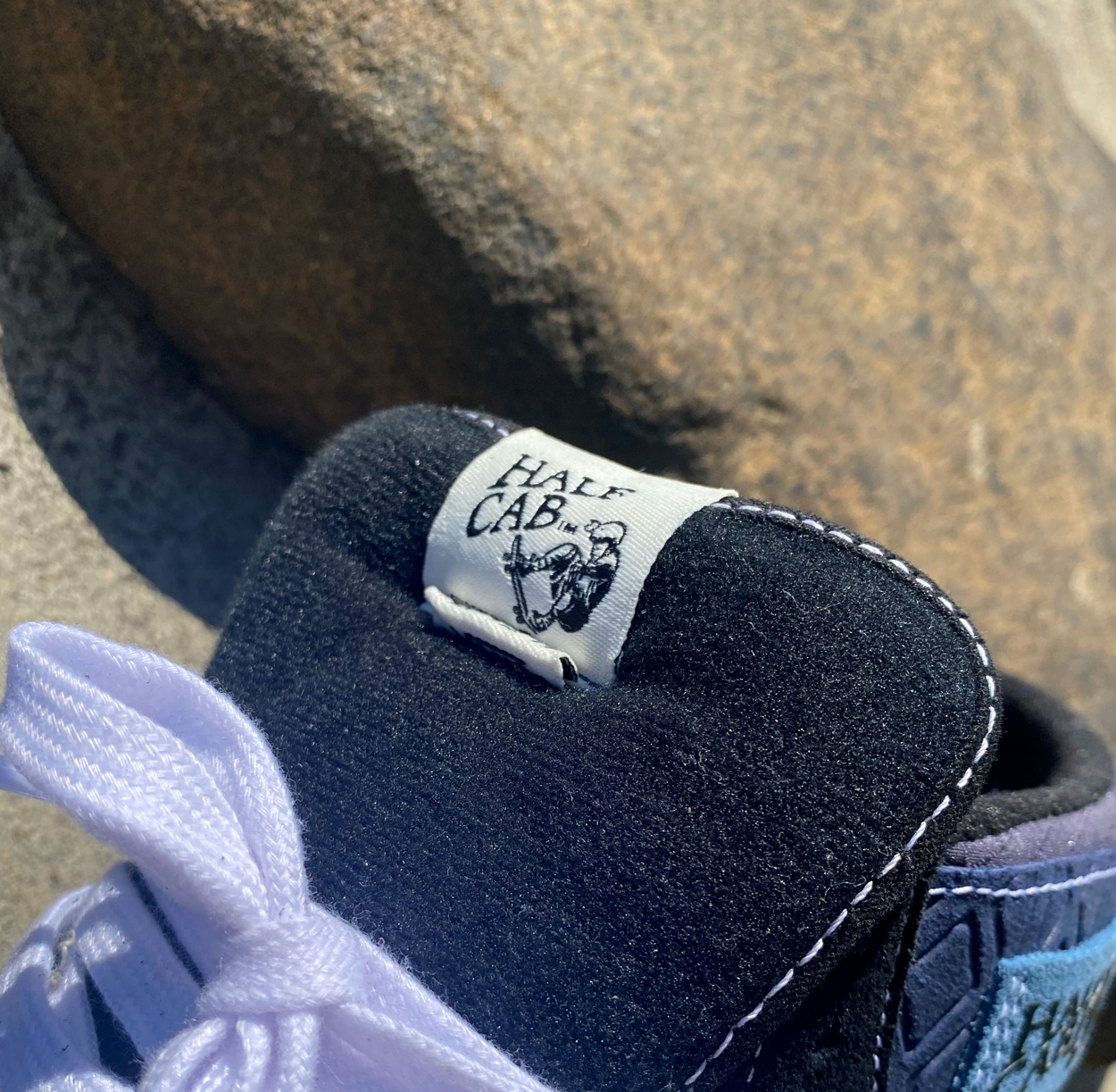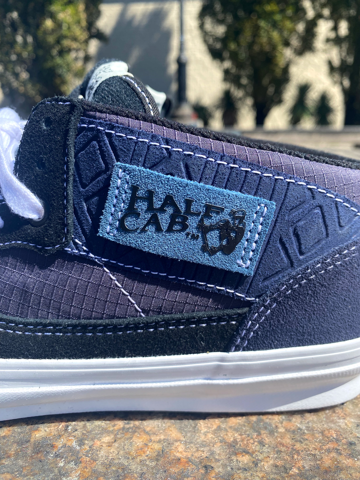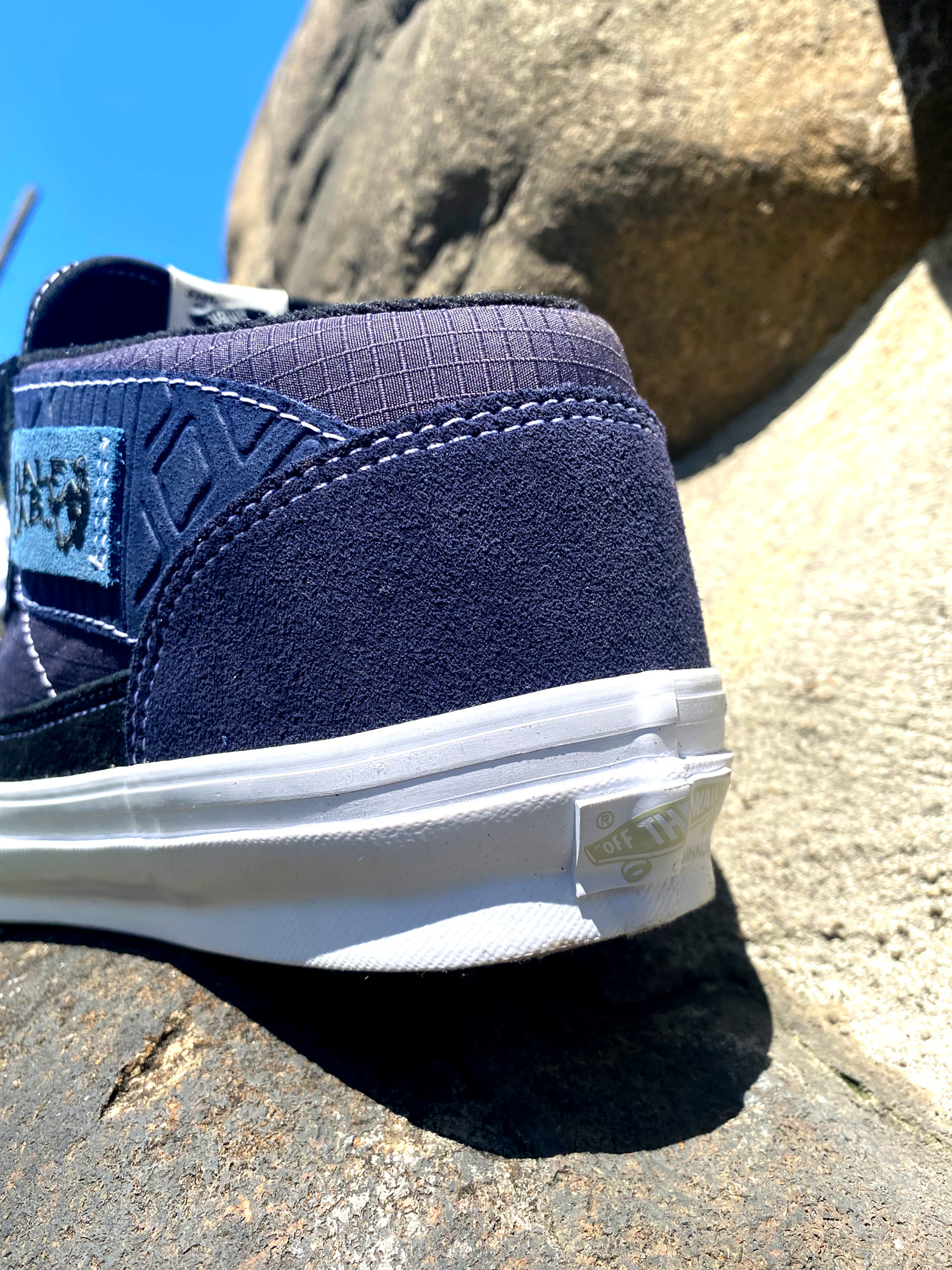 “Function came first with most of what we changed being “under the hood.” So much work went into getting the silhouette right that our main focus became making three highly wearable colorways that any skater, whether they know us or not, would be psyched to skate. That said, there are a few subtle touches that quietly tie them back to us. The usual woven “Half Cab” patch on the side was swapped for one made from indigo suede, as natural indigo is a key element of our collection and integral to traditional Indian manufacturing. The suede panel behind that label is debossed with an intricate textile pattern that comes from the handwoven garment we are most known for – our Gorecki cargo pant. Jimmy Gorecki is actually the person that linked us with Vans in the first place so we thought that was a nice, low-key tribute. The less abrasion-prone panels below that are cotton ripstop, because that’s the fabric I’ve probably skated in most throughout my life. We flipped the OG Van Doren typeface to say EAST and added that on a small loop label just below the main tongue label and ran a dedication to the people that initially sparked me on skating on the back side of the tongue”.
