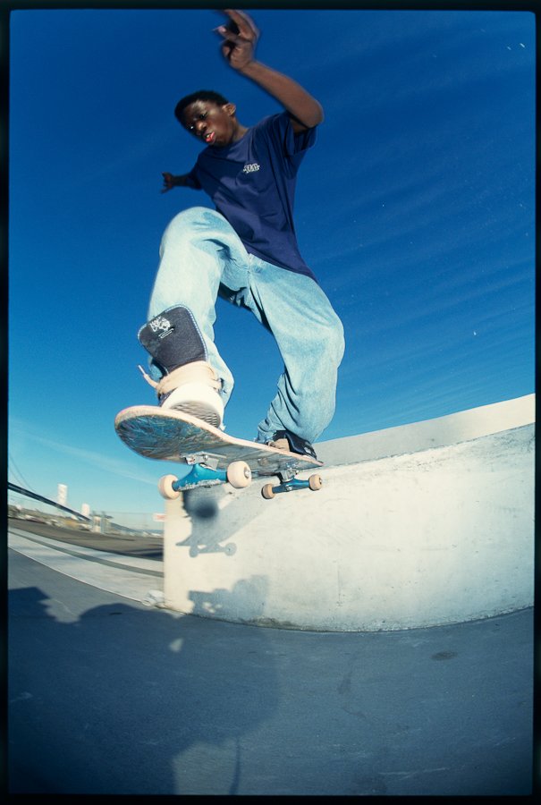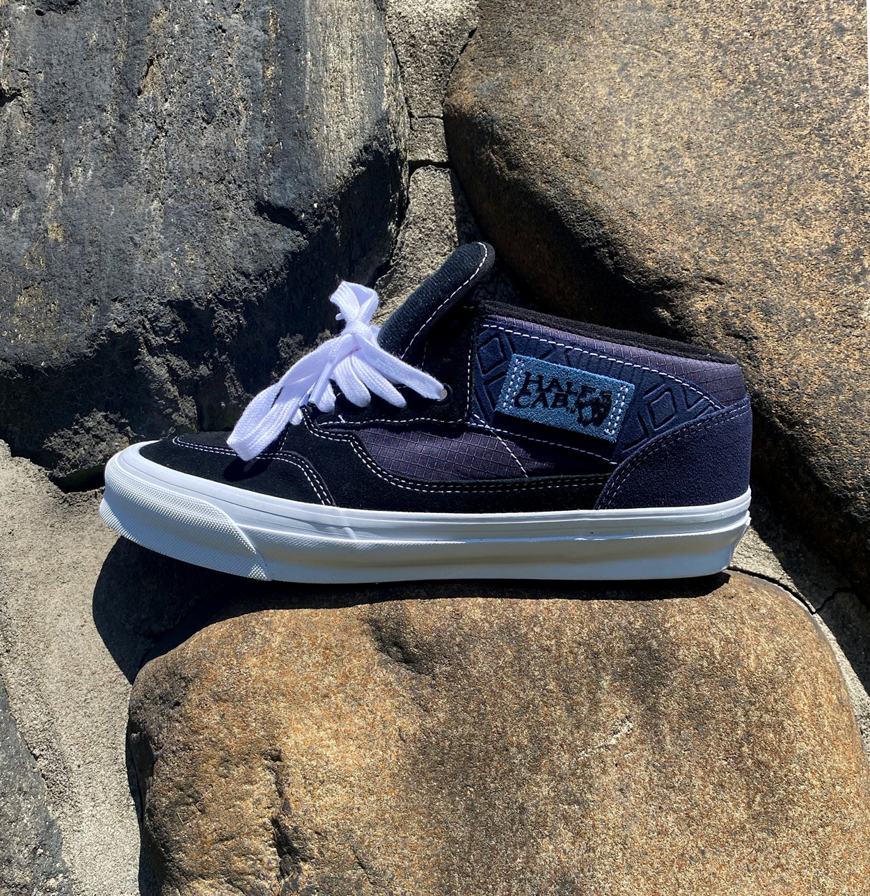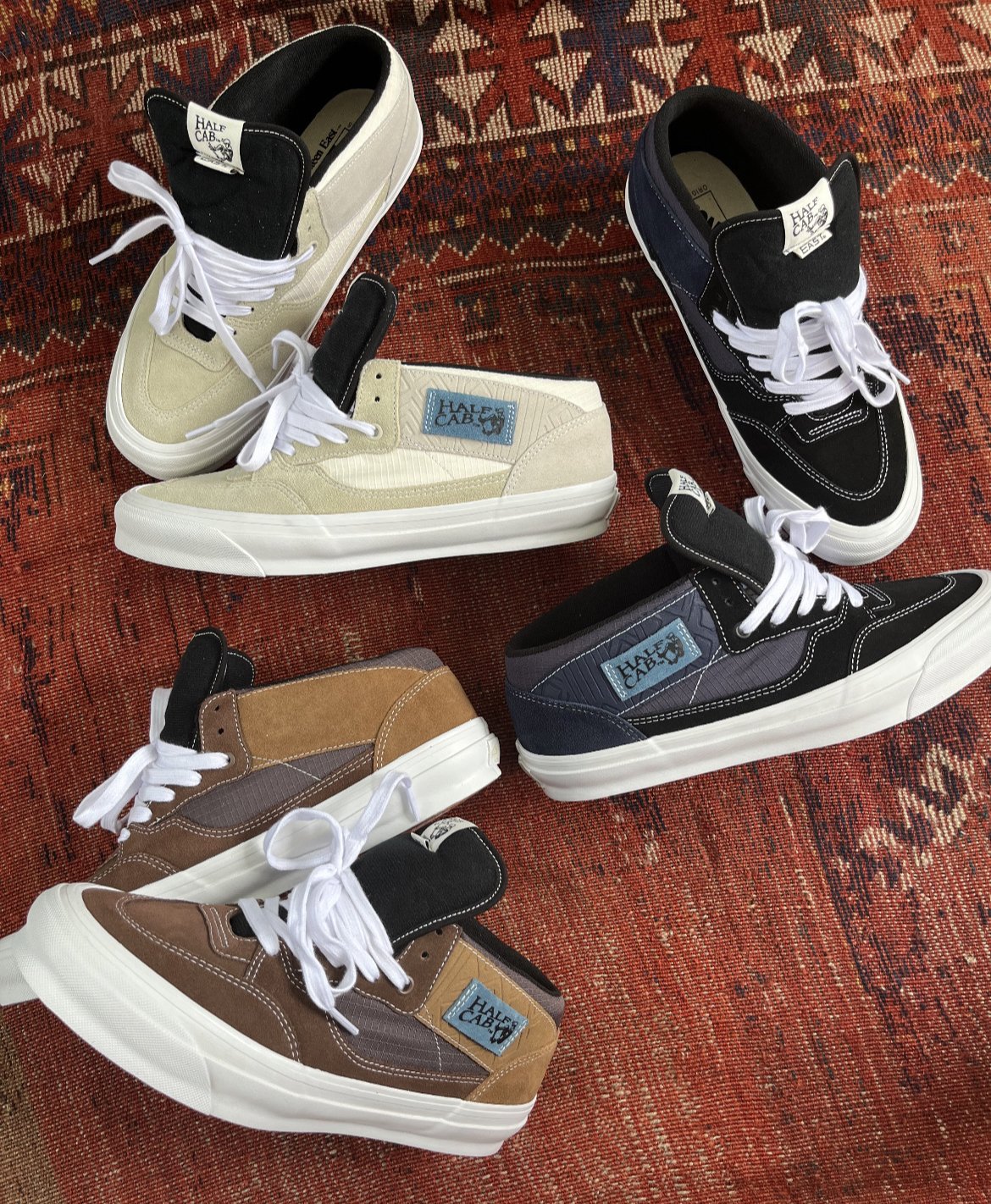 “Function came first with most of what we changed being “under the hood.” So much work went into getting the silhouette right that our main focus became making three highly wearable colorways that any skater, whether they know us or not, would be psyched to skate. That said, there are a few subtle touches that quietly tie them back to us. The usual woven “Half Cab” patch on the side was swapped for one made from indigo suede, as natural indigo is a key element of our collection and integral to traditional Indian manufacturing. The suede panel behind that label is debossed with an intricate textile pattern that comes from the handwoven garment we are most known for – our Gorecki cargo pant. Jimmy Gorecki is actually the person that linked us with Vans in the first place so we thought that was a nice, low-key tribute. The less abrasion-prone panels below that are cotton ripstop, because that’s the fabric I’ve probably skated in most throughout my life. We flipped the OG Van Doren typeface to say EAST and added that on a small loop label just below the main tongue label and ran a dedication to the people that initially sparked me on skating on the back side of the tongue”.