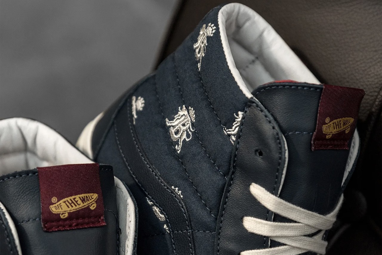 Baracuta’s Vans Vault Sk8-Hi Pocket LX-1 gets its name from the addition of pockets on the lateral side. The pocket, and much of the shoe, is crafted from smooth “Dress Blues” leather and suede, while the lateral panel is covered in the red-toned tartan plaid print. A leather Jazz stripe cuts through the tartan, while the medial sports a full suede side in “Dress Blues” covered in Baracuta’s signature motif which has been embroidered in a repeat pattern.
