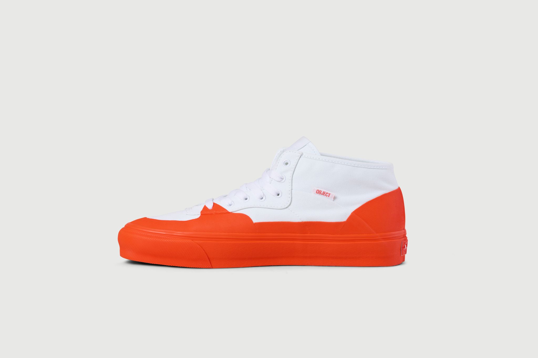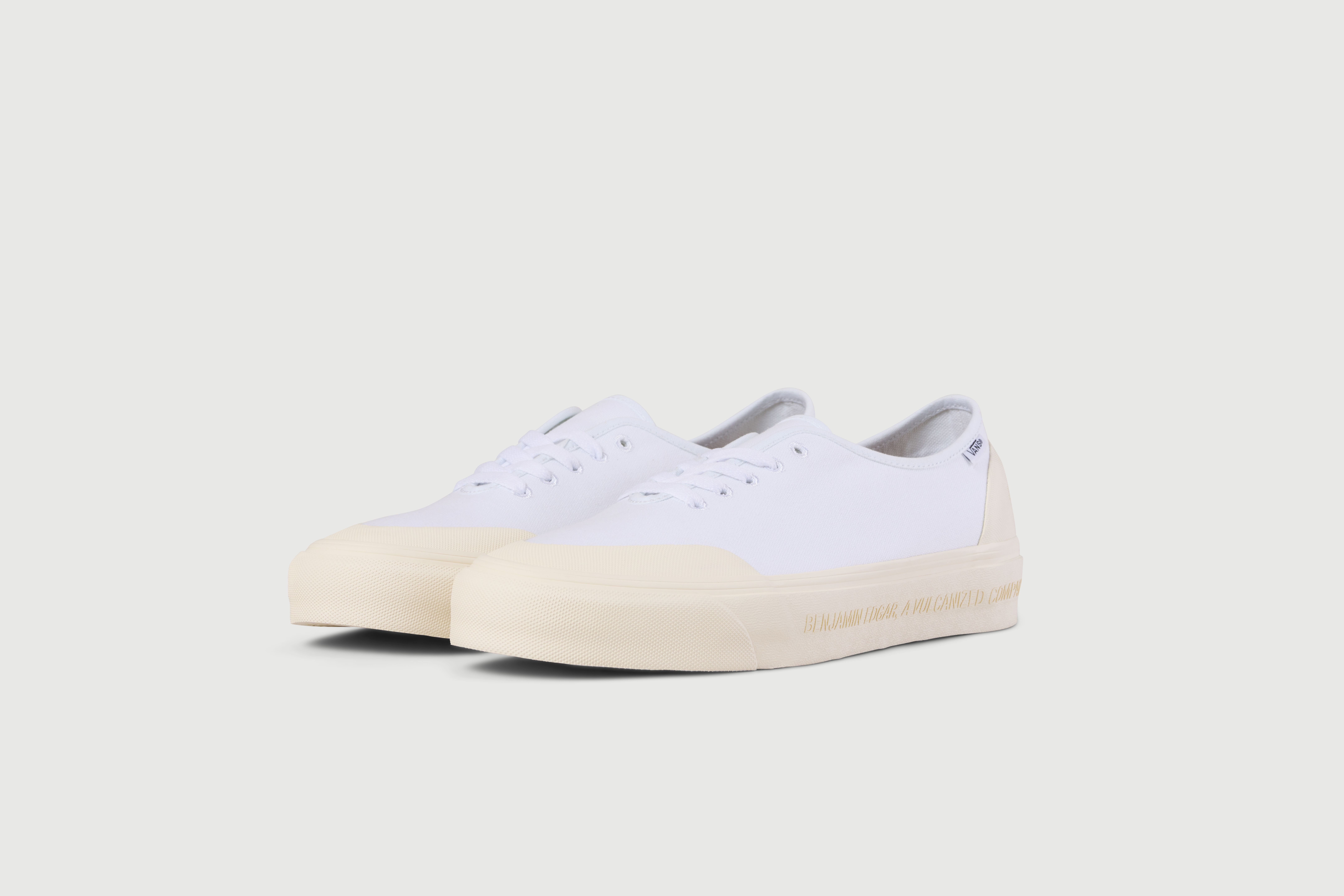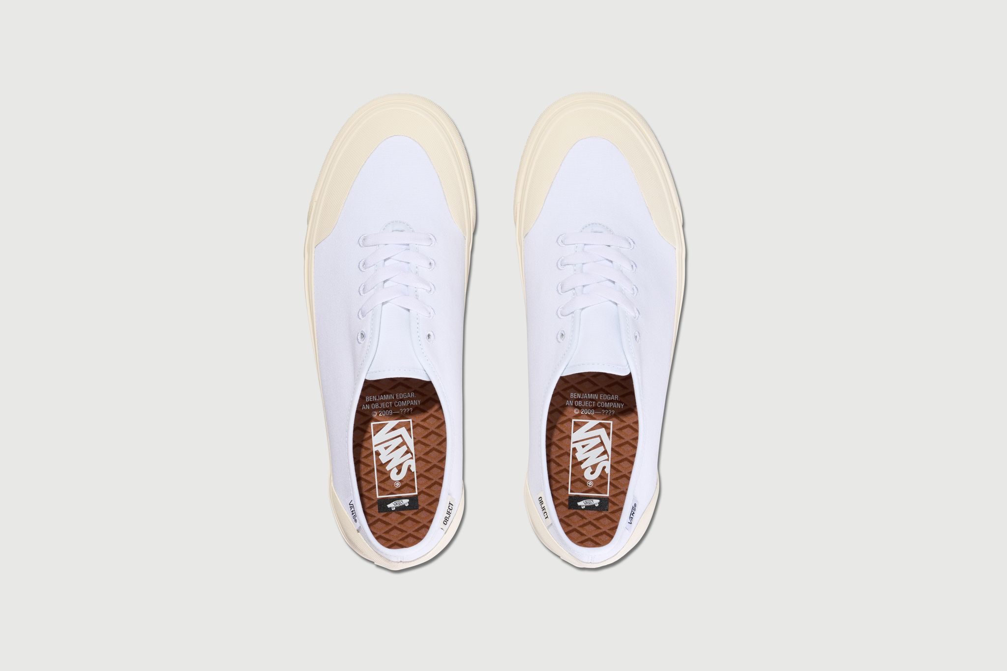 Beginning with the Half Cab, colorways of “White/Safety Orange” and “White/White” are offered, allowing for either a striking or subtle look. Its deconstructed composition removes the upper’s padding and replaces its lower panels with the aforementioned vulcanization. As for the Authentic, a “White/Bone” colorway sees the sneaker in a minimalistic yet conceptual look that utilizes a single piece upper. Similar to the Half Cab pairs, its heel panel and toe box feature the exaggerated “knurled rubber.” Co-branding elements throughout the range include “BENJAMIN EDGAR, A VULCANIZED COMPANY” text at the lateral’s midsole and an “OBJECT” tag at the medial.