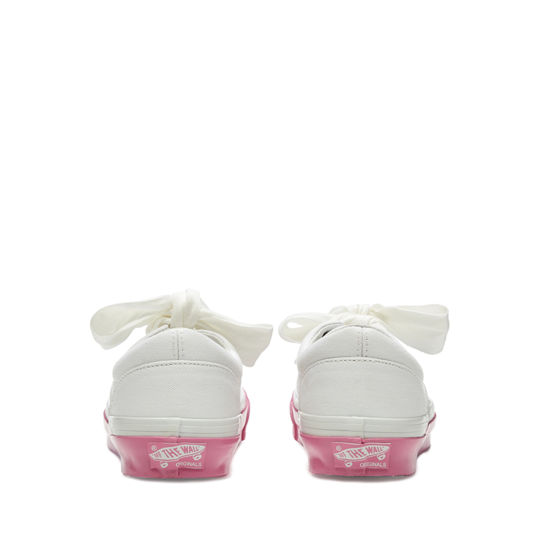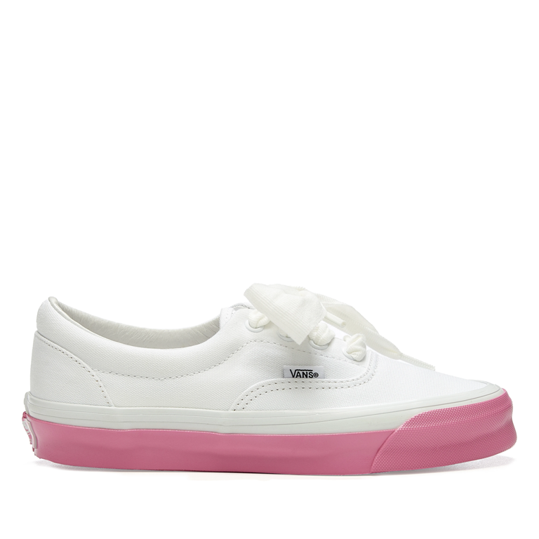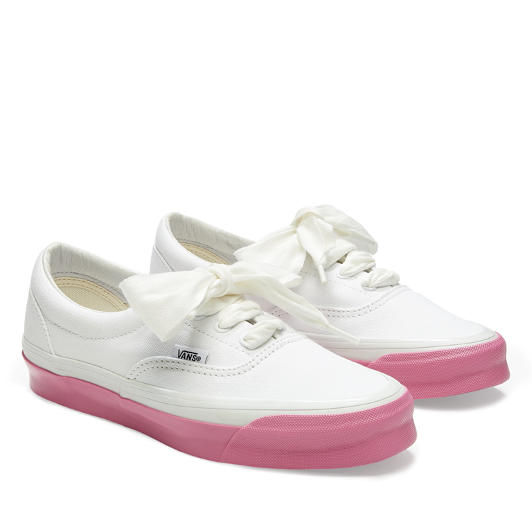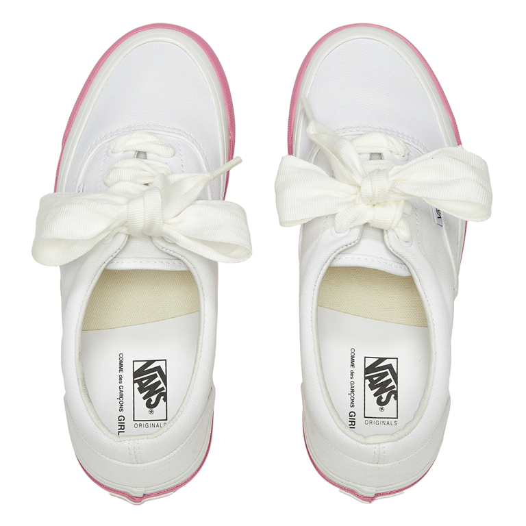Here’s a little something that we stumbled across, that the ladies should be pretty excited about. Vault by Vans has gotten with CDG Girl, and created this OG Era LX, featuring an exaggerated laced-up ribbon, sitting on top of a primarily white canvas, with distinct half white and half pink colored side walls and toe-bumper. The color blocking makes for a unique silhouette that is sure to stand out.