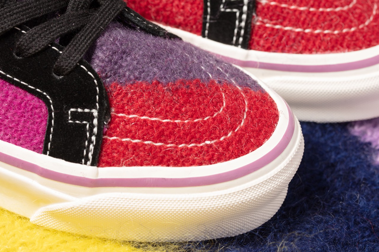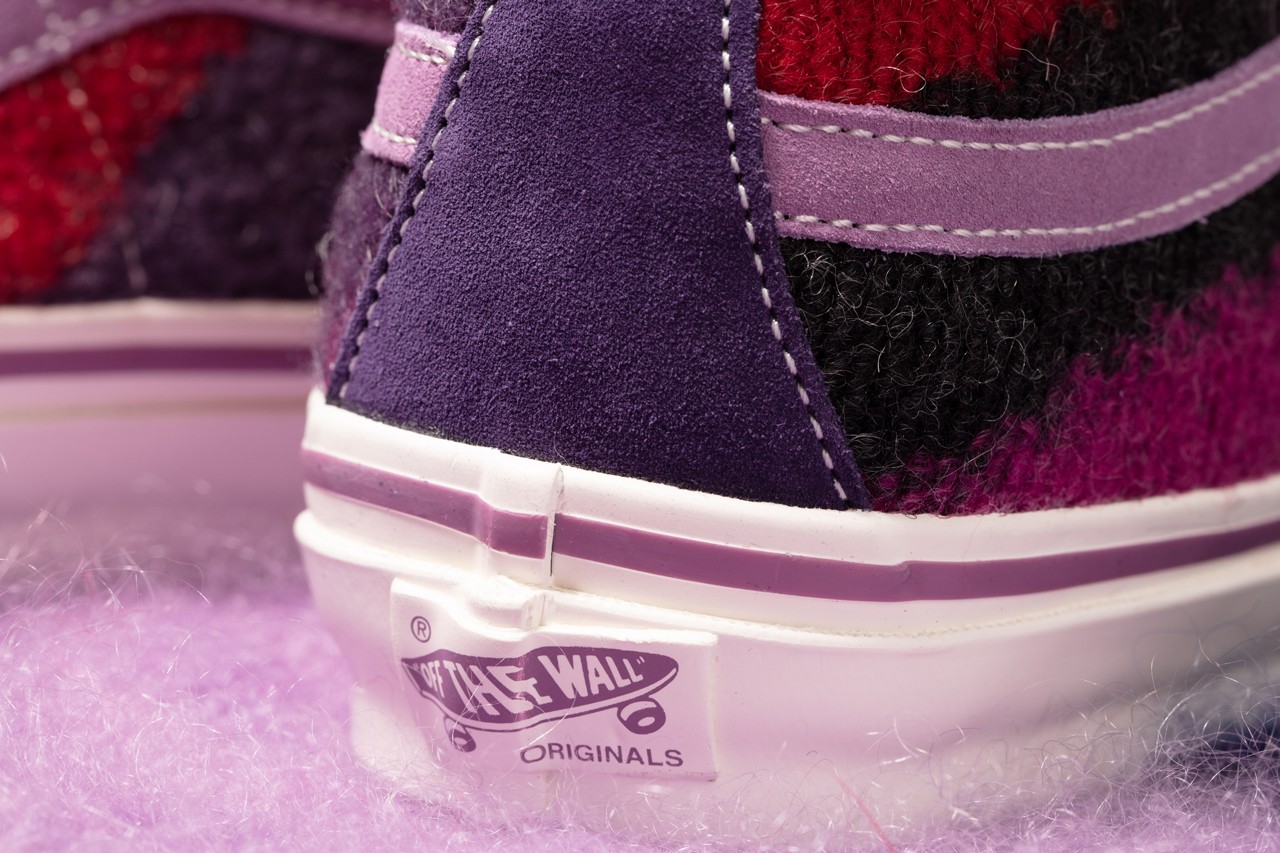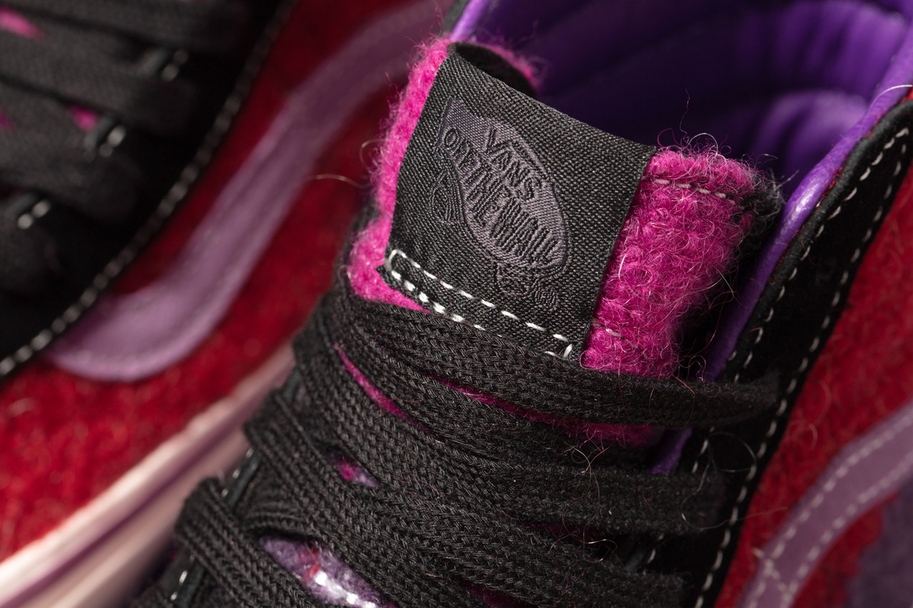 Shaggy mohair covers the entirety of each upper, but is applied in divergent fashion. The Sk8-Hi uses pink, purple and red for a colorful look, while the Slip-On is swathed in punk-approved black and white stripes. Each features special branded tags, and the Sk8-Hi is finalized by simple white midsoles and Jazz Stripes. Meanwhile, the Slip-On goes for high-gloss black midsoles and special striped detailing that matches the upper under its translucent outsole. Both shoes are accompanied by special apparel, namely an “Up Yours” tee and a crewneck sweatshirt”.