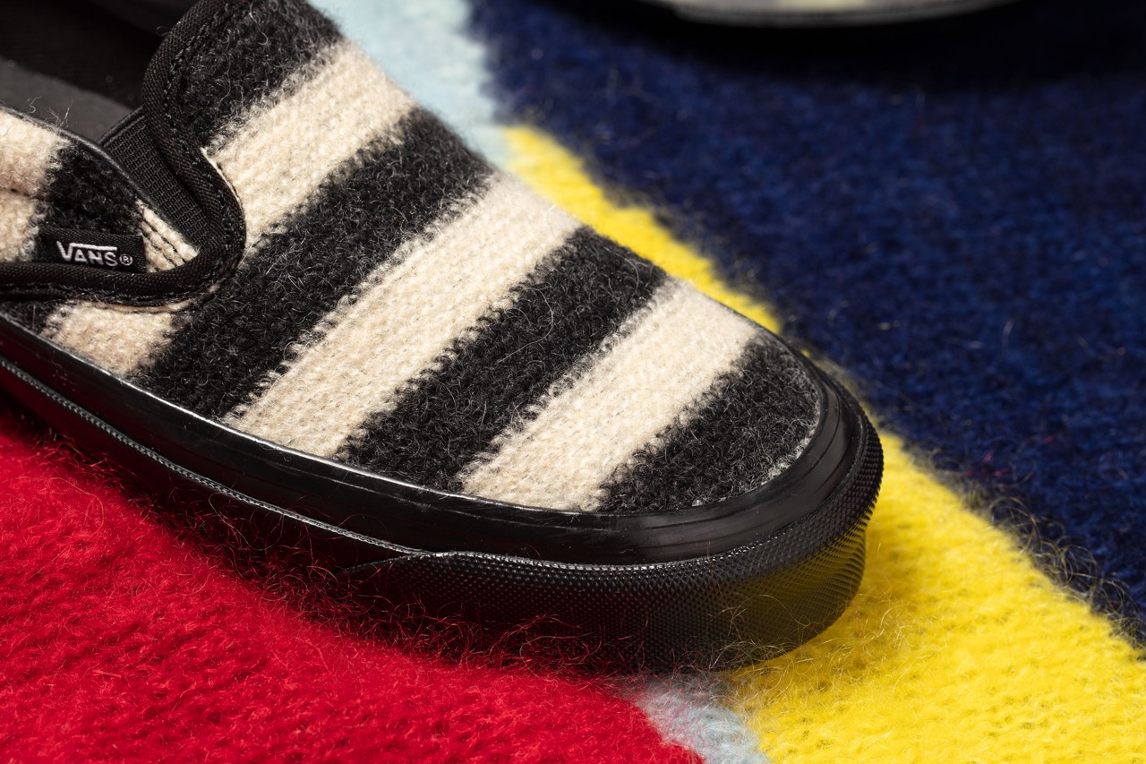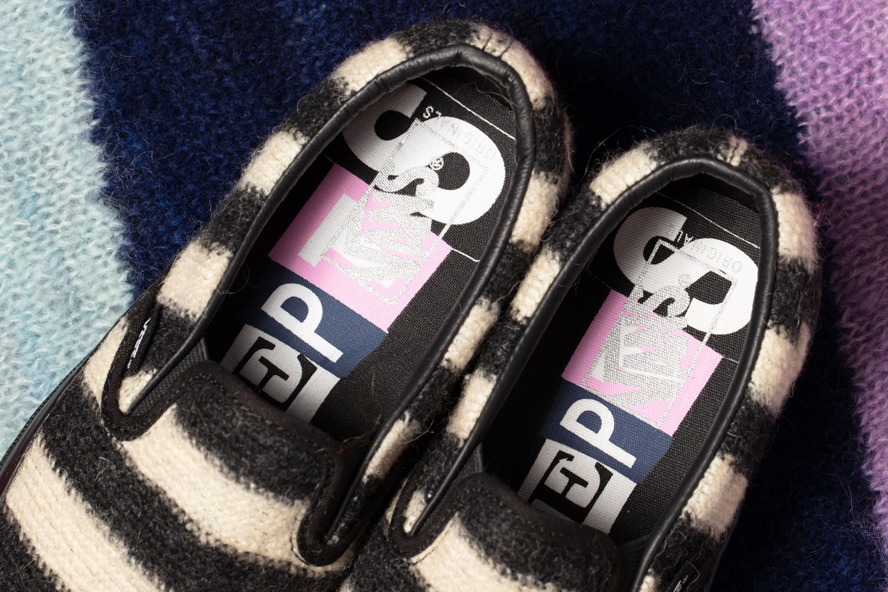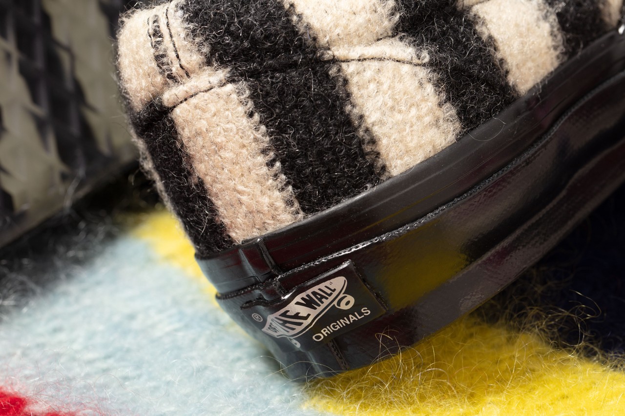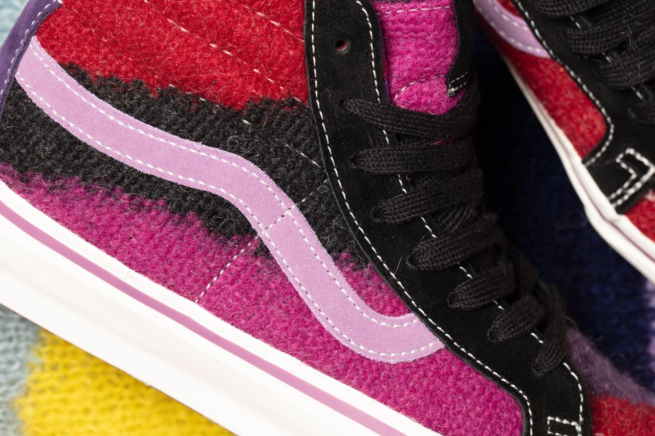 Shaggy mohair covers the entirety of each upper, but is applied in divergent fashion. The Sk8-Hi uses pink, purple and red for a colorful look, while the Slip-On is swathed in punk-approved black and white stripes. Each features special branded tags, and the Sk8-Hi is finalized by simple white midsoles and Jazz Stripes. Meanwhile, the Slip-On goes for high-gloss black midsoles and special striped detailing that matches the upper under its translucent outsole. Both shoes are accompanied by special apparel, namely an “Up Yours” tee and a crewneck sweatshirt”.